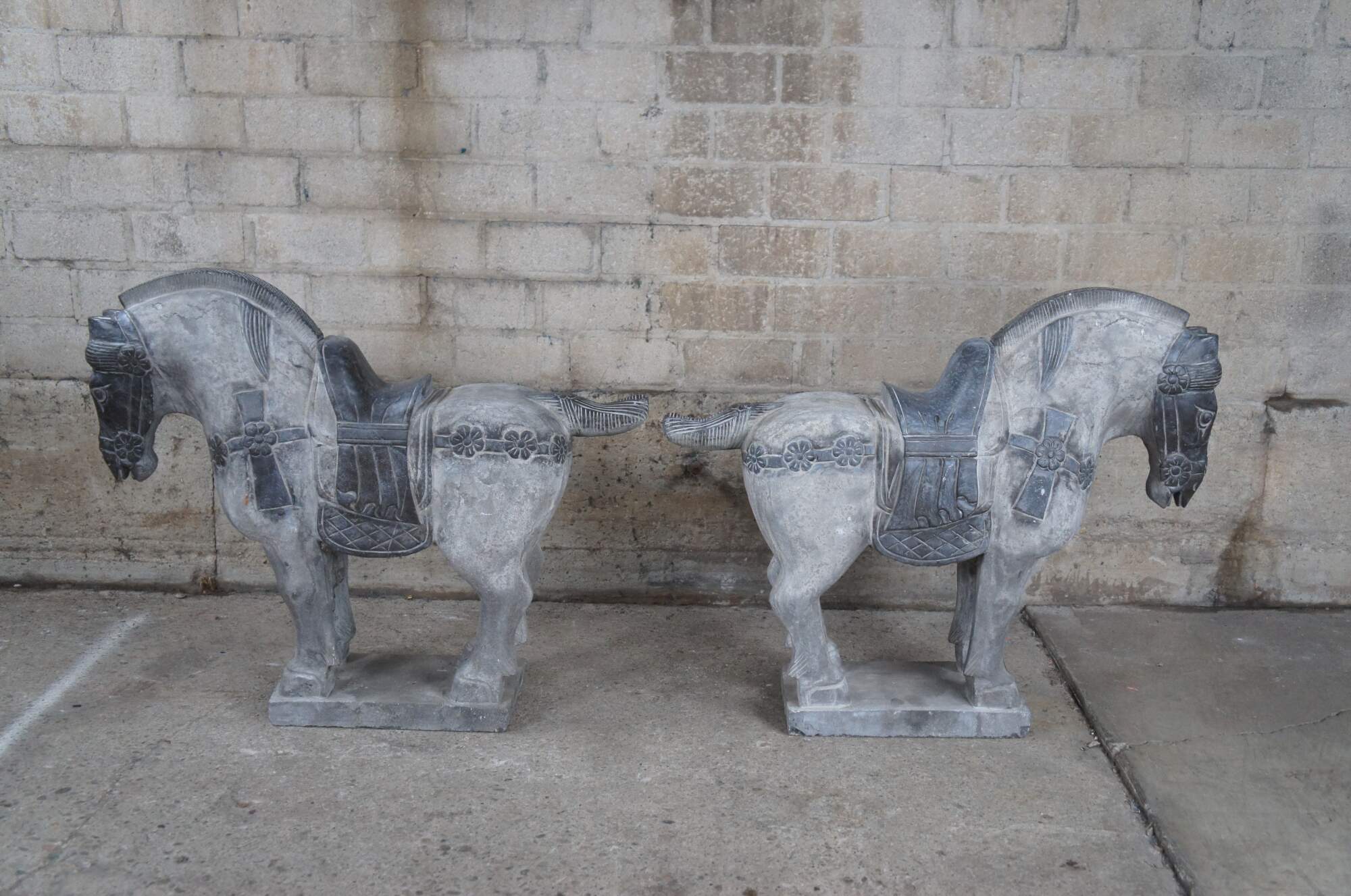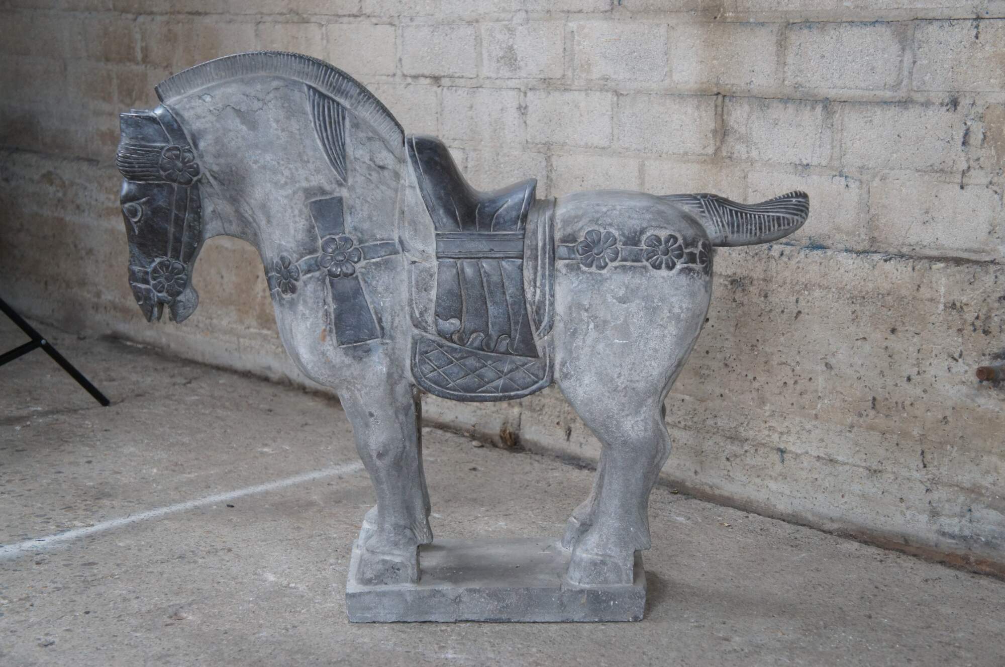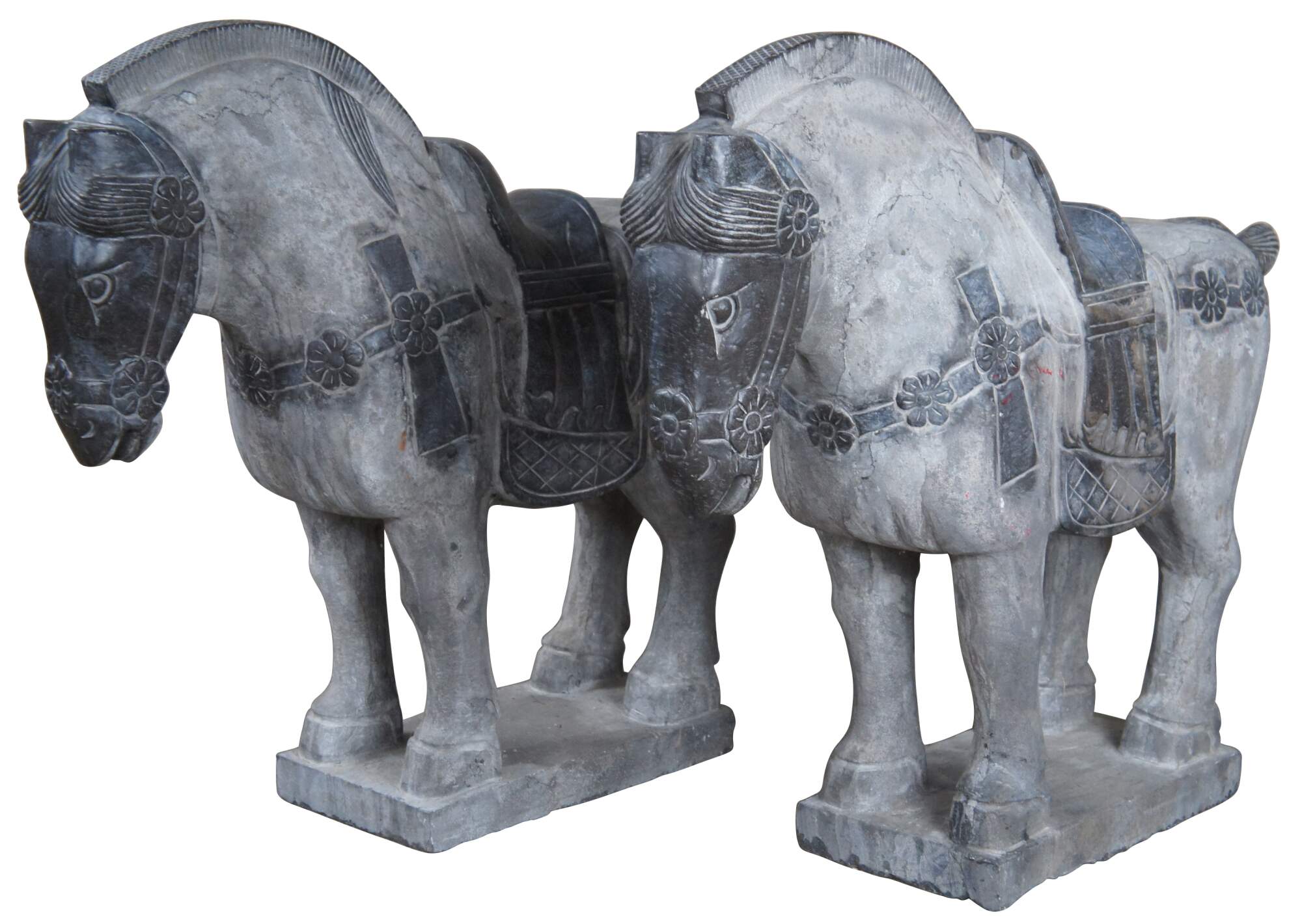 In Chinese culture, the horse is the embodiment of strength, elegance, and perseverance. This imperial palace horse sculpture depicts a noble steed standing with its head raised. This specific pose was very common in horse sculptures crafted during the Tang Dynasty. Crafted from solid stone with intricate detail, this replica reflects the great respect the Chinese people have for the horse. It is a perfect decor piece for indoor or outdoor use. Each horse weighs 222.5 lbs