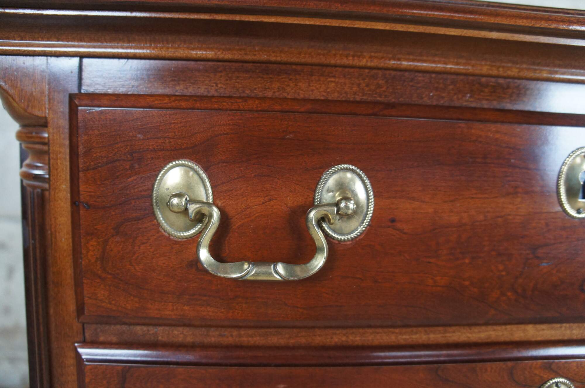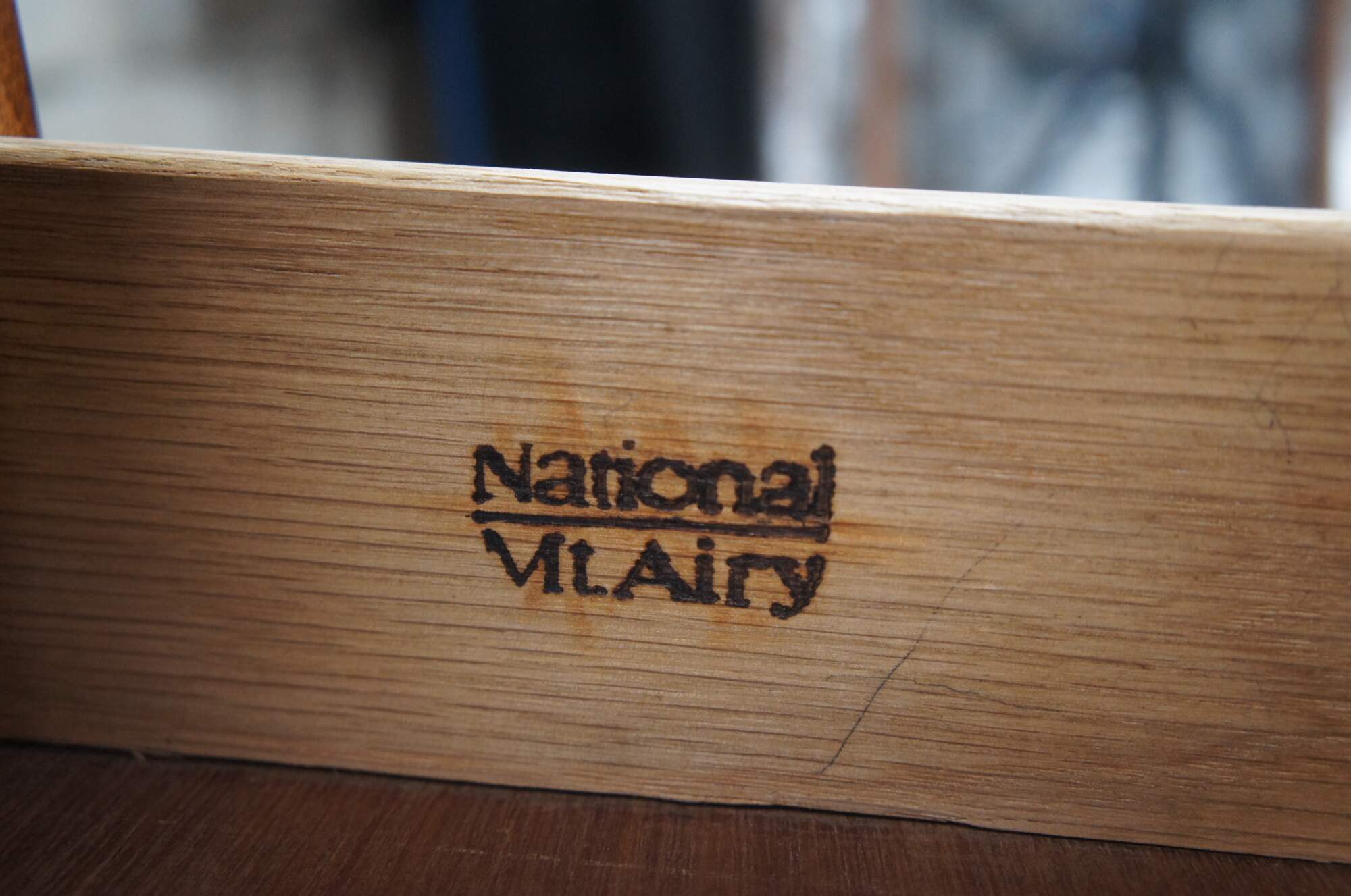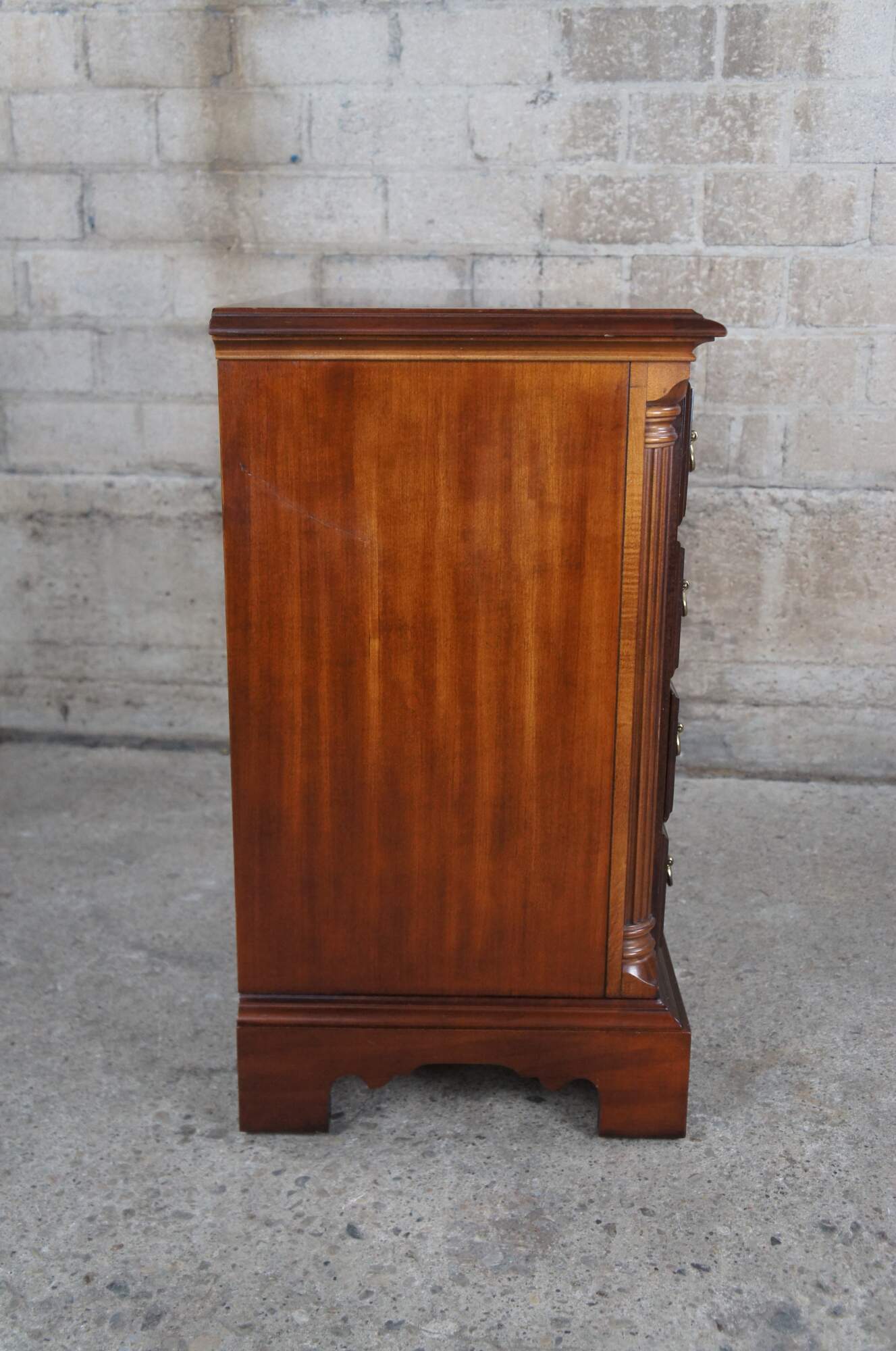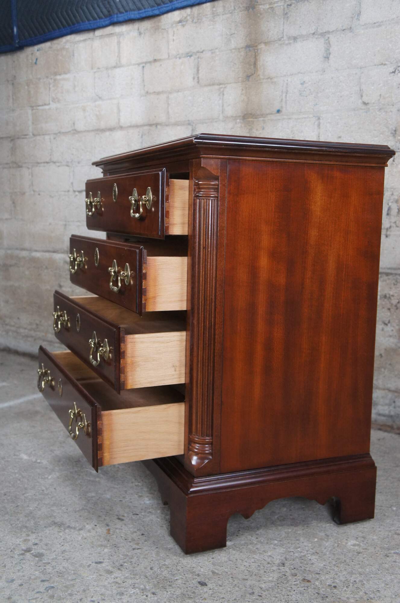 Vintage National Mt. Airy four drawer dimunitive chest, nightstand or side table, circa last quarter 20th century. Made of cherry featuring rectangular form with quarter cut grecian fluted columns, brass bail drawer pulls, and bracket feet.