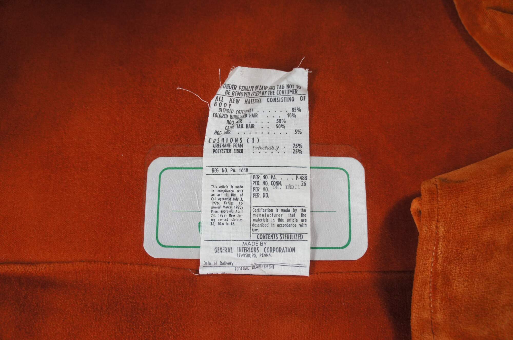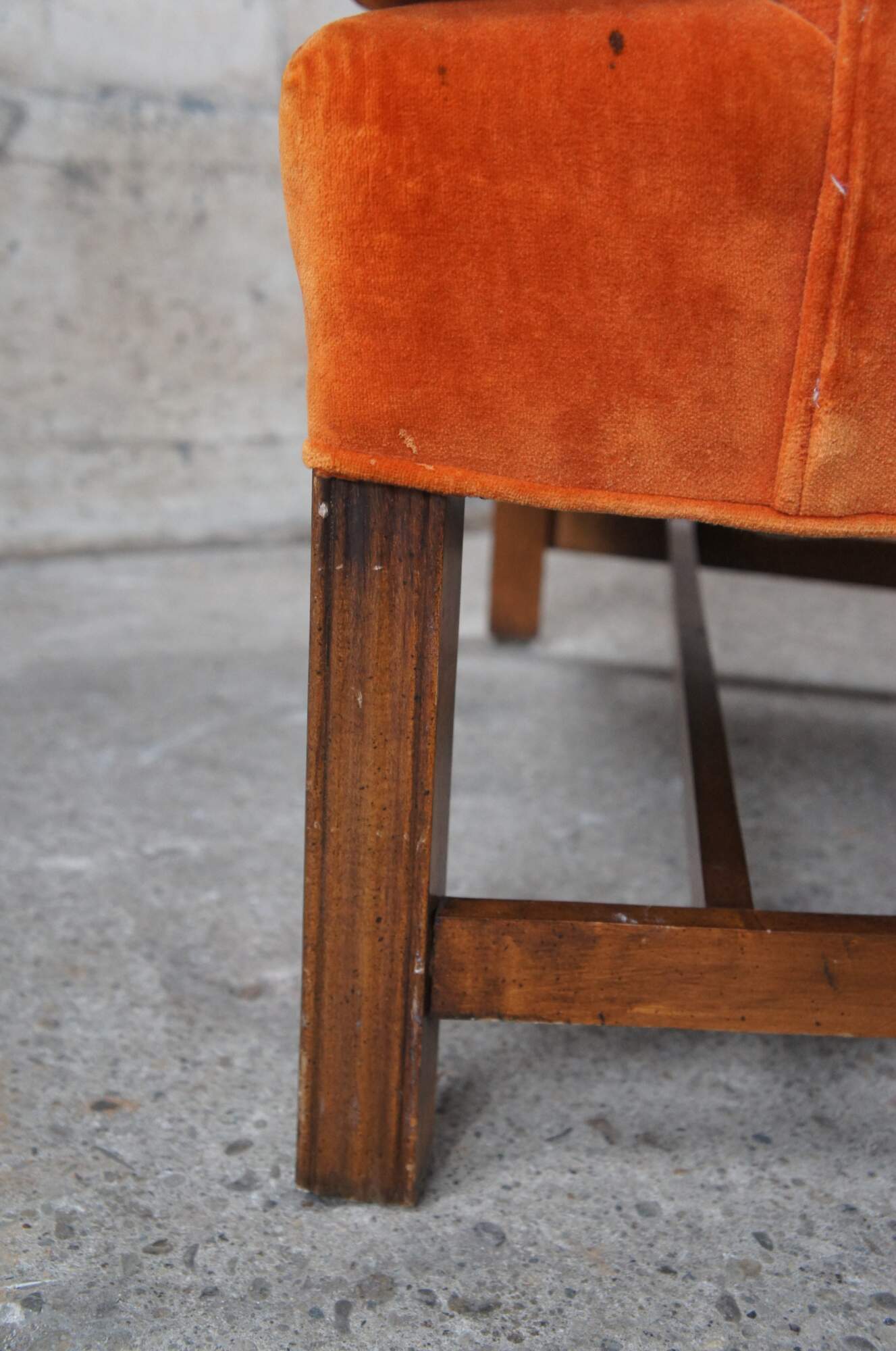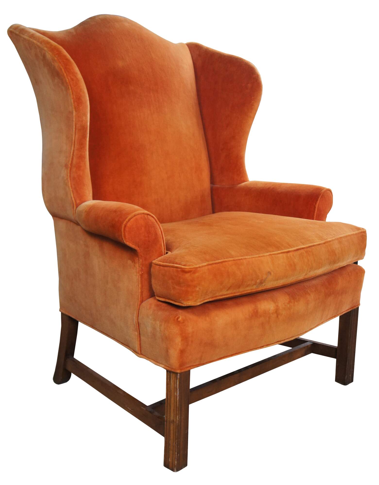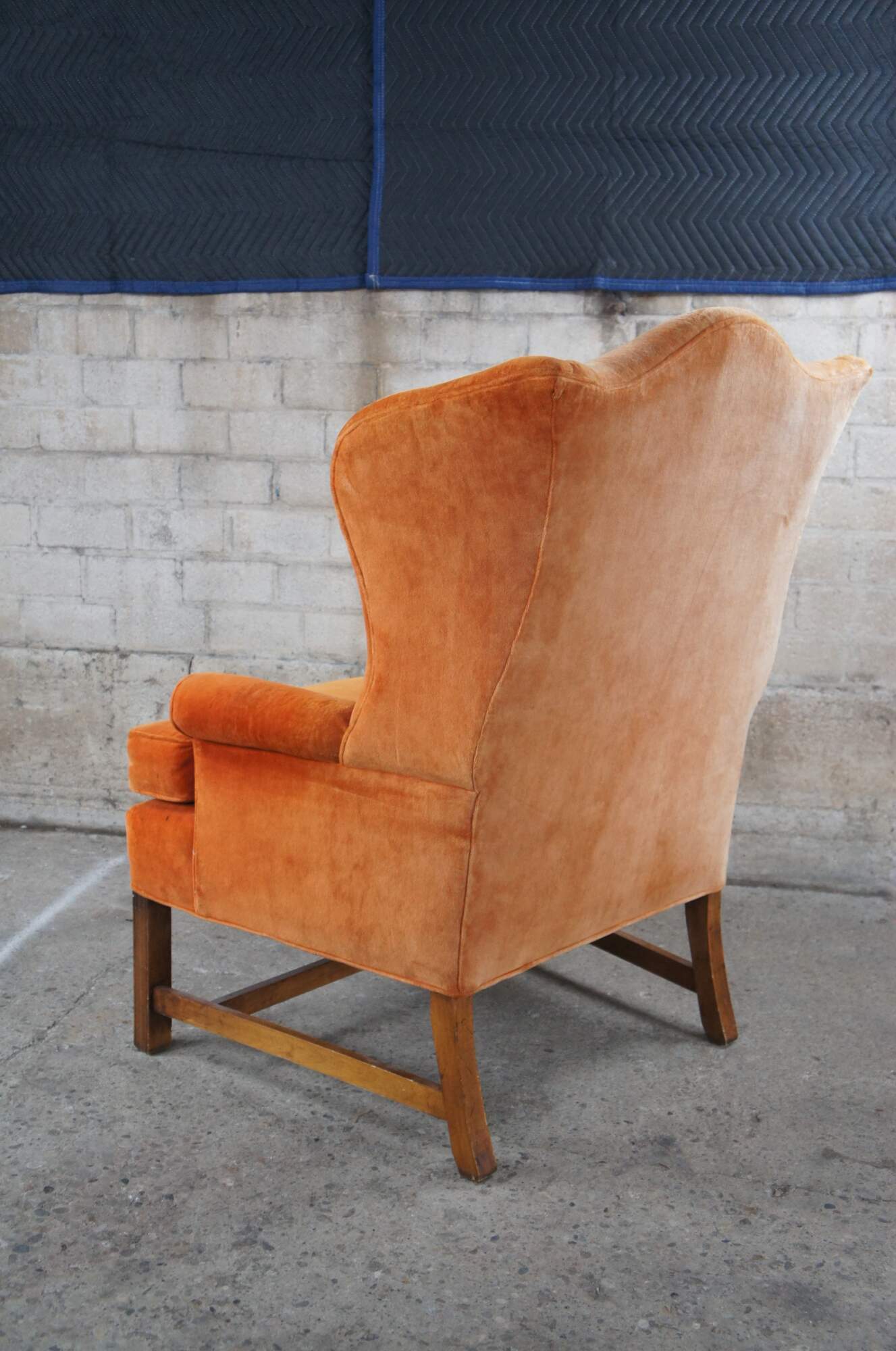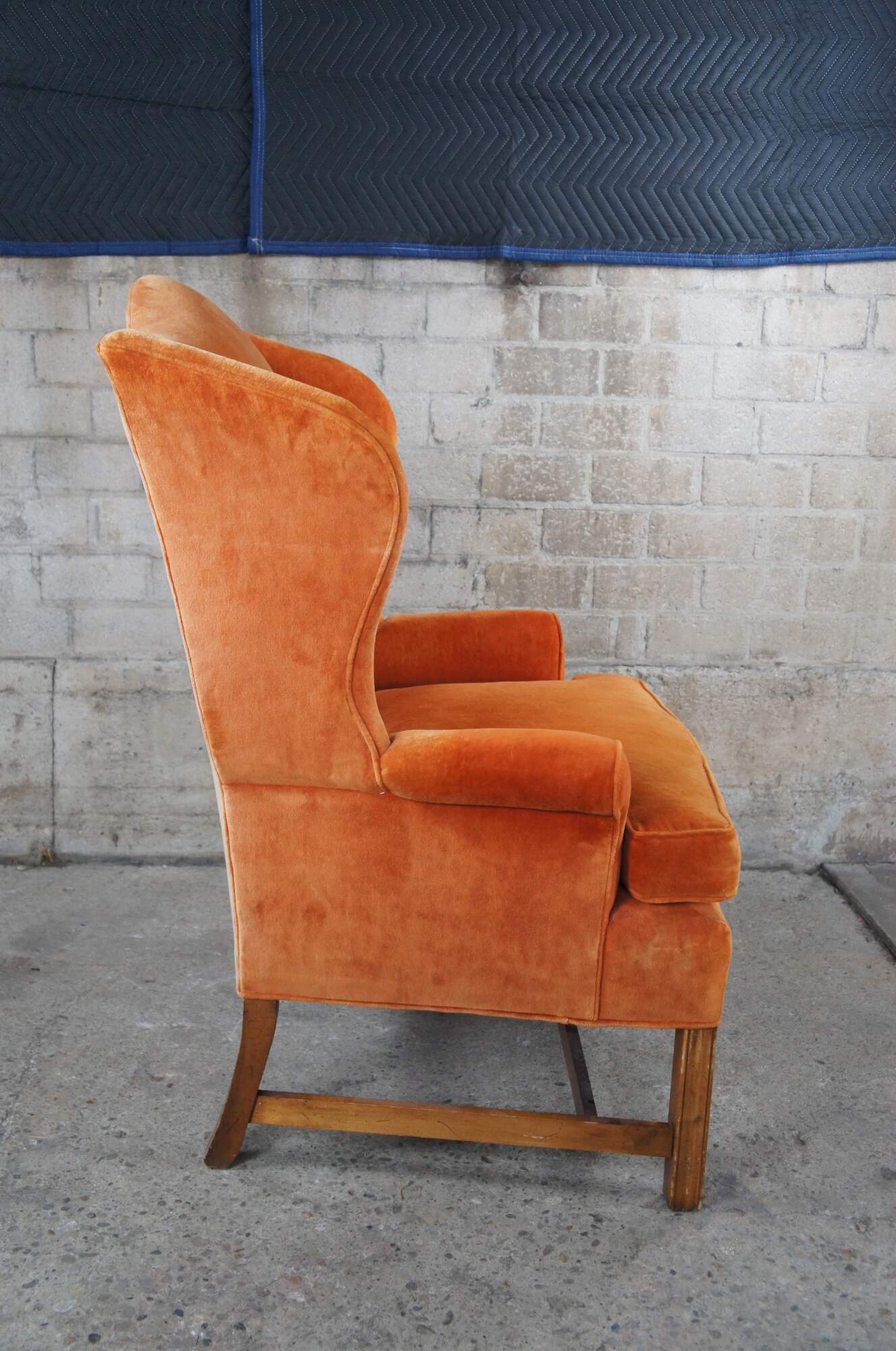 Vintage mid century General Interiors Corporation wingback armchair featuring serpentine form with orange velvet upholstery.
