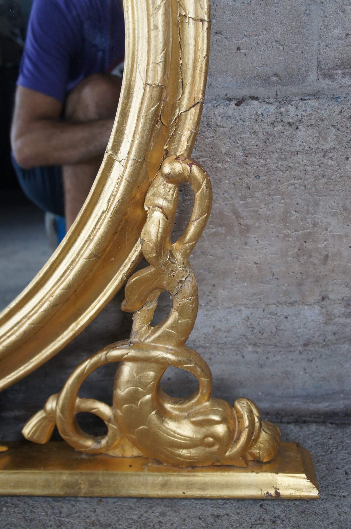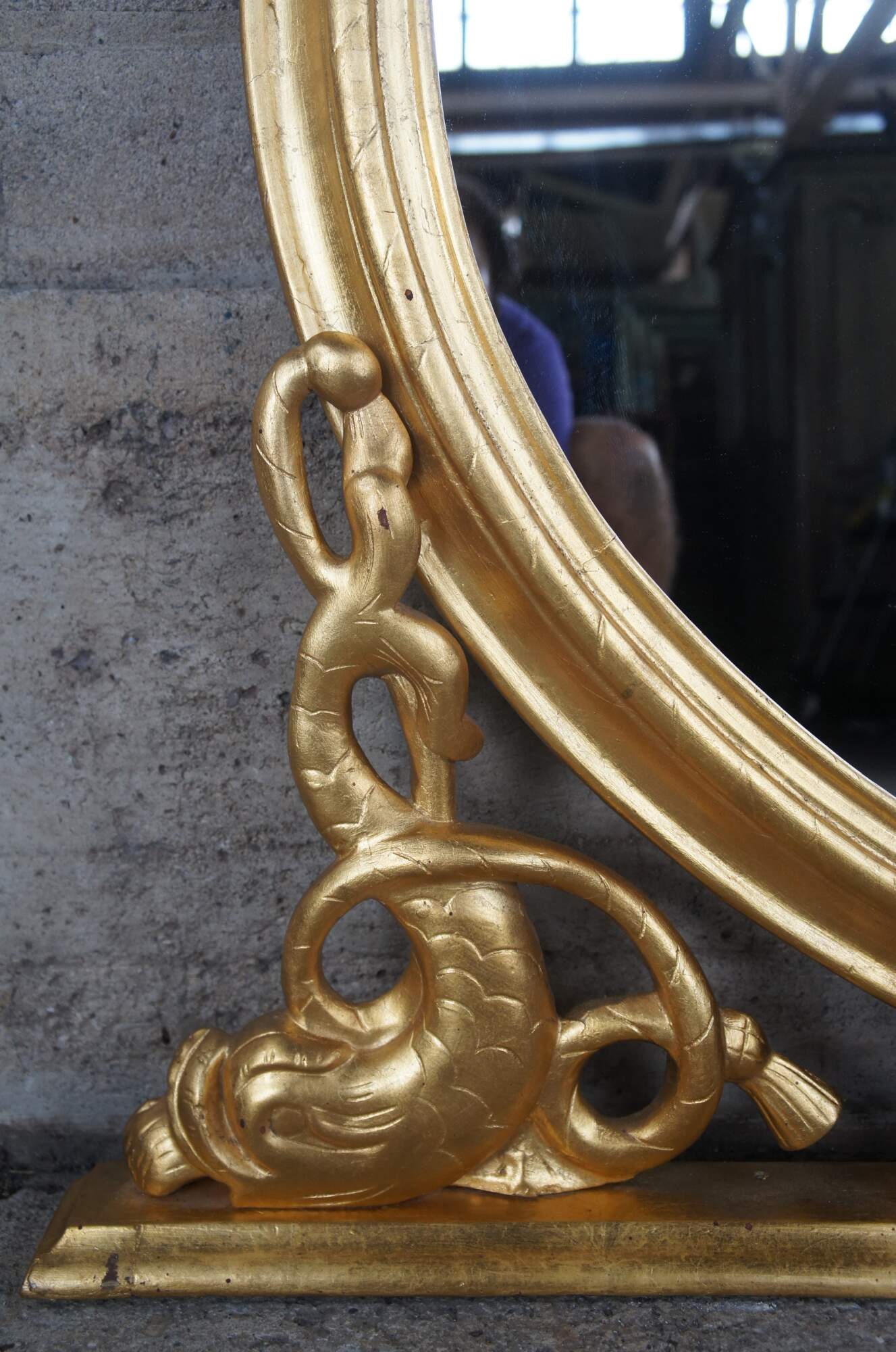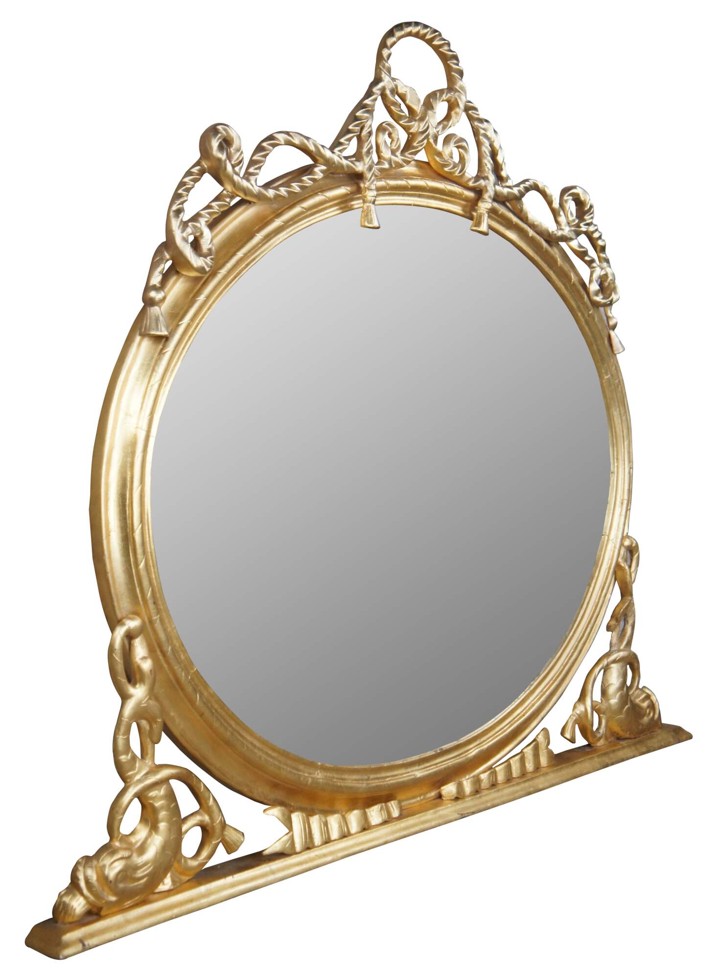 Extremely Rare Example of a Period Late 18th Century George III Admiral Lord Nelson Over Mantel Mirror. An oval giltwood frame with rope and tassel design along the crown and stylized dolphin (Delphin) supports at the base.