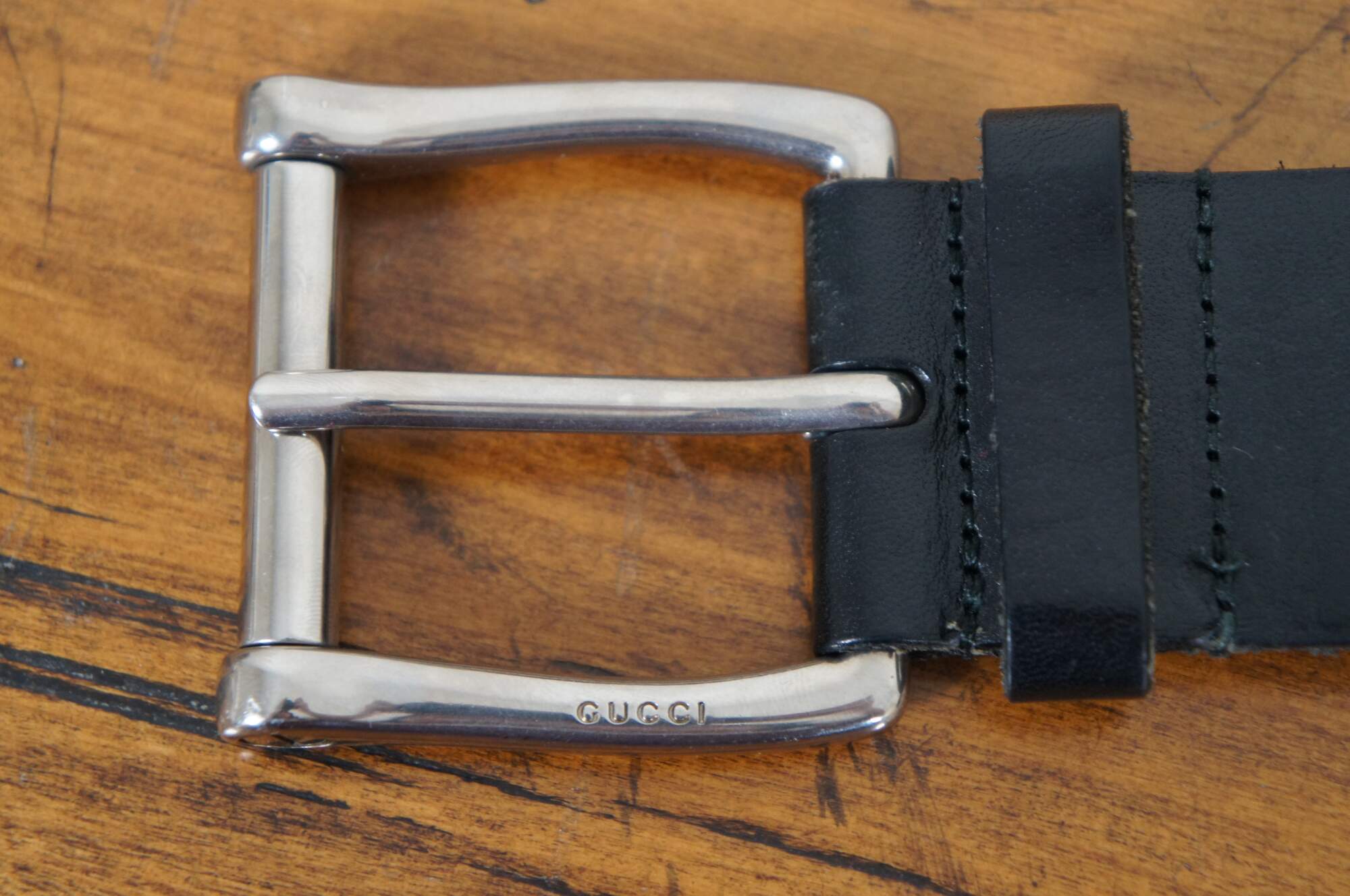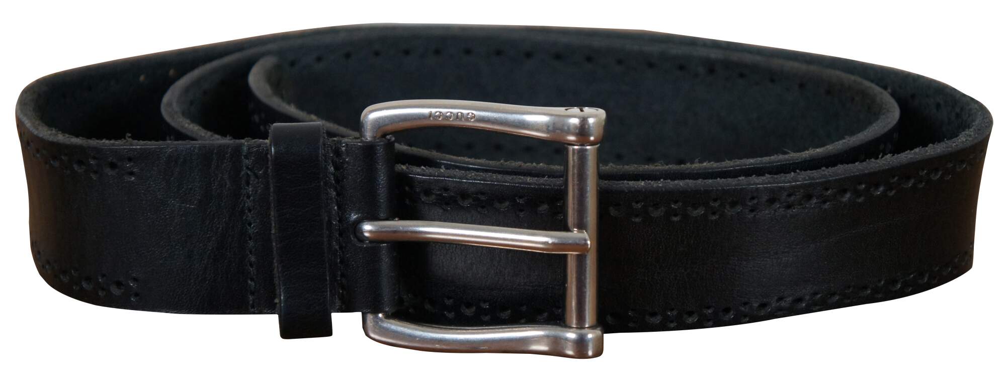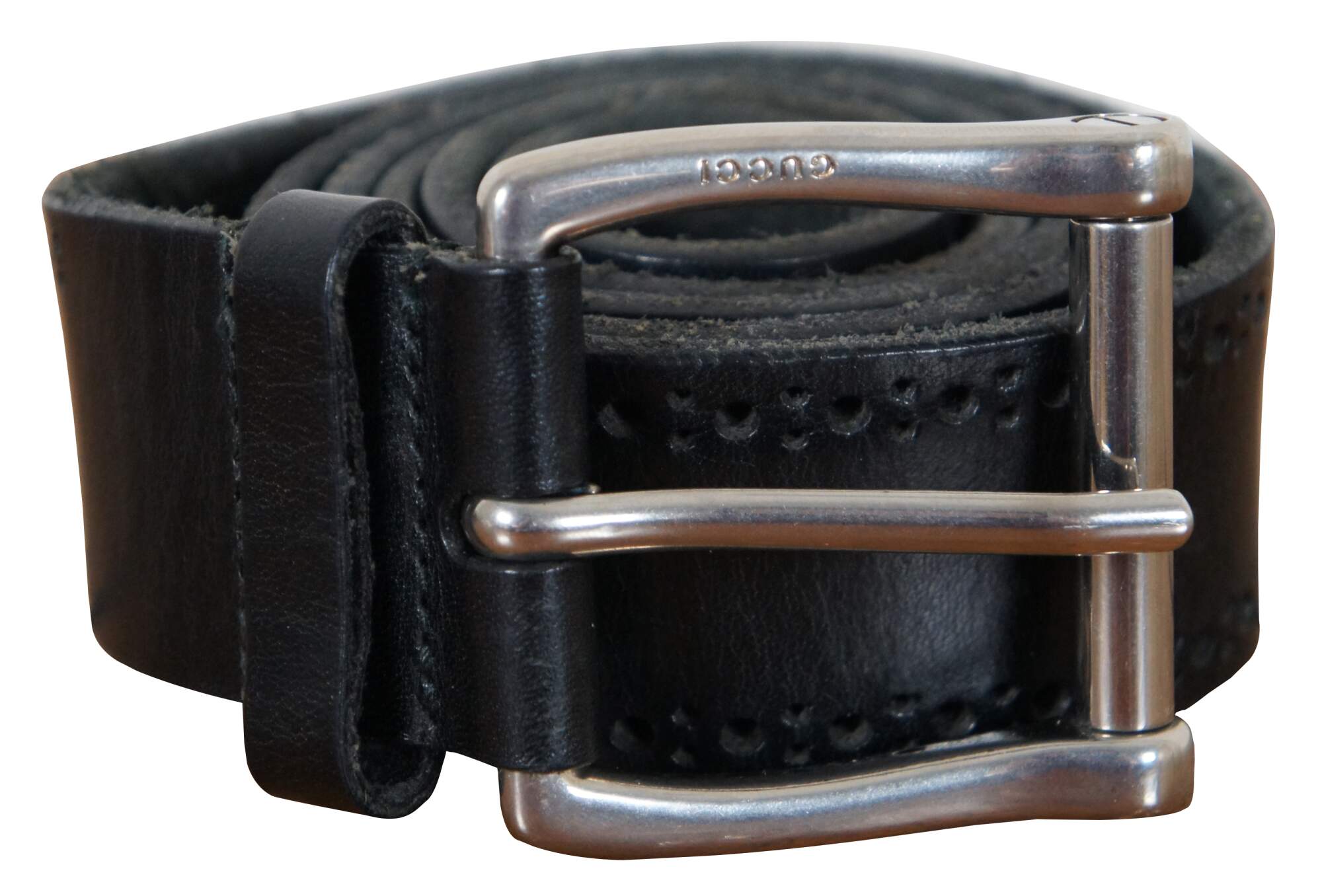 Gucci black leather mens belt featuring a pierced design along the edge and squared off silver tone buckle; serial number 302972214351100.