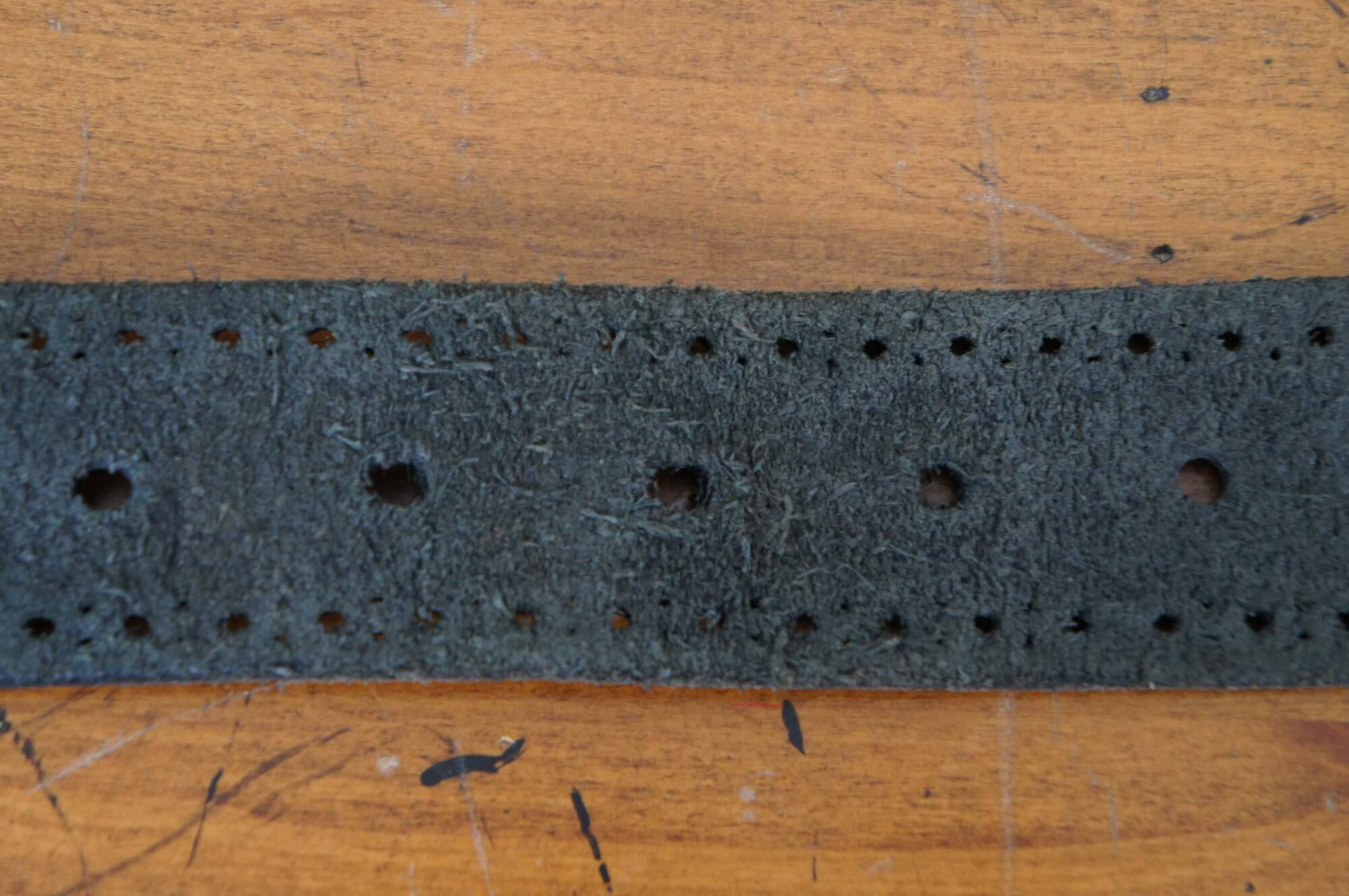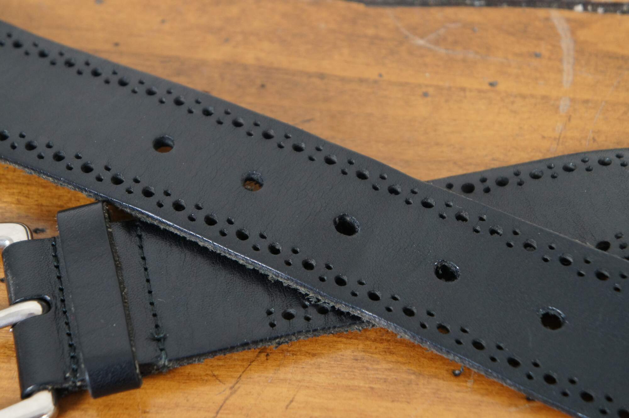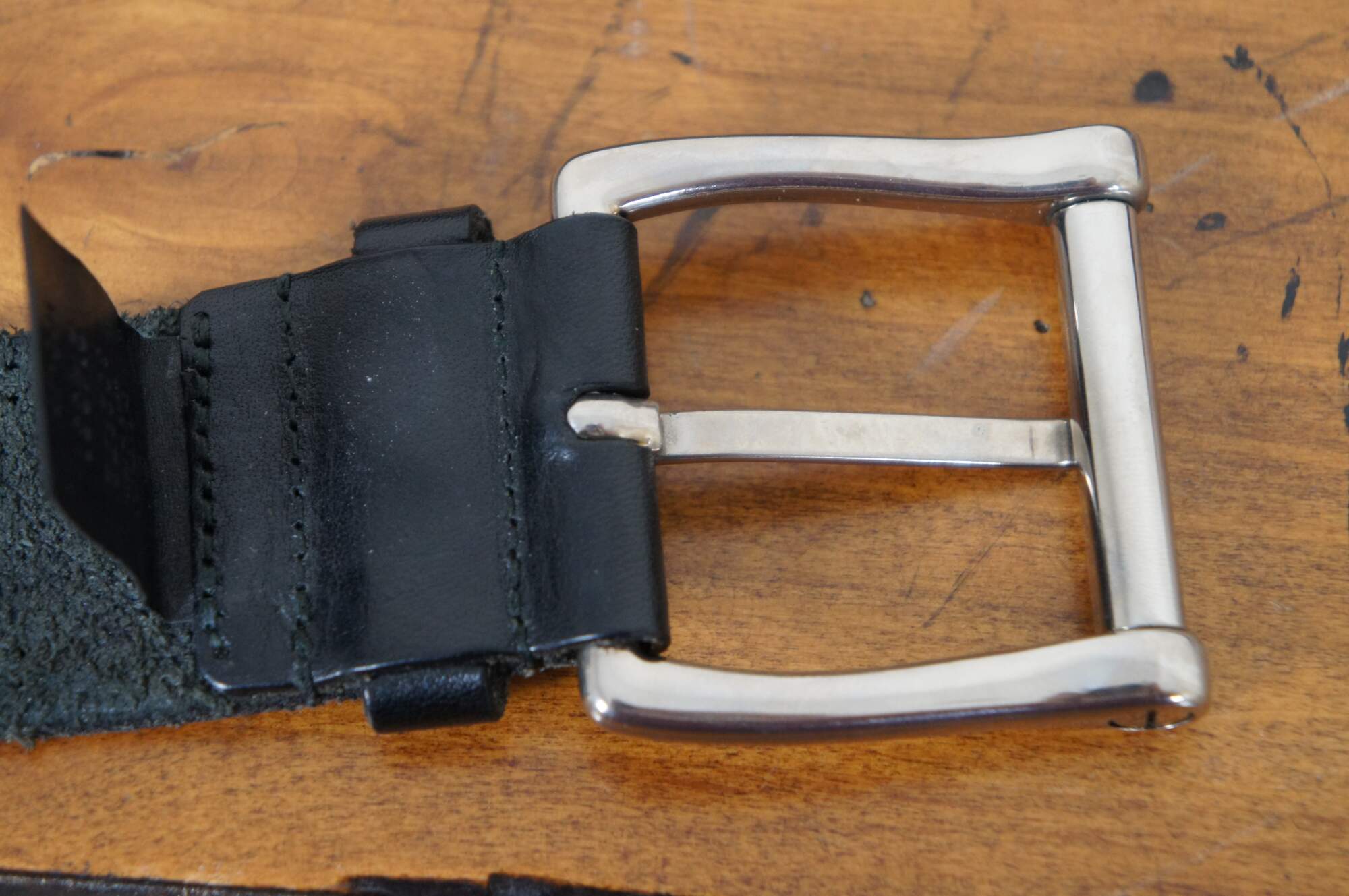 Gucci black leather mens belt featuring a pierced design along the edge and squared off silver tone buckle; serial number 302972214351100.