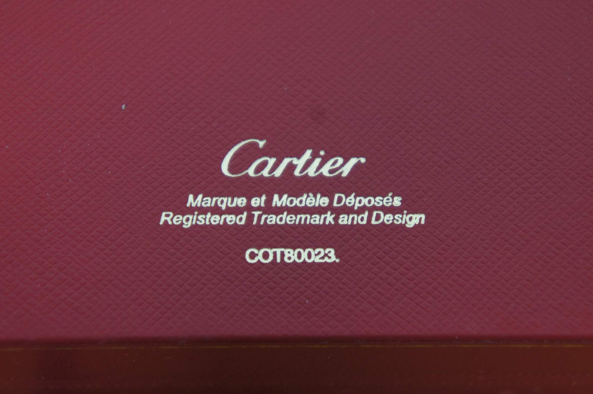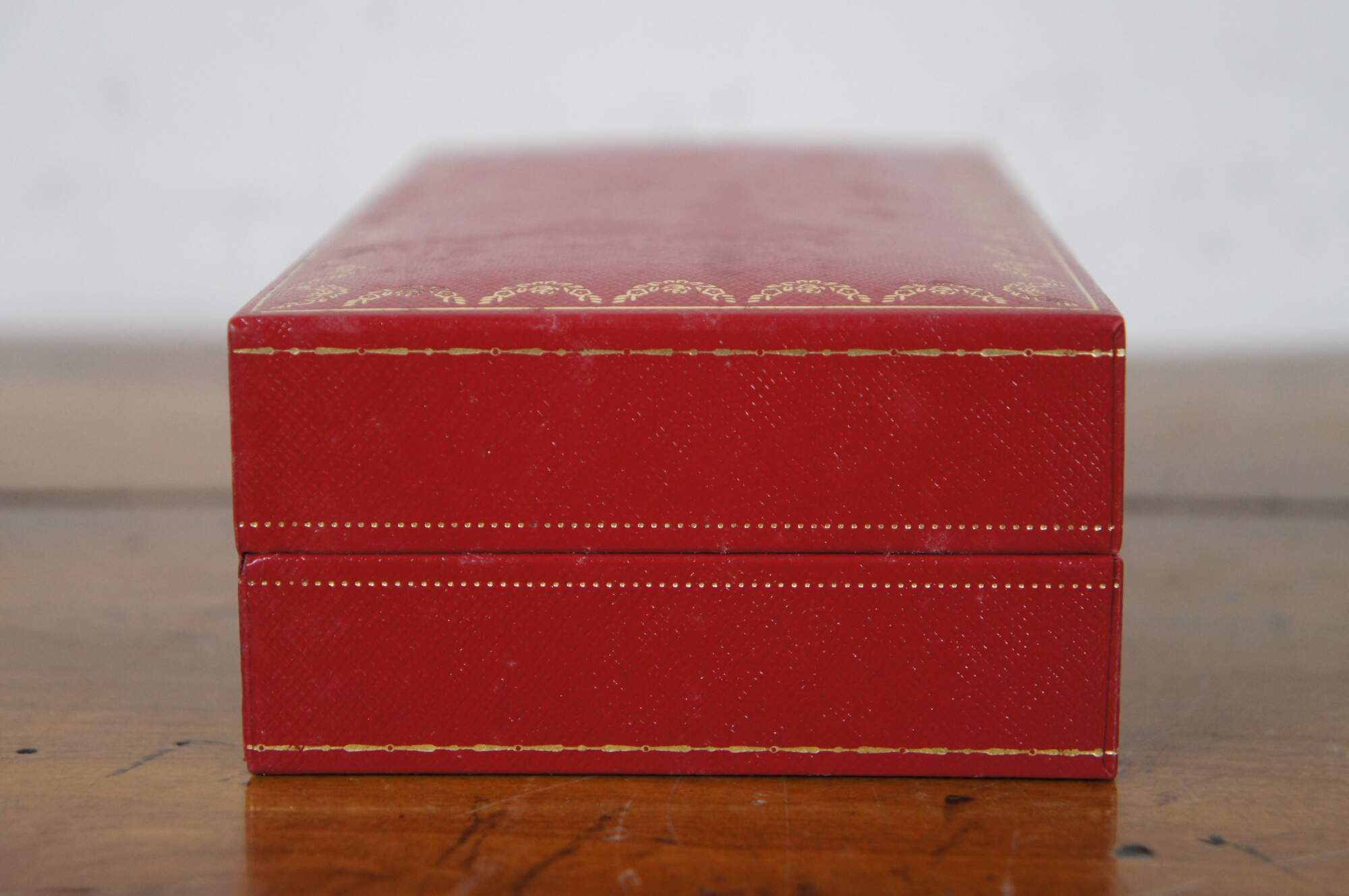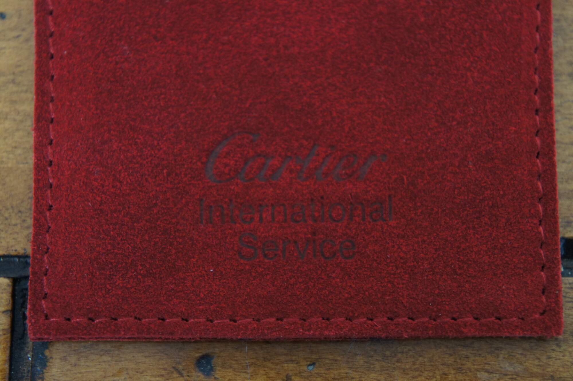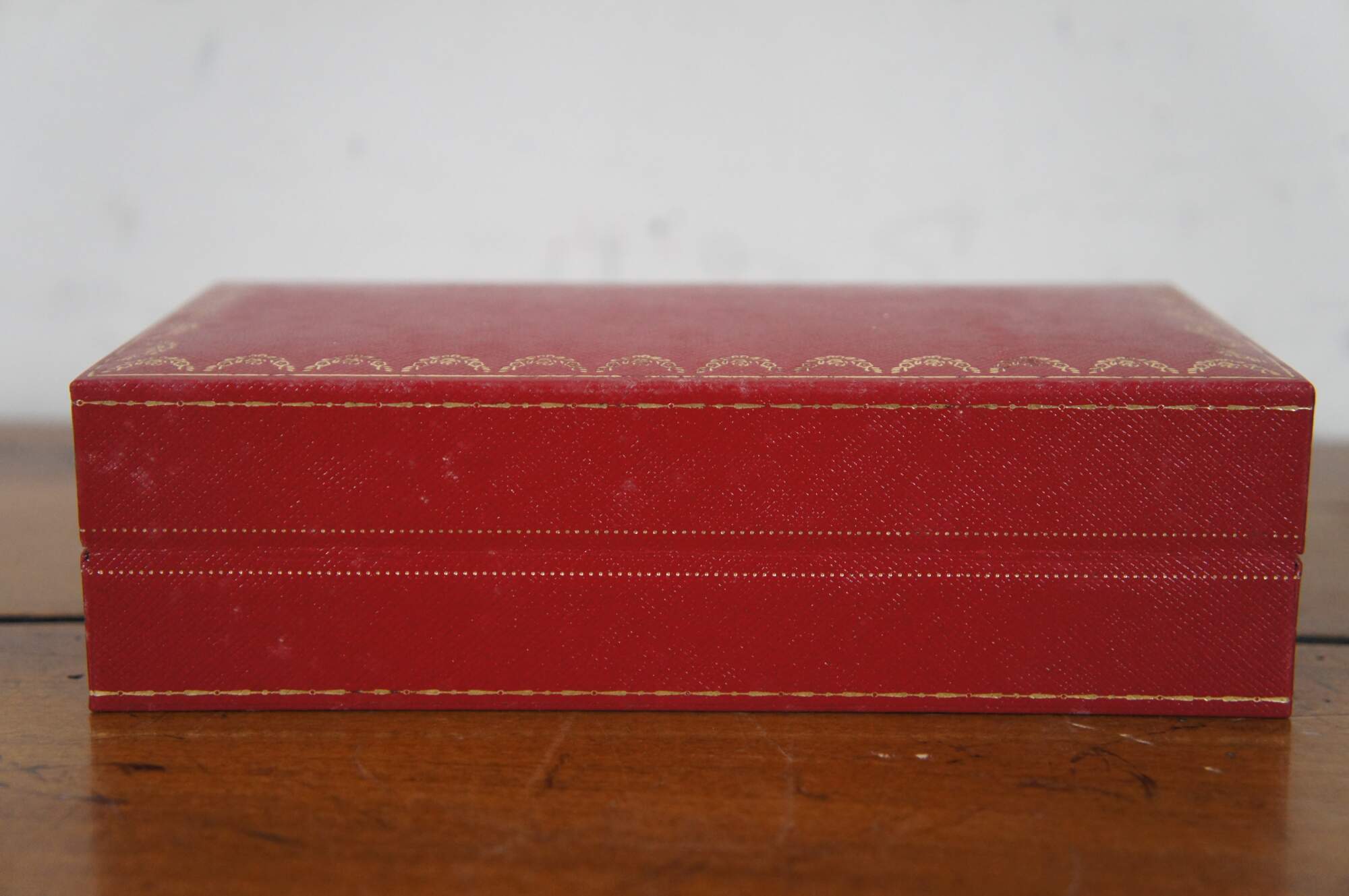 One red and gold embossed leather Cartier sunglasses box with white satin interior and red suede leather Cartier International Service glasses sleeve.