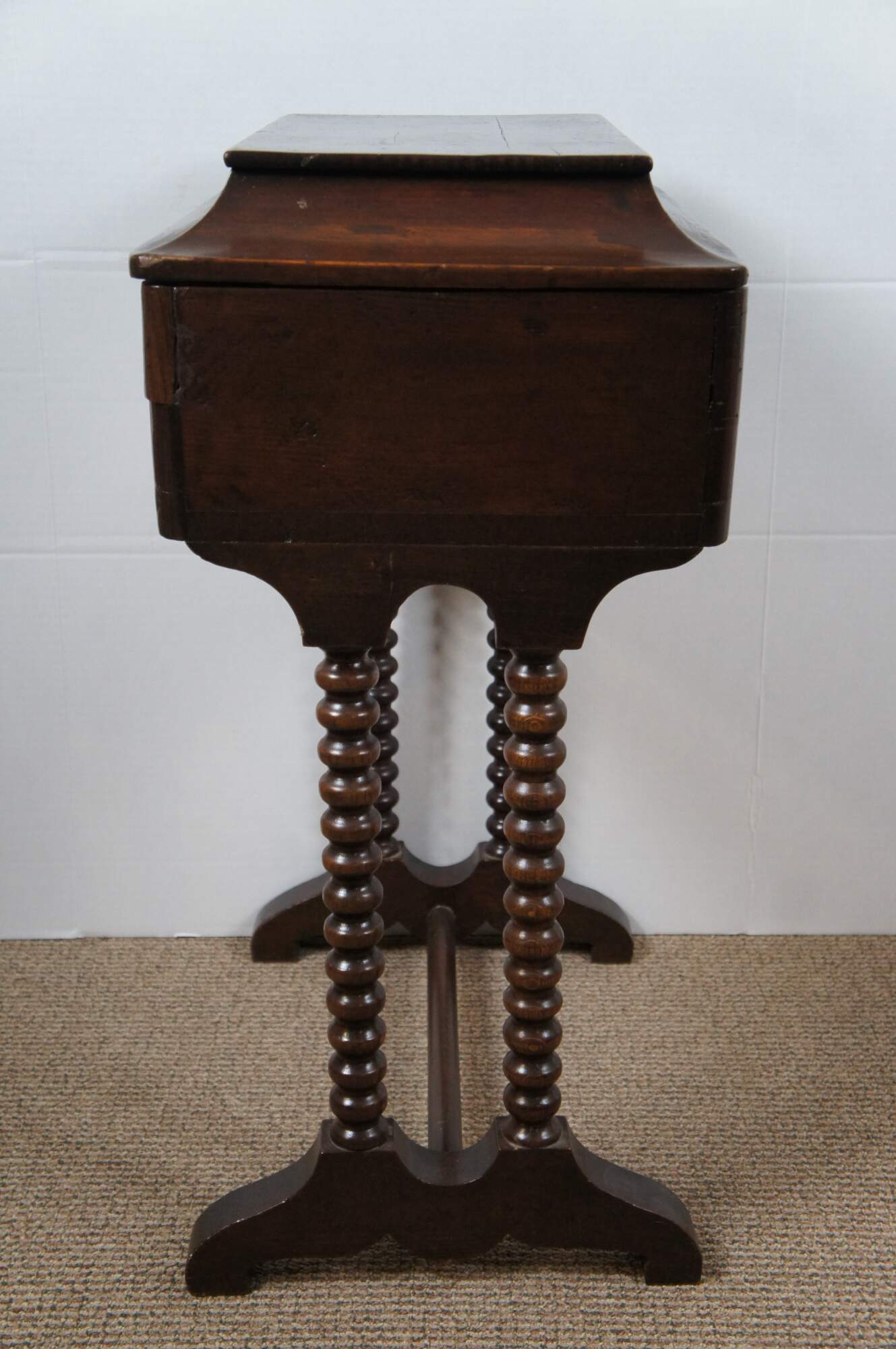 An antique Victorian ladies sewing cabinet or work table. Made from walnut with a downswept top leading to a hinged compartment with baize lined dividers and hidden mirror at the rear over a lockable lower hand dovetailed drawer with northwind face escutcheon plate. The table is supported by four bobbin turned legs leading to serpentine foot / bracket connected by a central stretcher.