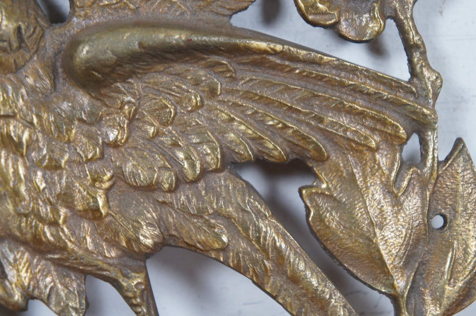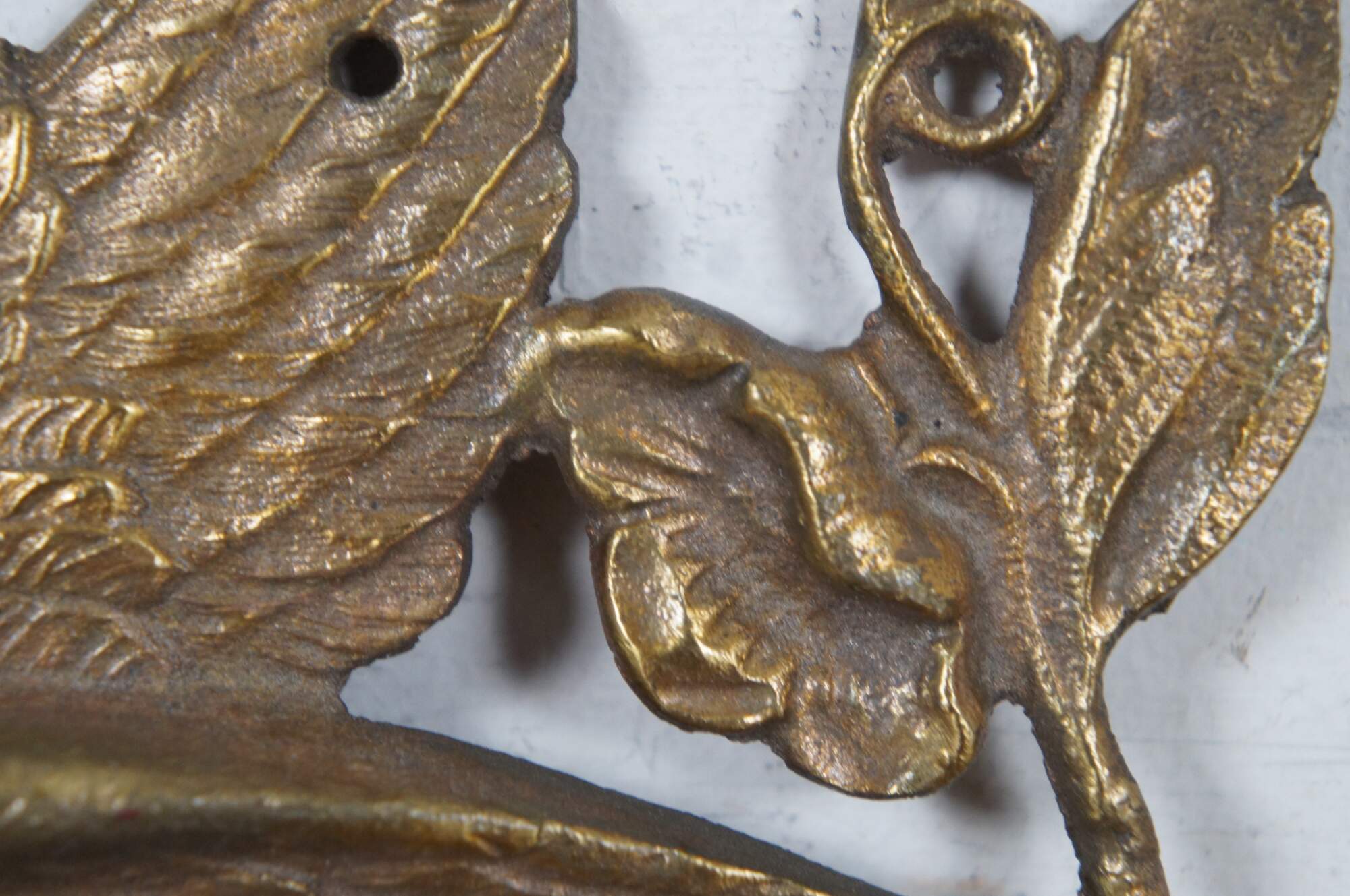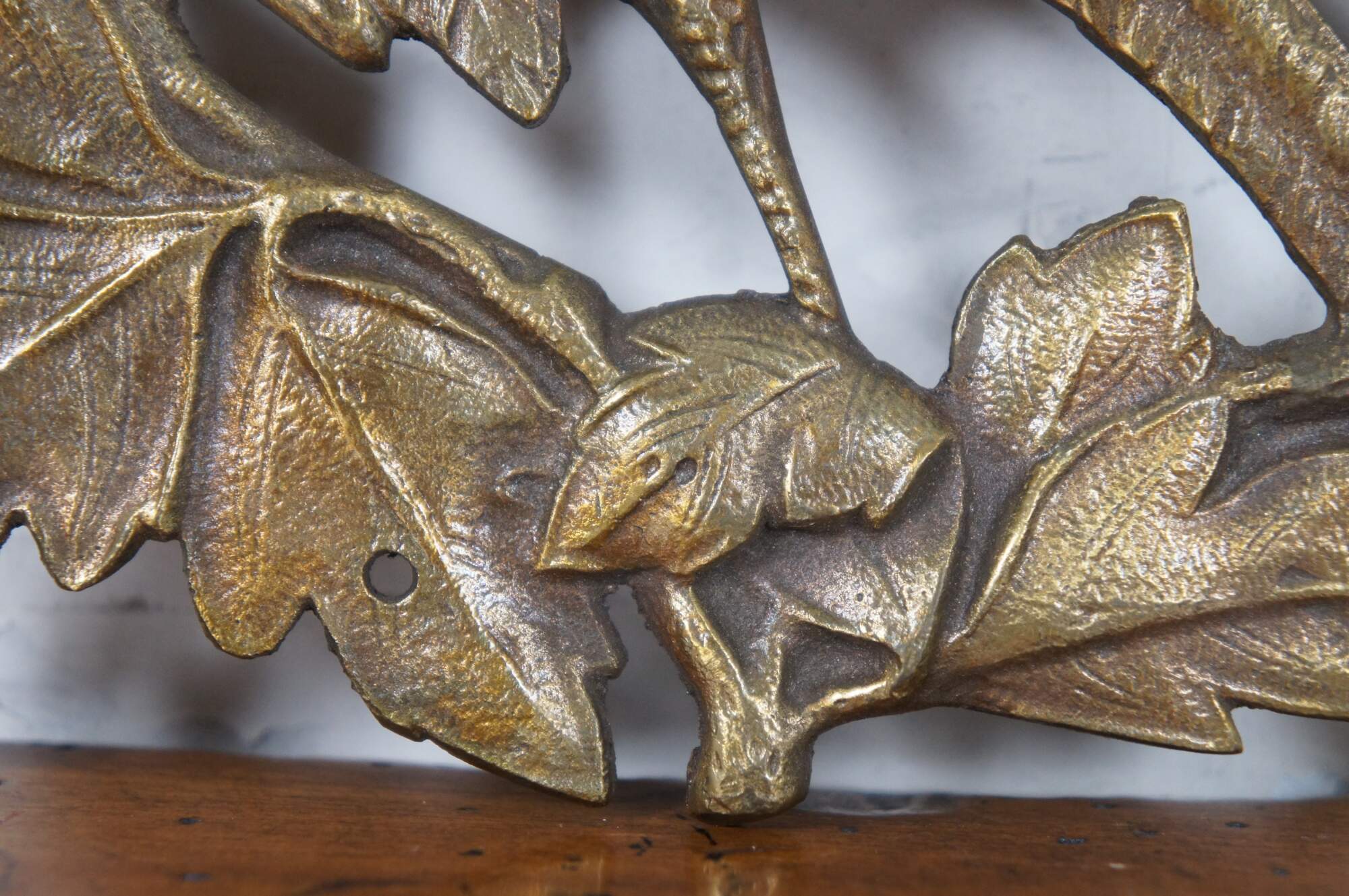 Vintage cast bronze wall plaque in the shape of a bird perched on a leafy branch with two flowers.