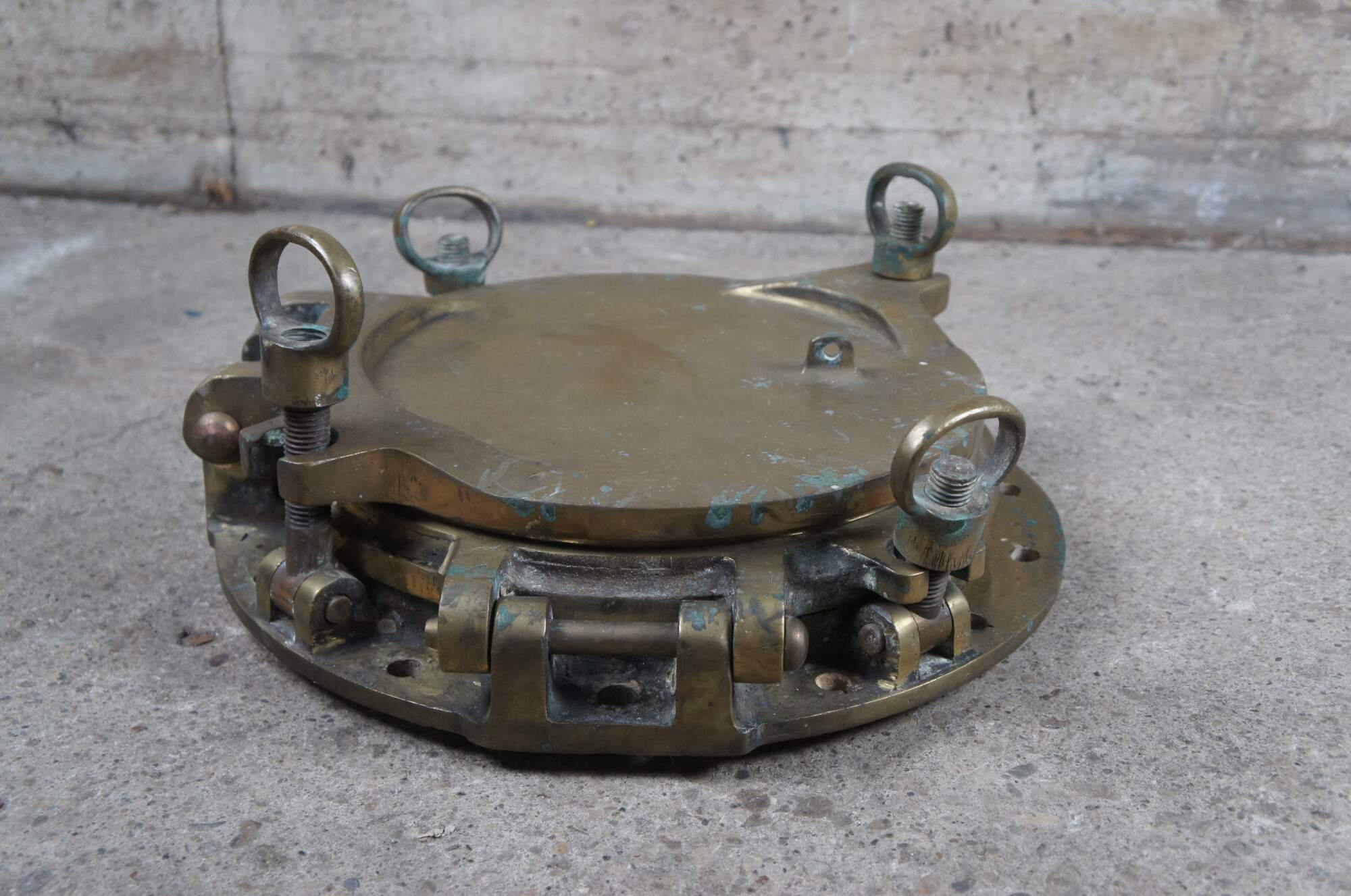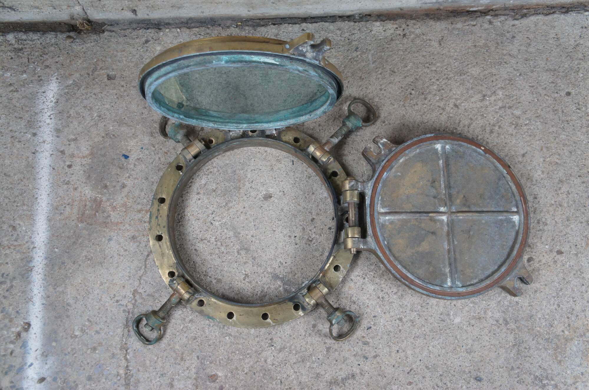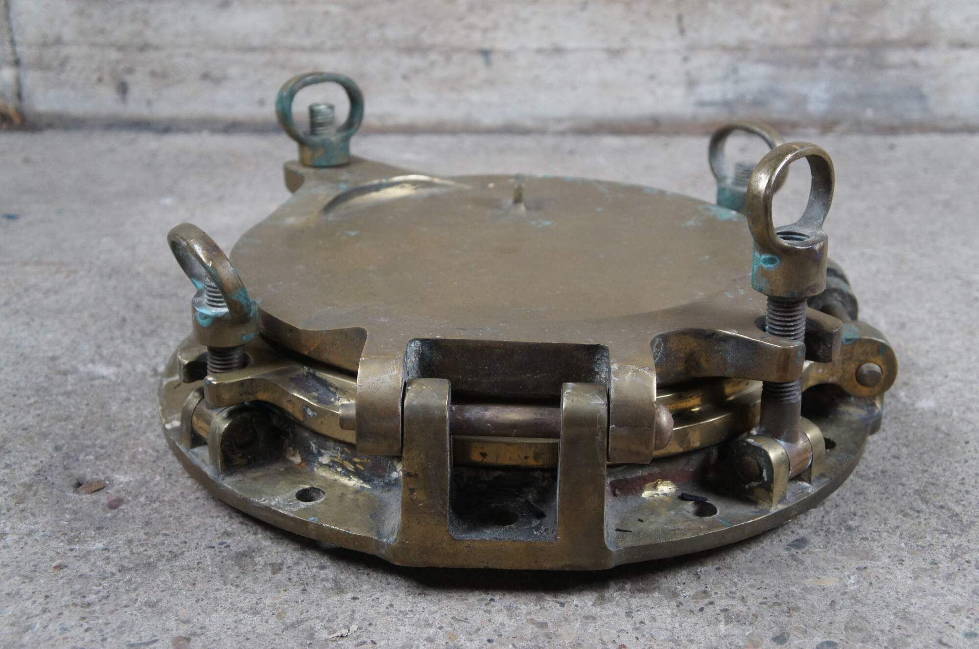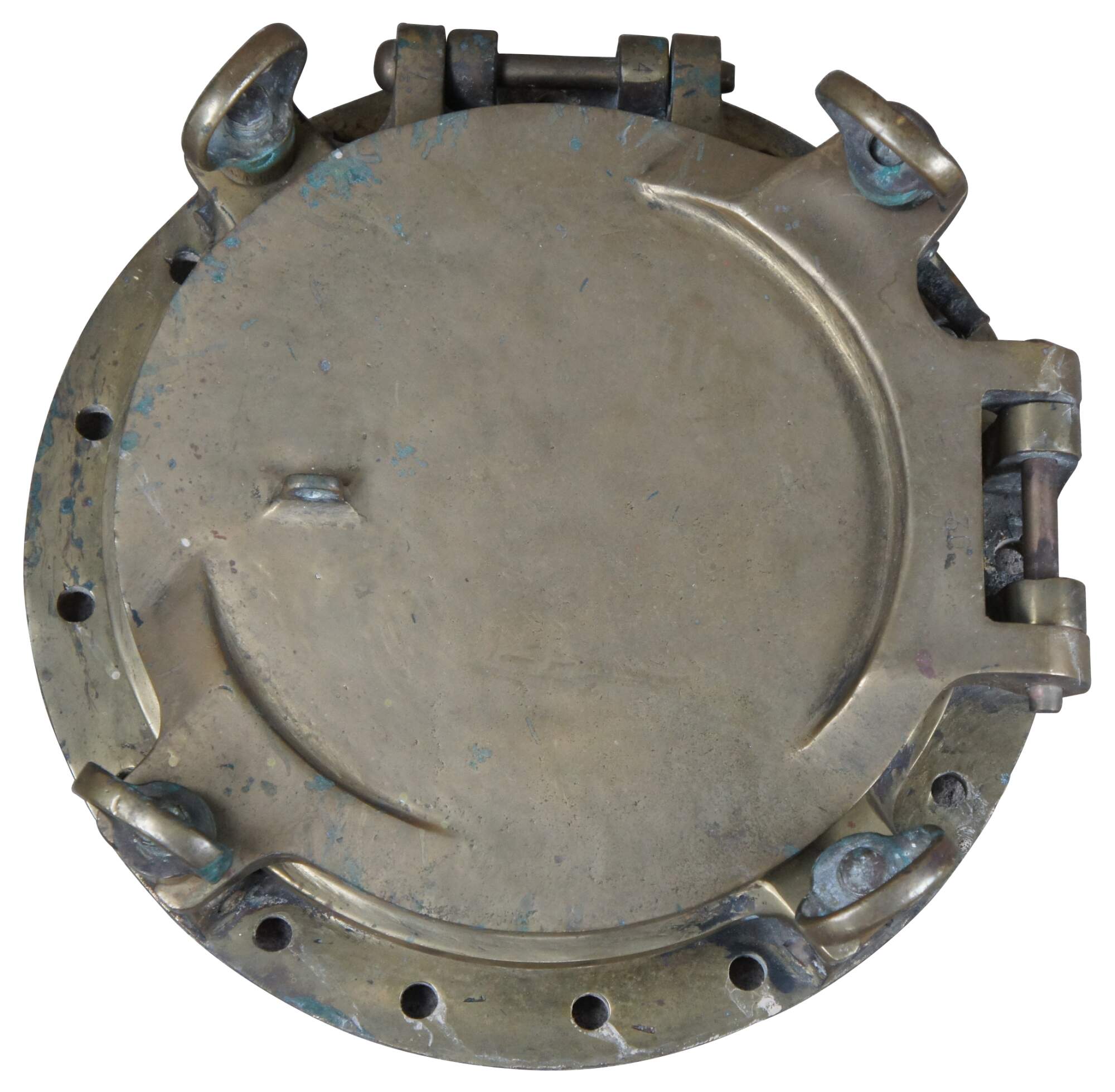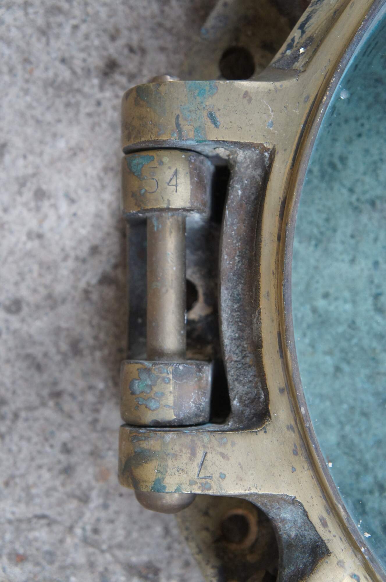 Extremely unique original antique heavy solid brass maritime Ship's Porthole or Hatch. A rare find with storm door, swing plate and barking plate. Its very unusual to find a complete porthole with swing plate. They are most often found as just a barking plate or window with storm door. The majority are rather simple and made from aluminum or nickel plated rather than heavy brass like this unique specimen. The vast majority of portholes on the market today are modern or reproduction's. This aged beauty is complete with original green glass and 4 dogs. High quality construction and hefty weight, 103 lbs. Marked 2260,30 on the exterior and 54,7 by the hinge