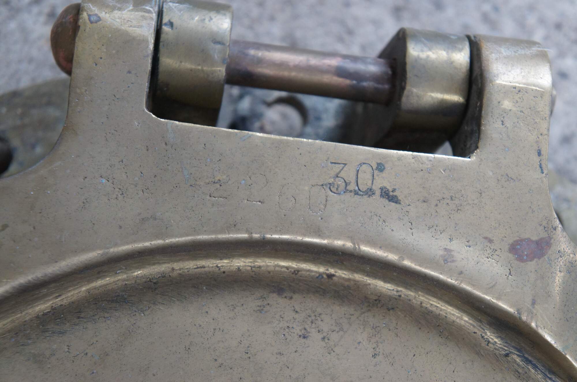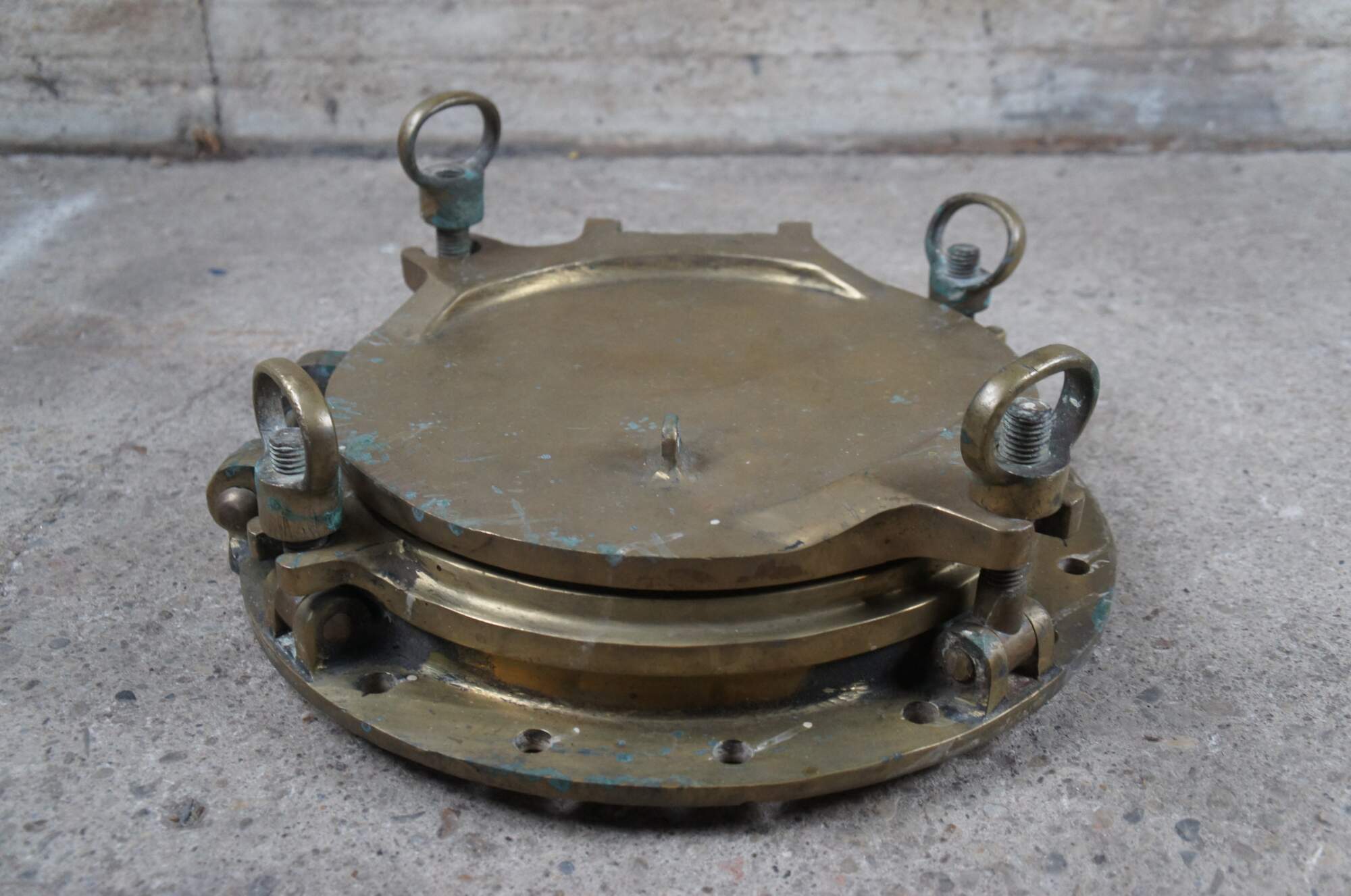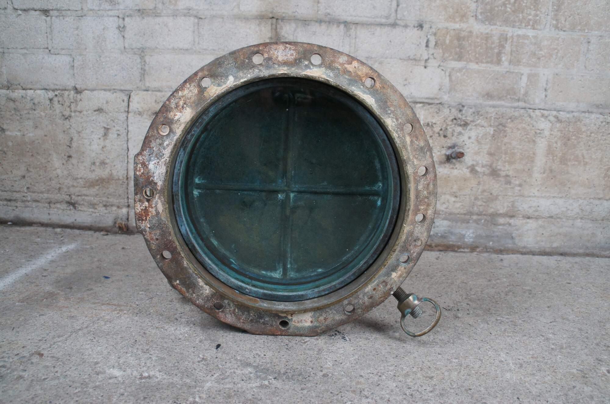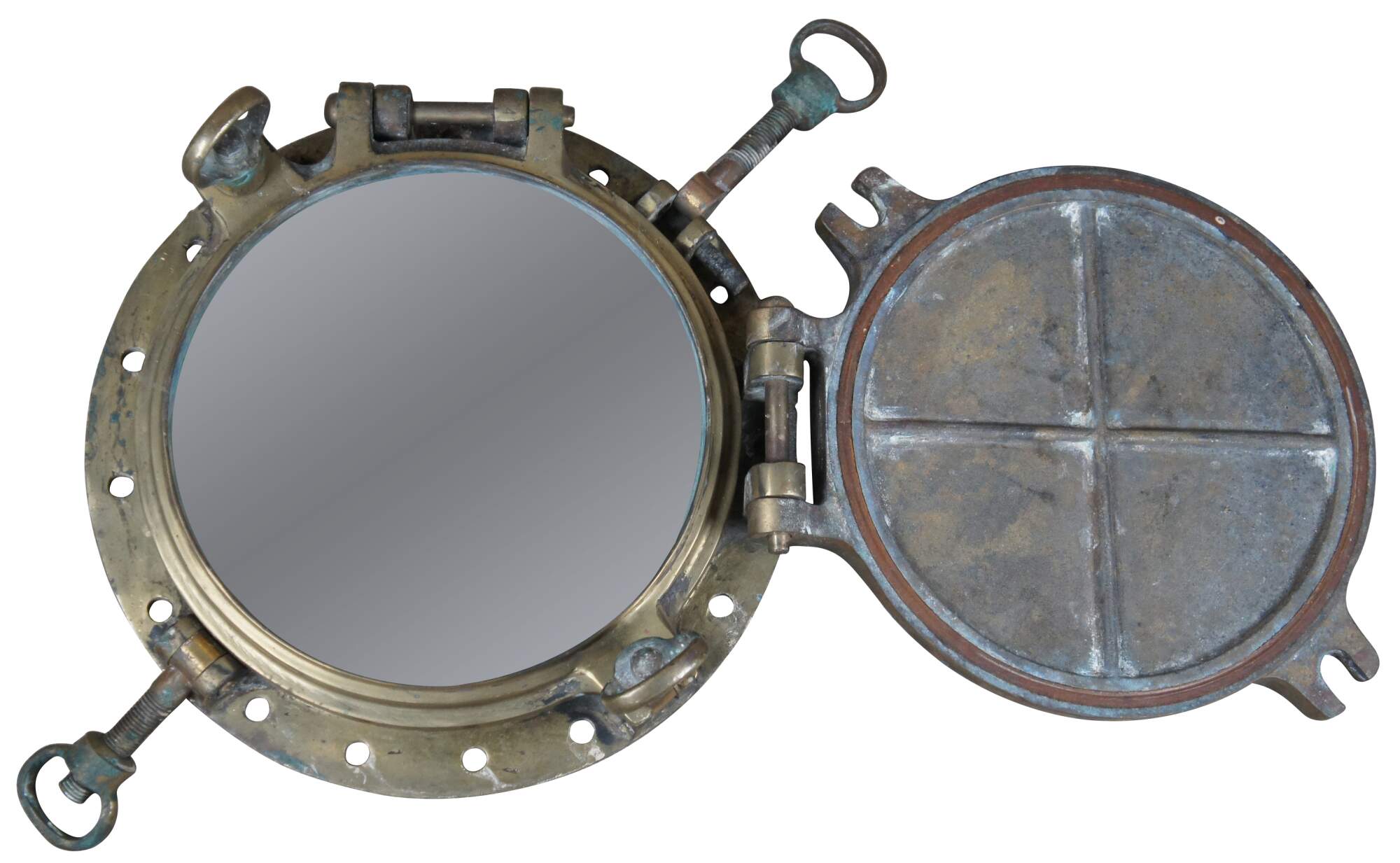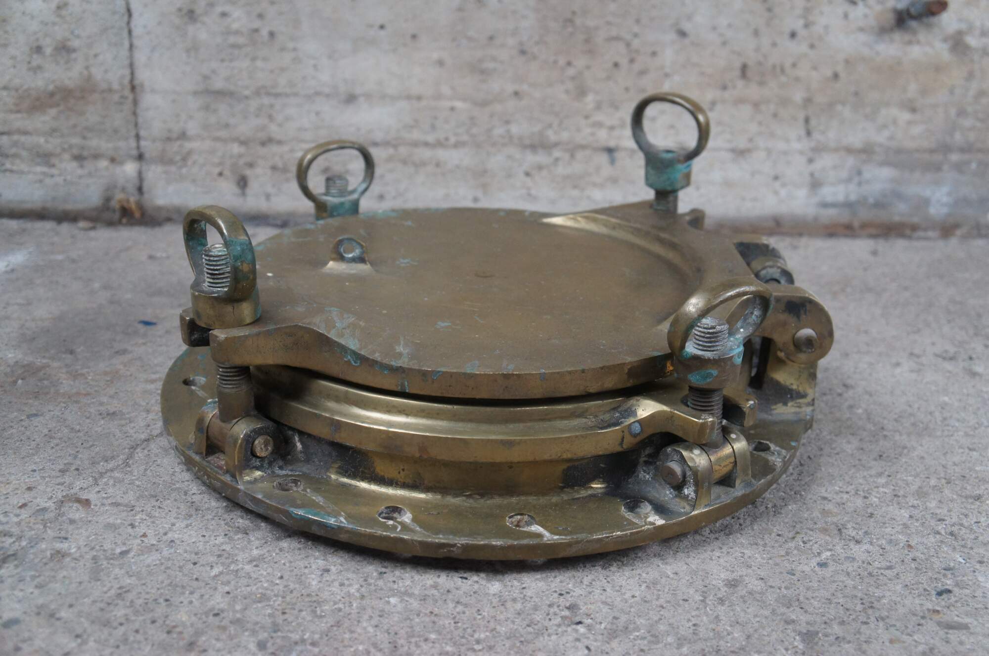Extremely unique original antique heavy solid brass maritime Ship's Porthole or Hatch. A rare find with storm door, swing plate and barking plate. Its very unusual to find a complete porthole with swing plate. They are most often found as just a barking plate or window with storm door. The majority are rather simple and made from aluminum or nickel plated rather than heavy brass like this unique specimen. The vast majority of portholes on the market today are modern or reproduction's. This aged beauty is complete with original green glass and 4 dogs. High quality construction and hefty weight, 103 lbs. Marked 2260,30 on the exterior and 54,7 by the hinge
