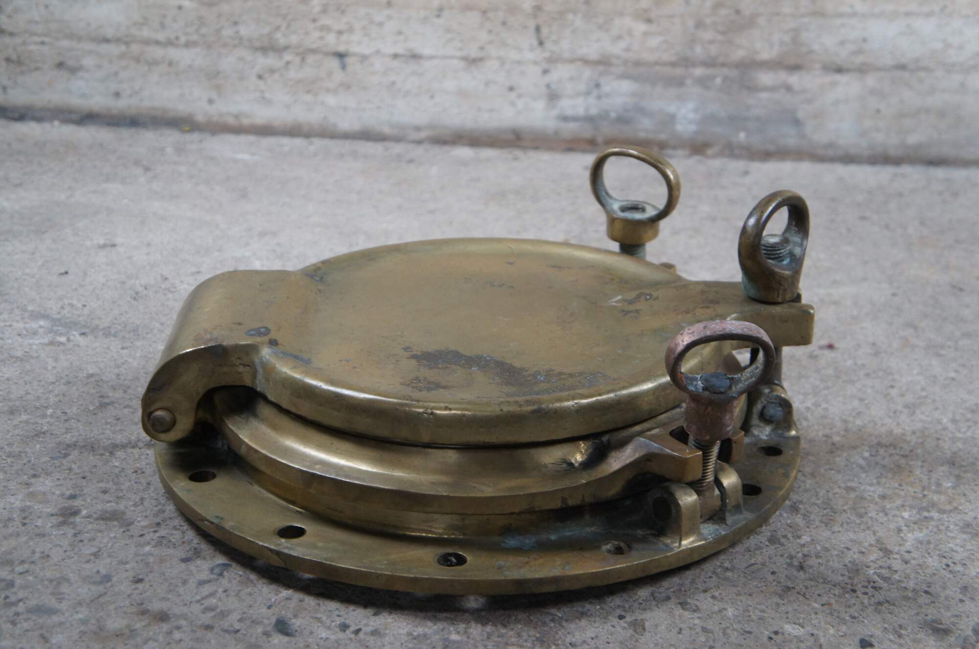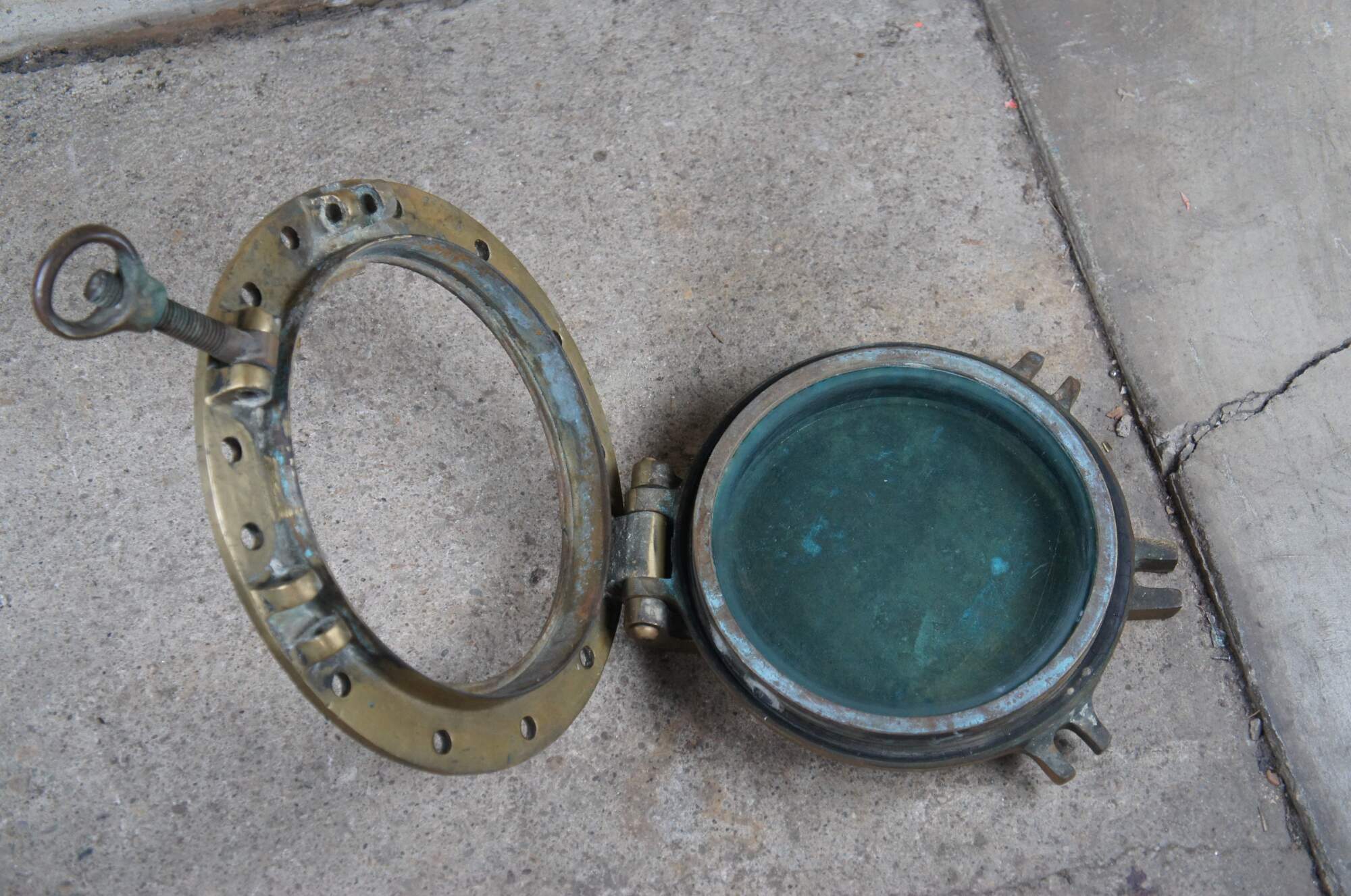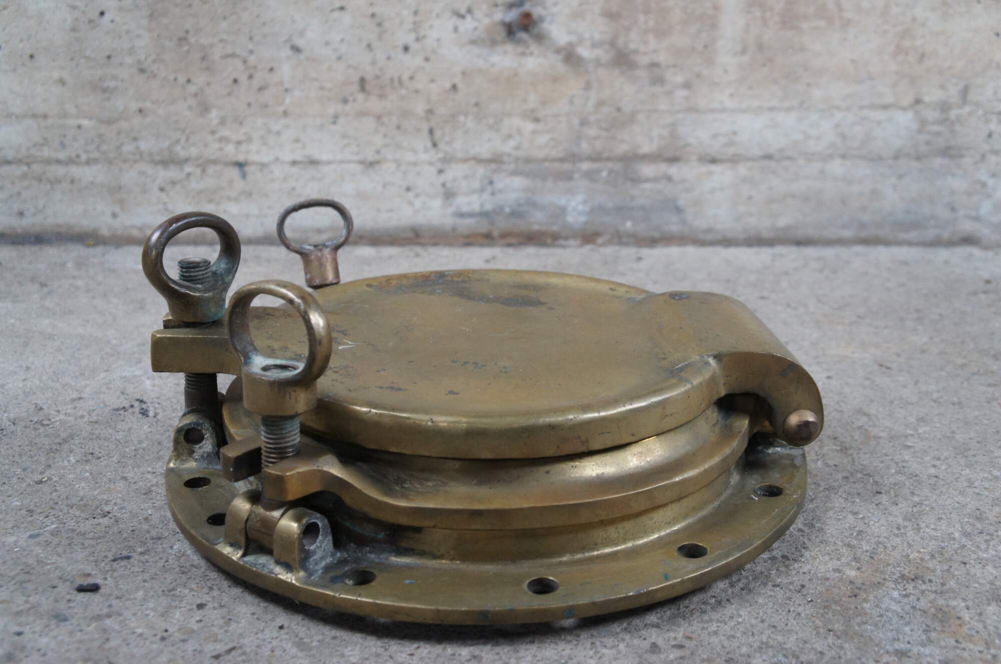 Extremely unique original antique heavy solid brass maritime Ship's Porthole or Hatch. A rare find with storm door, swing plate and barking plate. Its very unusual to find a complete porthole with swing plate. They are most often found as just a barking plate or window with storm door. The majority are rather simple and made from aluminum or nickel plated rather than heavy brass like this unique specimen. The vast majority of portholes on the market today are modern or reproduction's. This aged beauty is complete with original green glass and 3 dogs. High quality construction and hefty weight, 78 lbs. Marked No. 4, 6 along exterior