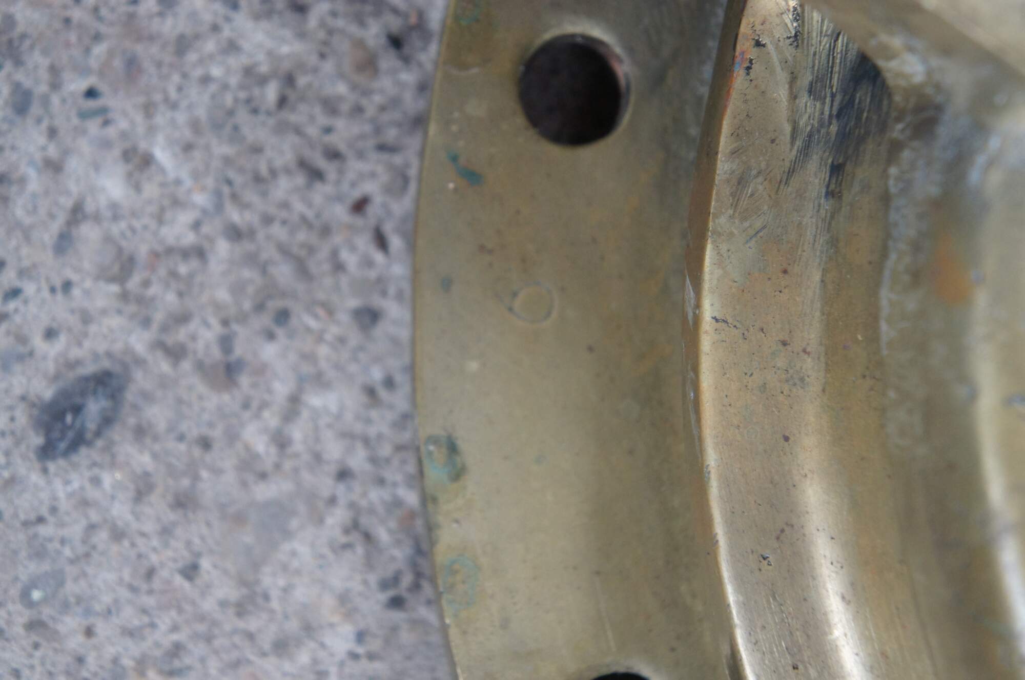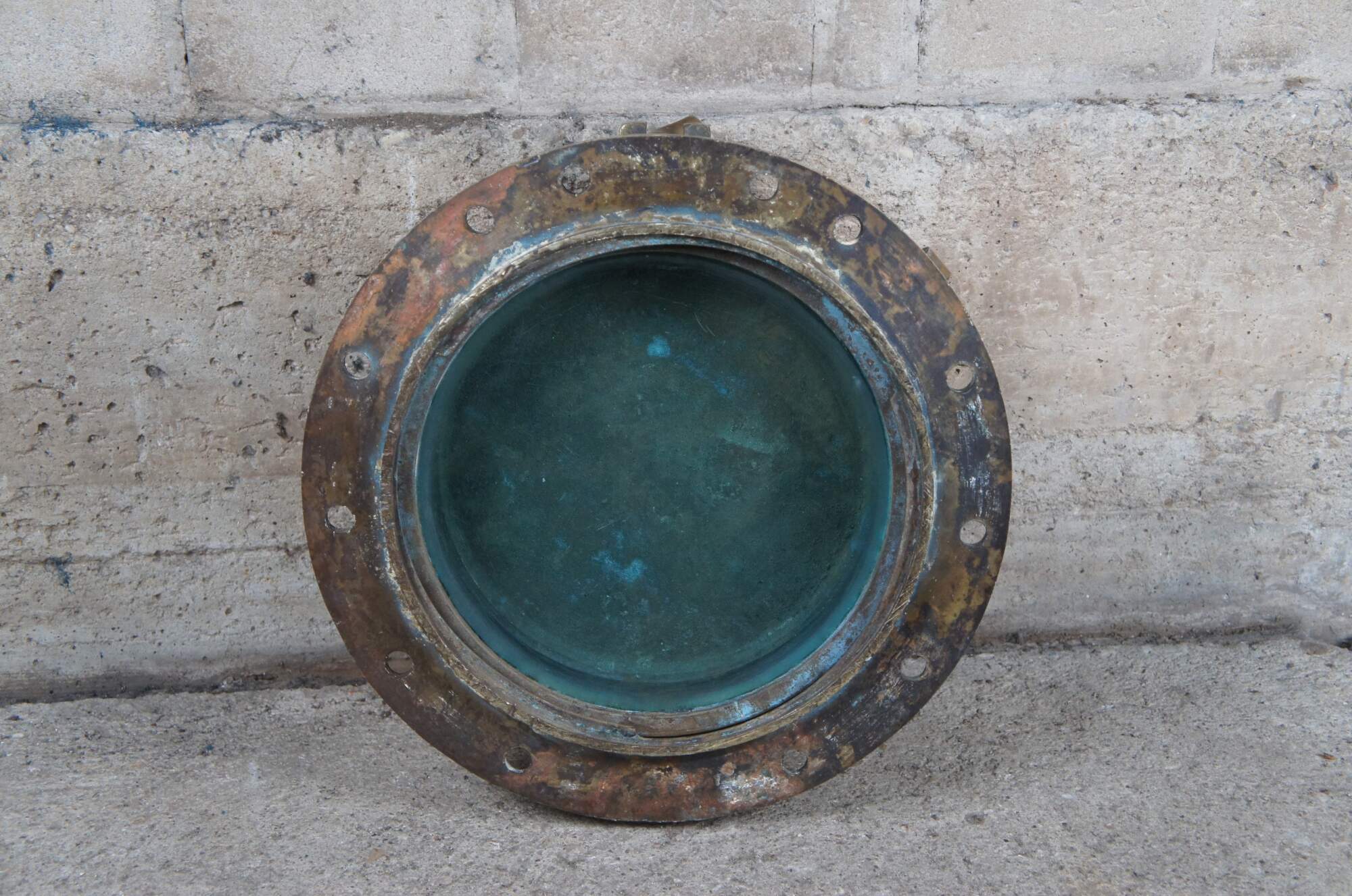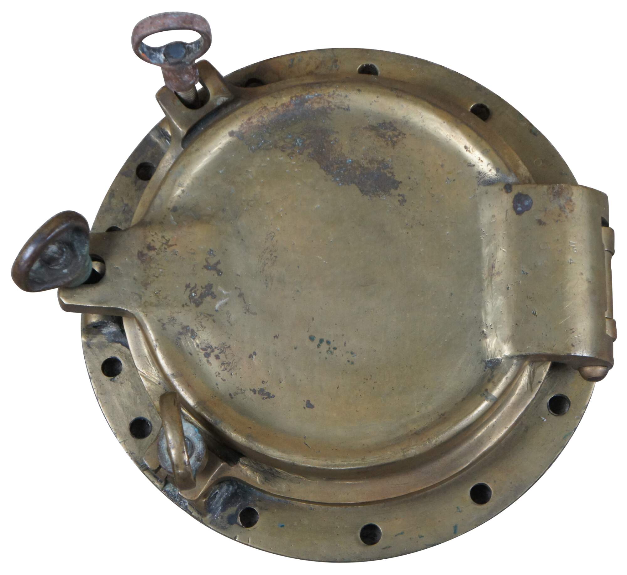 Extremely unique original antique heavy solid brass maritime Ship's Porthole or Hatch. A rare find with storm door, swing plate and barking plate. Its very unusual to find a complete porthole with swing plate. They are most often found as just a barking plate or window with storm door. The majority are rather simple and made from aluminum or nickel plated rather than heavy brass like this unique specimen. The vast majority of portholes on the market today are modern or reproduction's. This aged beauty is complete with original green glass and 3 dogs. High quality construction and hefty weight, 78 lbs. Marked No. 4, 6 along exterior