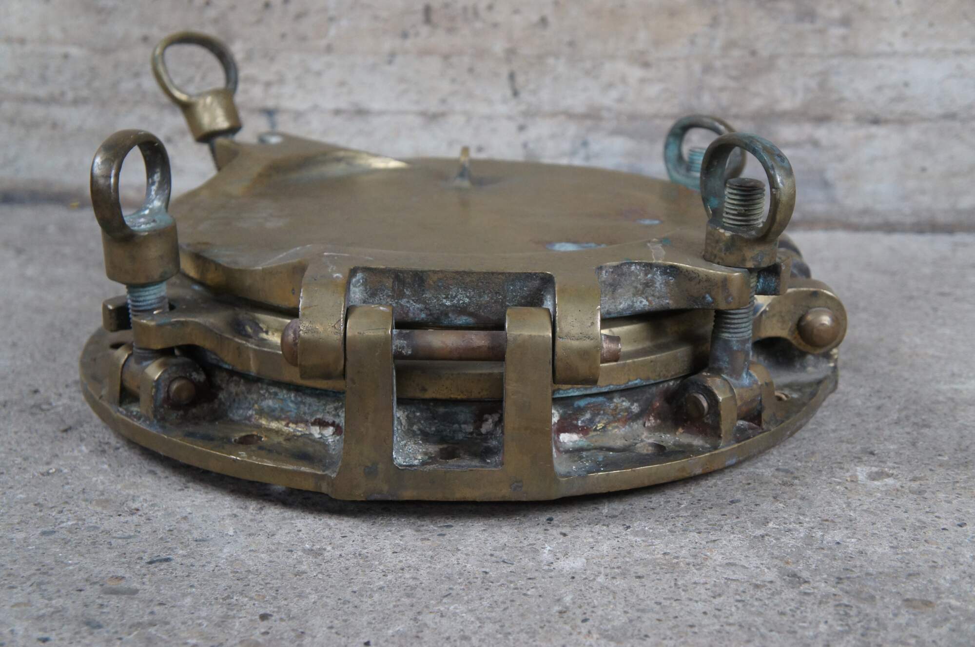 Extremely unique original antique heavy solid brass maritime Ship's Porthole or Hatch. A rare find with storm door, swing plate and barking plate. Its very unusual to find a complete porthole with swing plate. They are most often found as just a barking plate or window with storm door. The majority are rather simple and made from aluminum or nickel plated rather than heavy brass like this unique specimen. The vast majority of portholes on the market today are modern or reproduction's. This aged beauty is complete with original green glass and 4 dogs. High quality construction and hefty weight, 103 lbs. Marked 2260,26
