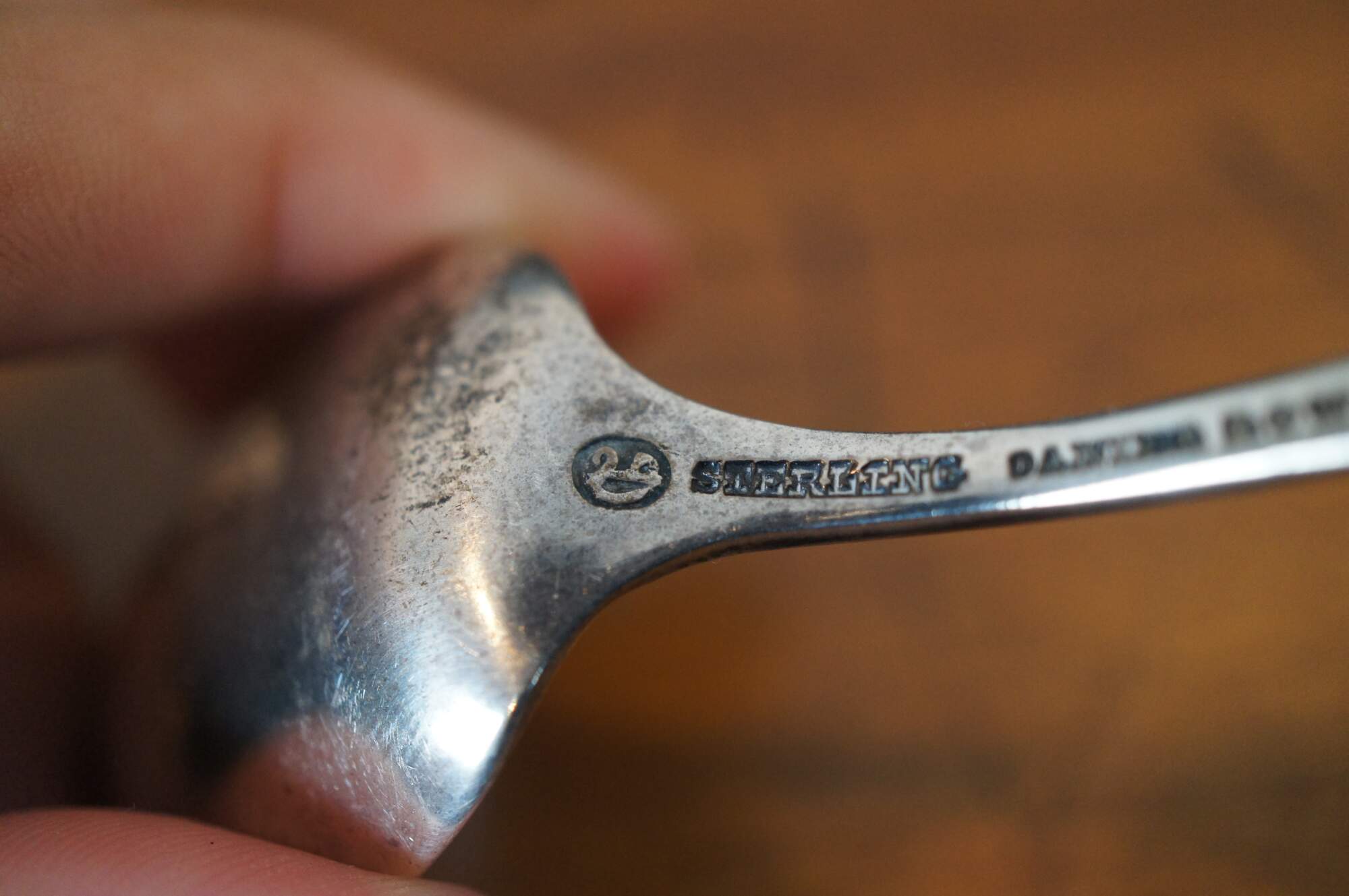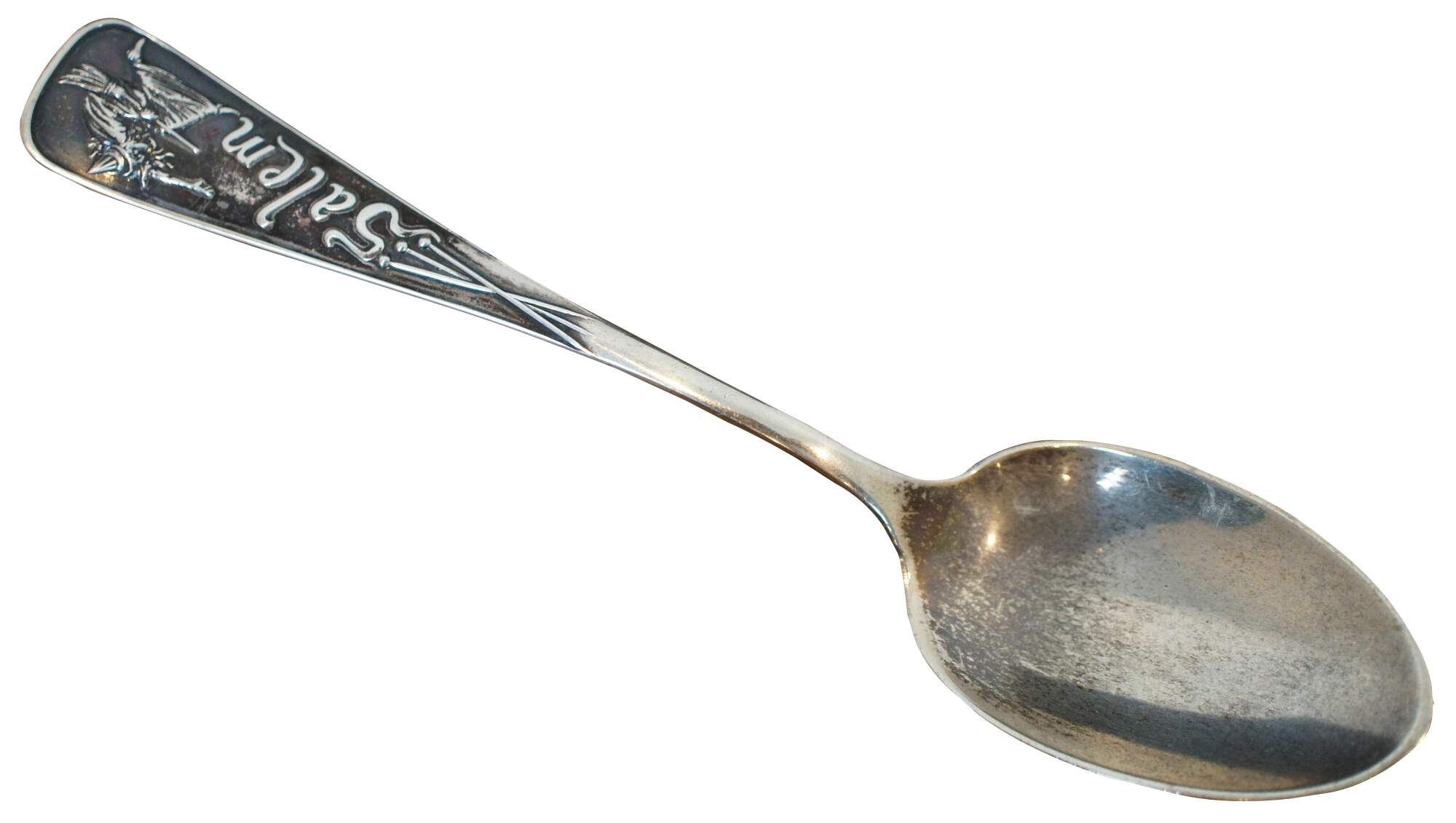 Antique late 19th century Durgin sterling silver Salem Witch souvenir spoon, sold by Daniel Low & Company. This spoon sports a simple squared off handle decorated with the word Salem flnanked by three pins and a witch holding a broomstick. “On a trip to Europe in 1890, Daniel’s son Seth Low (1867-1939) noticed tourists purchasing souvenir spoons from various cities they had visited. On his return home, Seth commissioned a simple design for a sterling silver spoon with the image of a witch, three “witch pins,” and the word “Salem.” This spoon is considered the first “official” souvenir of the “Witchcraft delusion” sold in the city. According to contemporary historian George B. James in 1891, Salem was becoming a popular destination for those curious about the Witch Trials of 1692. He explained that the three witch pins on the spoon were the same as those “preserved at the Court House in Salem.” These straight pins were said to be evidence presented during the trials, used to inflict harm by the accused witches during the city’s period of hysteria.”