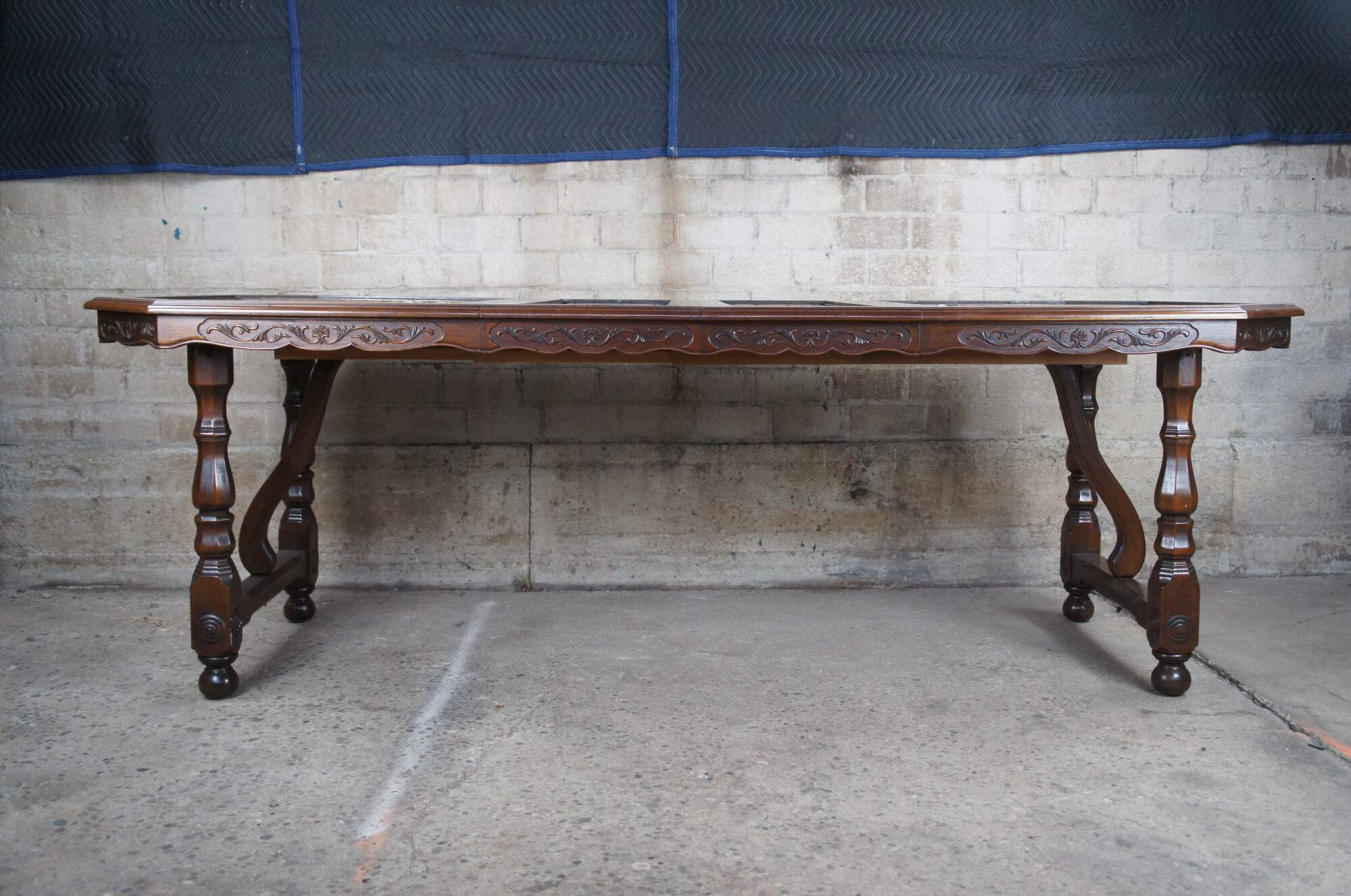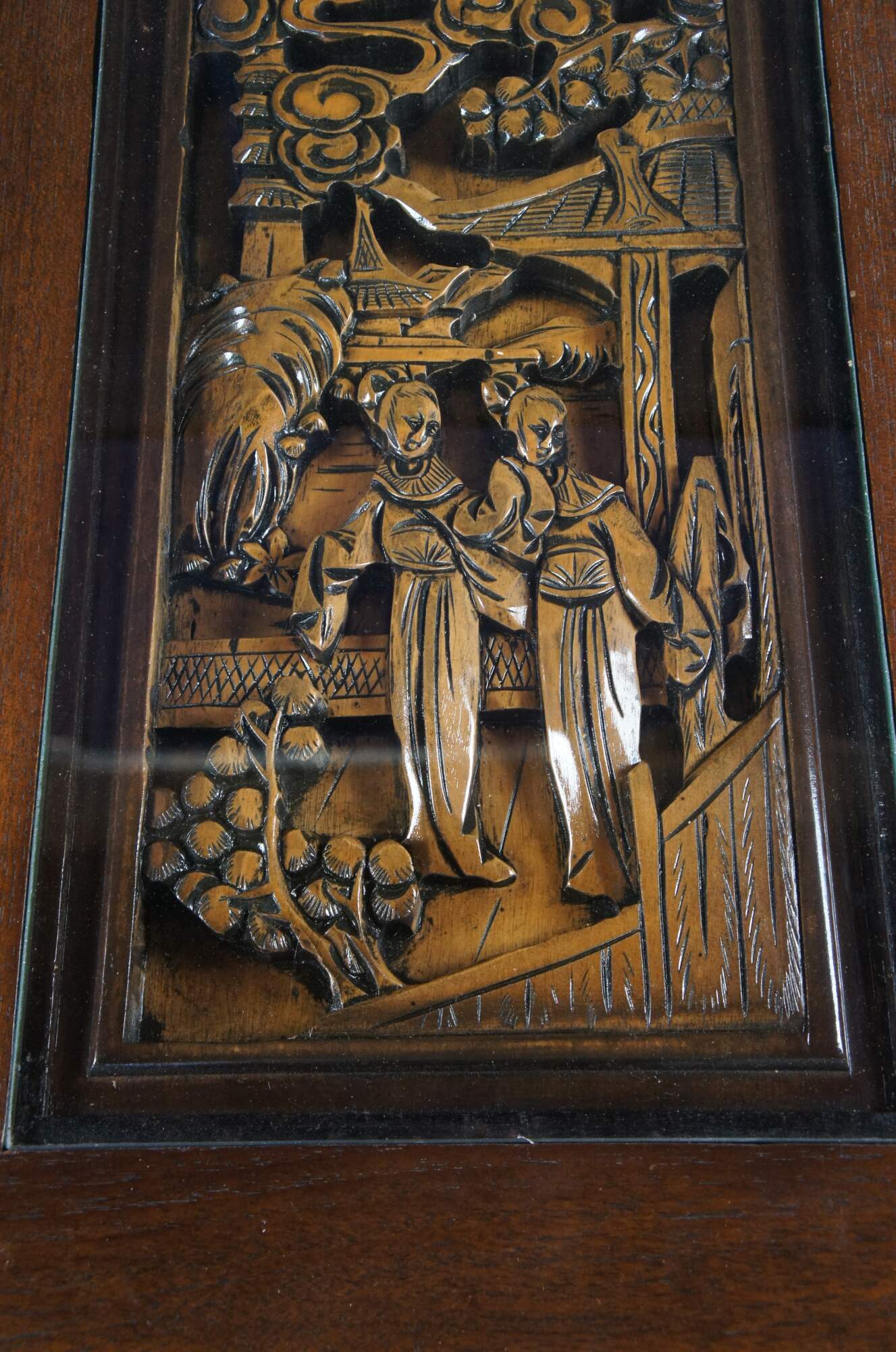 An impressive oriental dining room set that made in Okinawa Japan, circa 1970s. Hand crafted from oak with high relief intricately carved village scenes with figures inset into the table top. Each section is protected by removable glass tops. Features a serpentine floral carved table apron over turned legs leading to bun feet. An eye catching table that will make for a great conversation piece.
