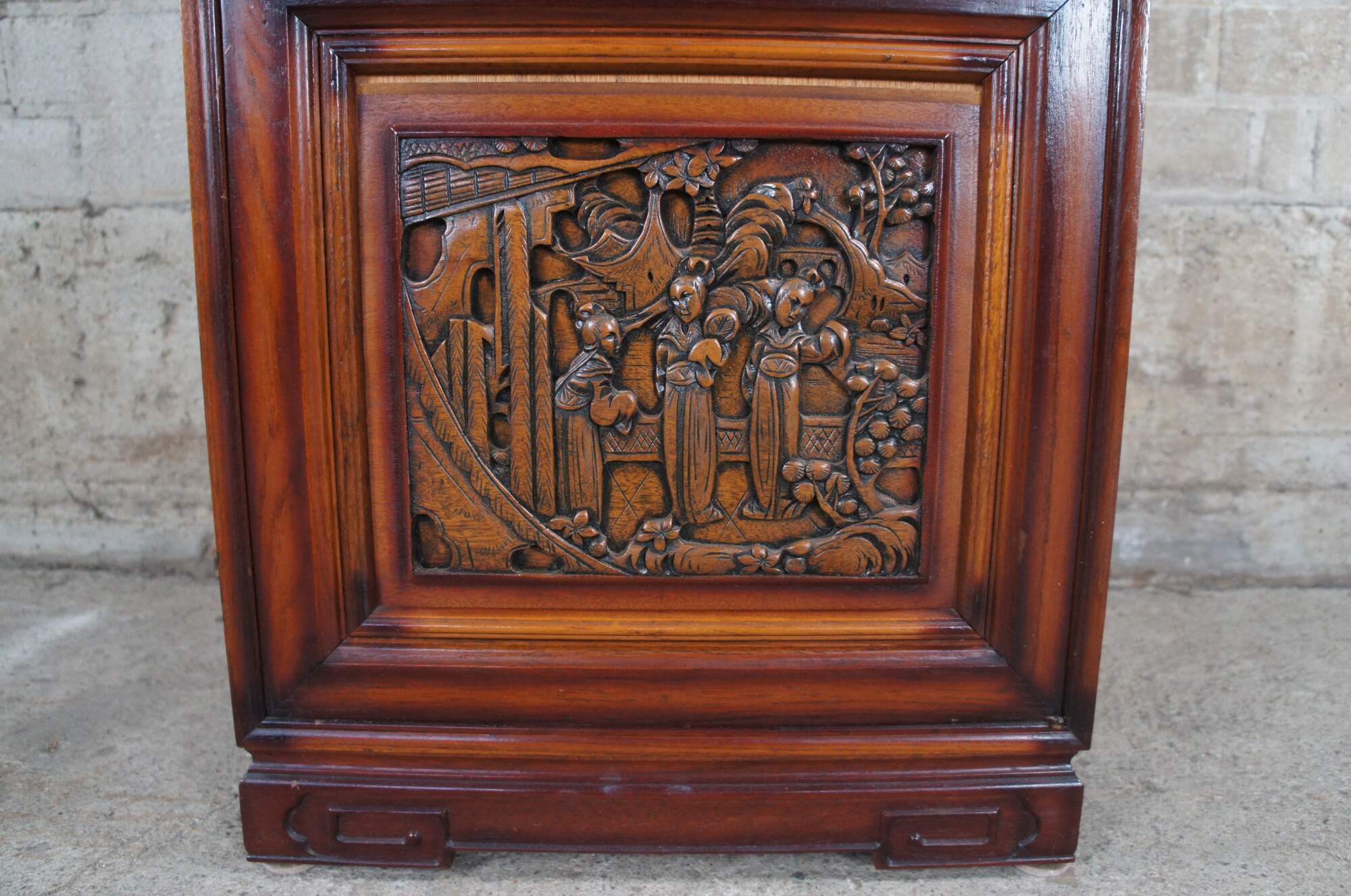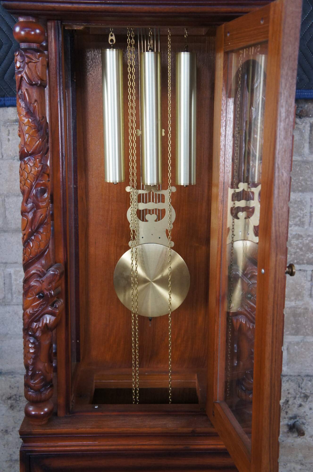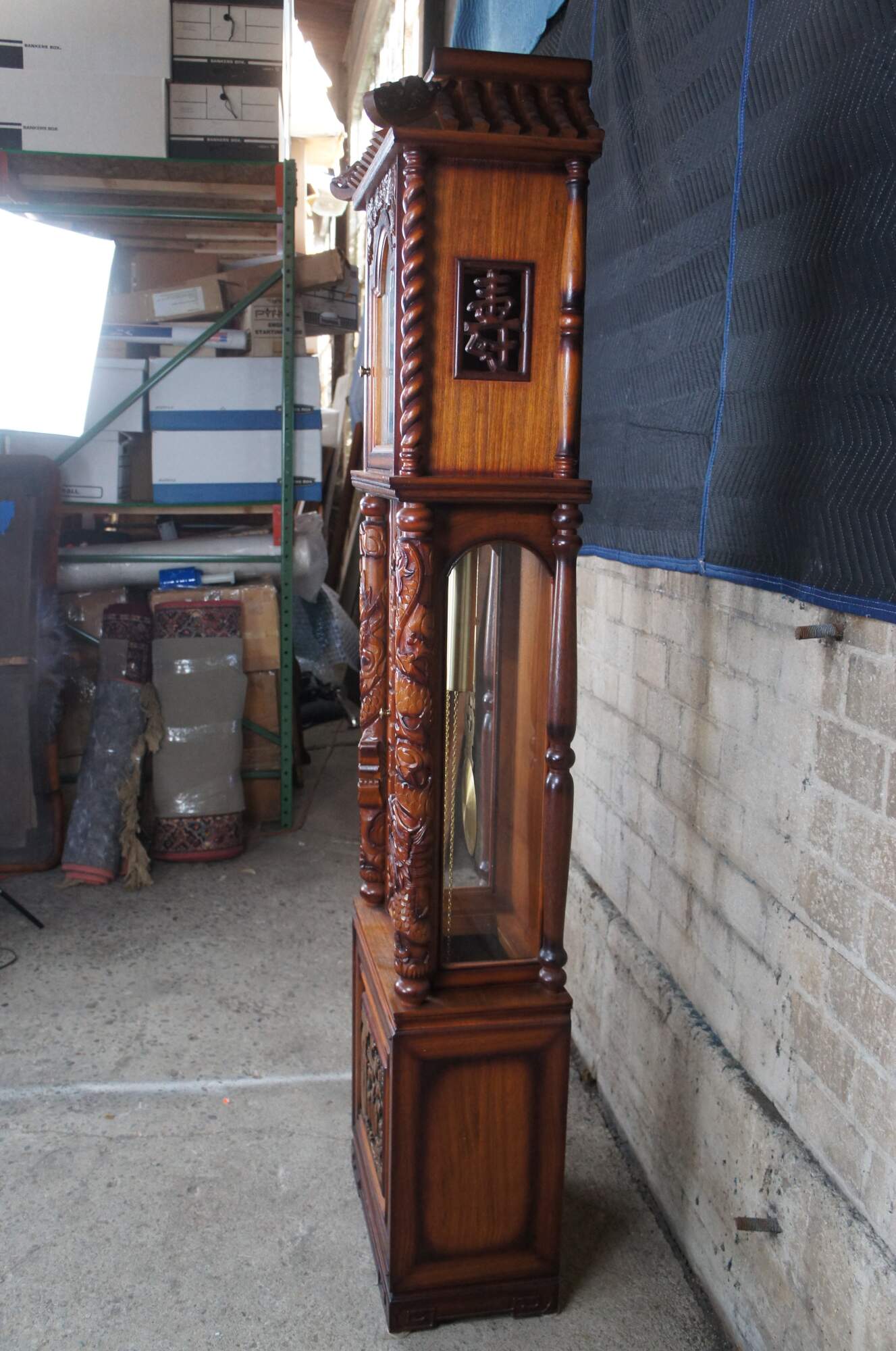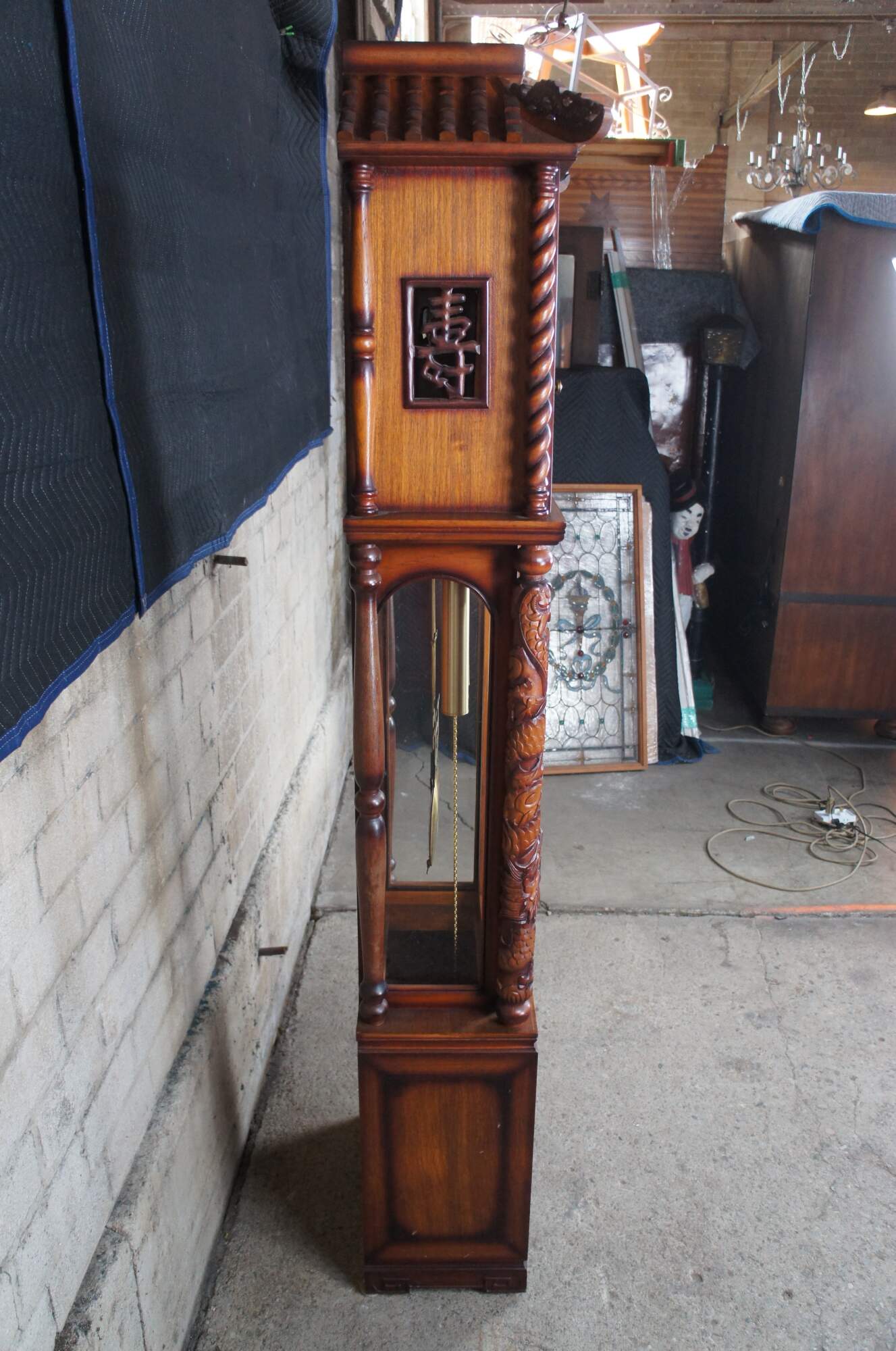 An impressive oriental chinoiserie Tempus Fugit Grandfather Clock made in Okinawa Japan, circa 1970s. Hand Crafted from oak with pagoda form crown and dragon motif throughout. Features central windows flanked by barley twisted and dragon carved posts. The arched central window is surrounded by Greek key carving and rests over a beautiful lower panel with low relief geisha carved scene. The sides of the clock are are open at the center allowing the pendulum and weights to be seen from all angles. The upper portion has a pierced calligraphy window besides the clock allowing the chimes to warm your room when striking.