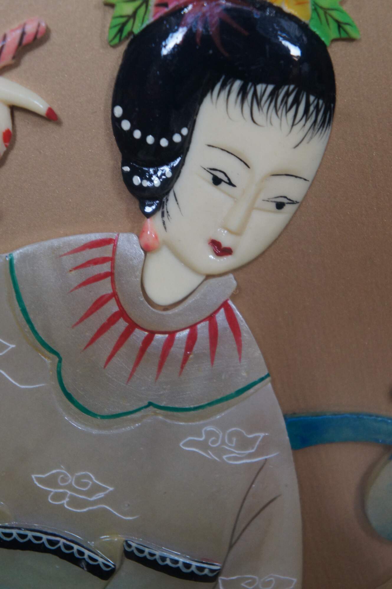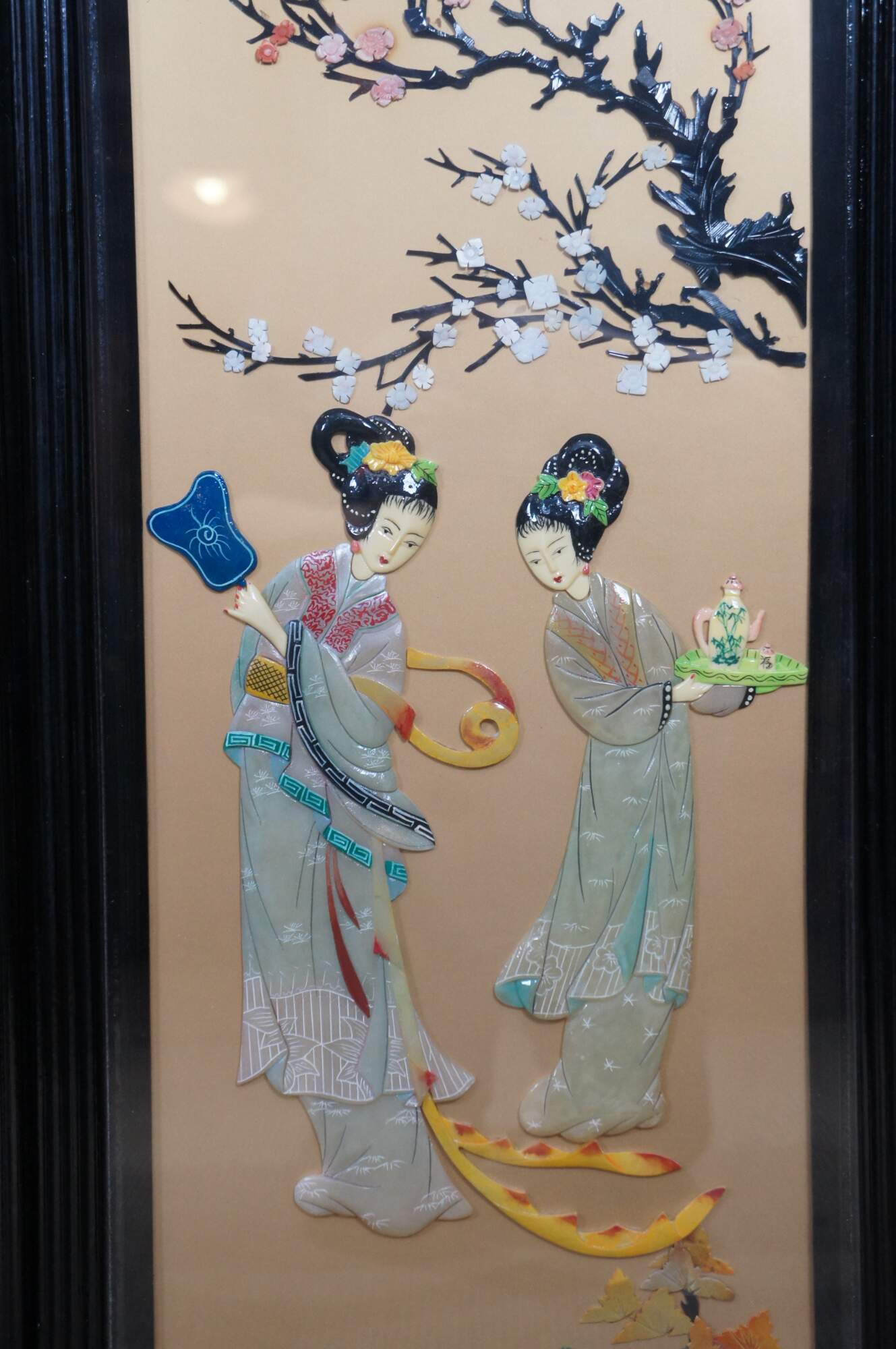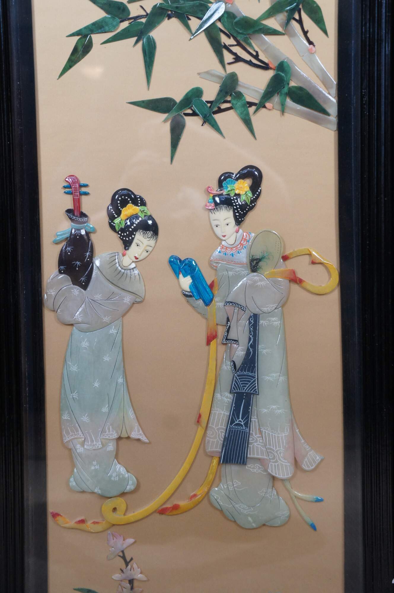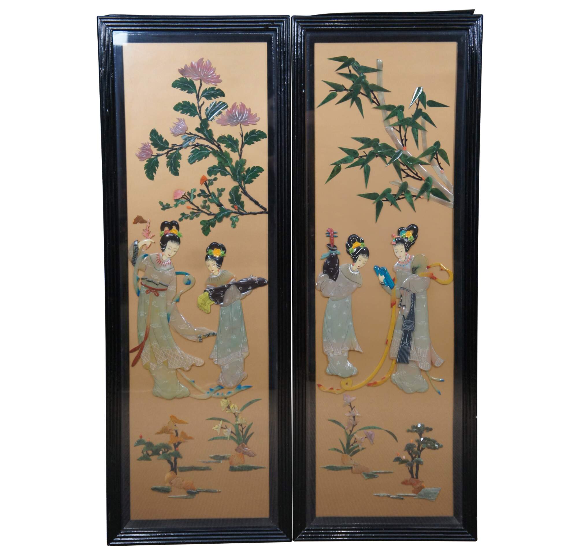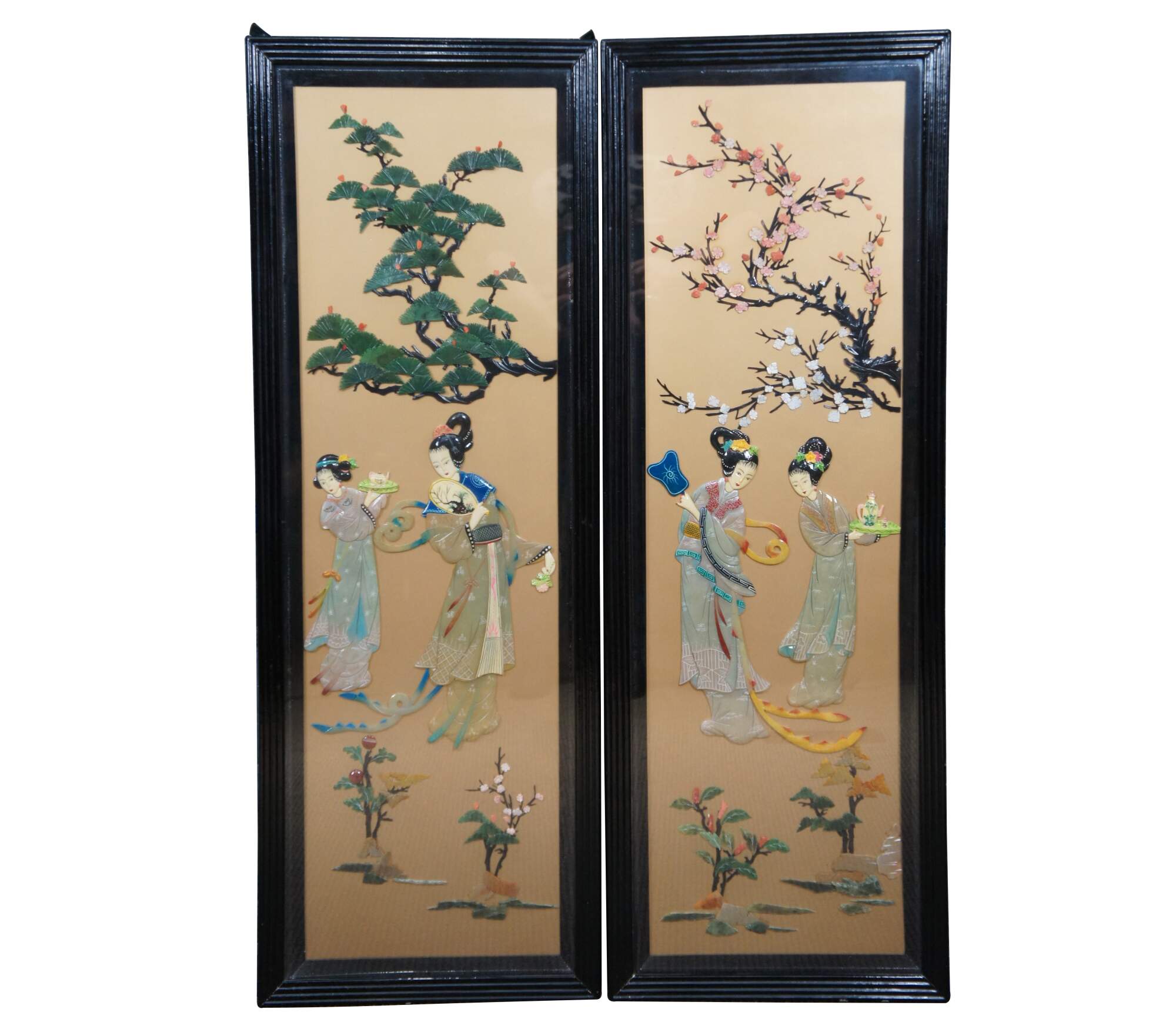 Set of four mid 20th century Japanese Chinoiserie panels in black lacquered wood with gilded backgrounds, featuring pairs of female Geisha figures in traditional attire holding scrolls, tea sets, instruments, fans, under a variety of trees, delicately carved from soapstone, coral, malachite and other semi-precious stones.