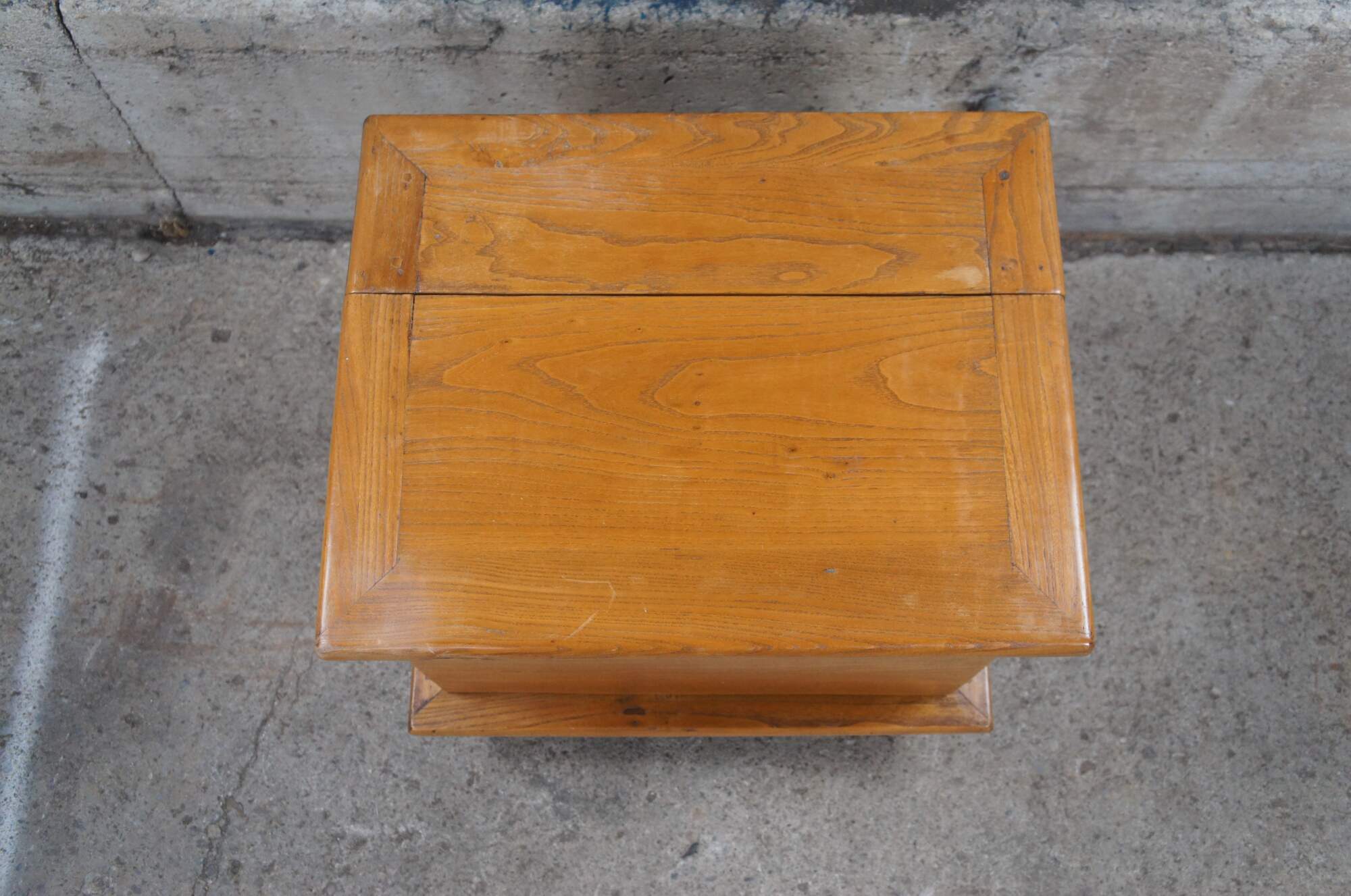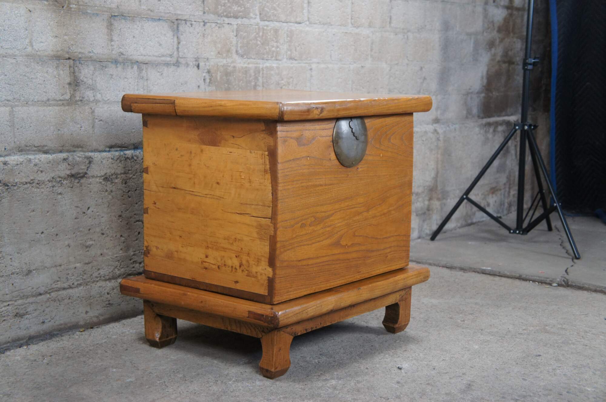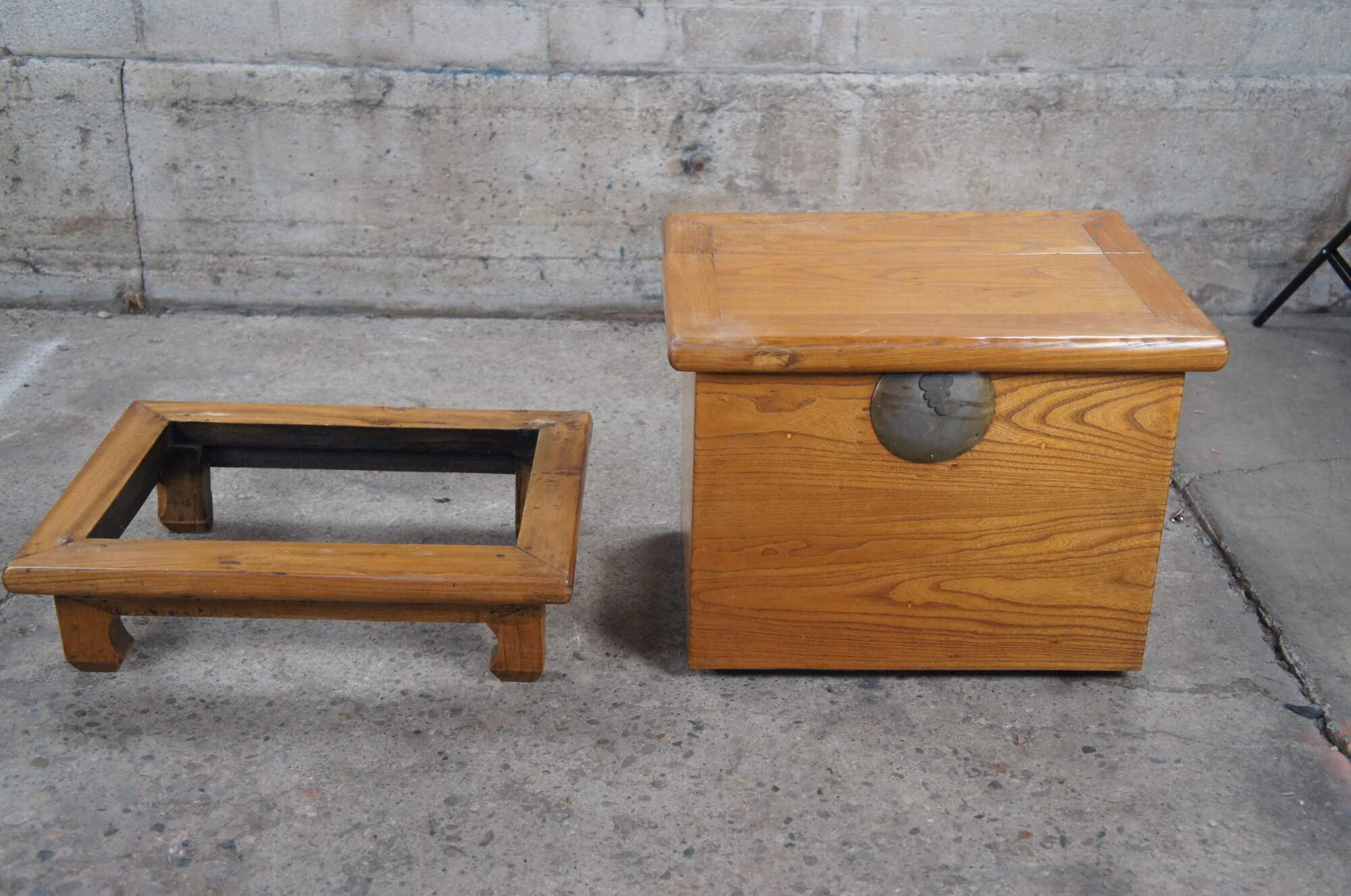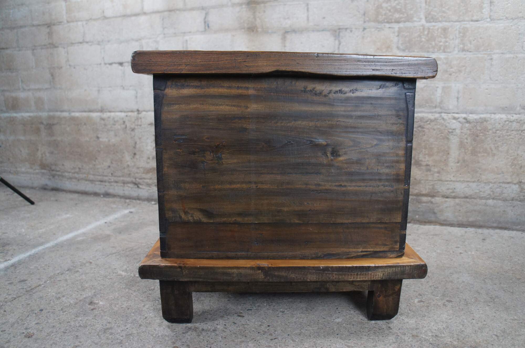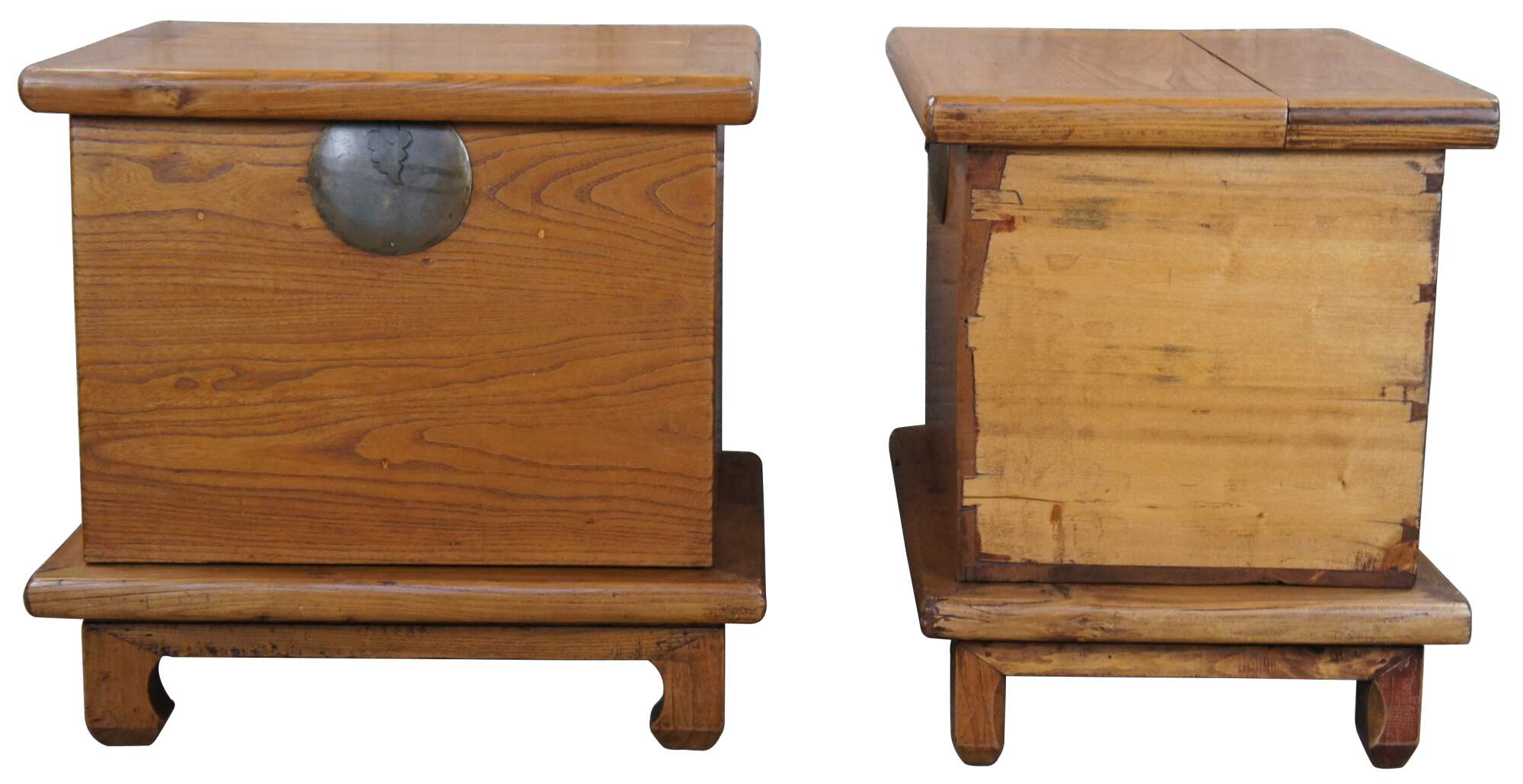 An exquisite pair of early Chinese Qing Dynasty chests on stands from the Shanxi Provenance, Circa 1750s. Made from elm with Ming inspired mortise and tenon bases supporting each lidded trunk. Each chest exhibits beautiful patina with hand dovetailed construction and decorative metal moon hardware. A veratile set that would work well as bedside tables, blanket chests, or side tables.