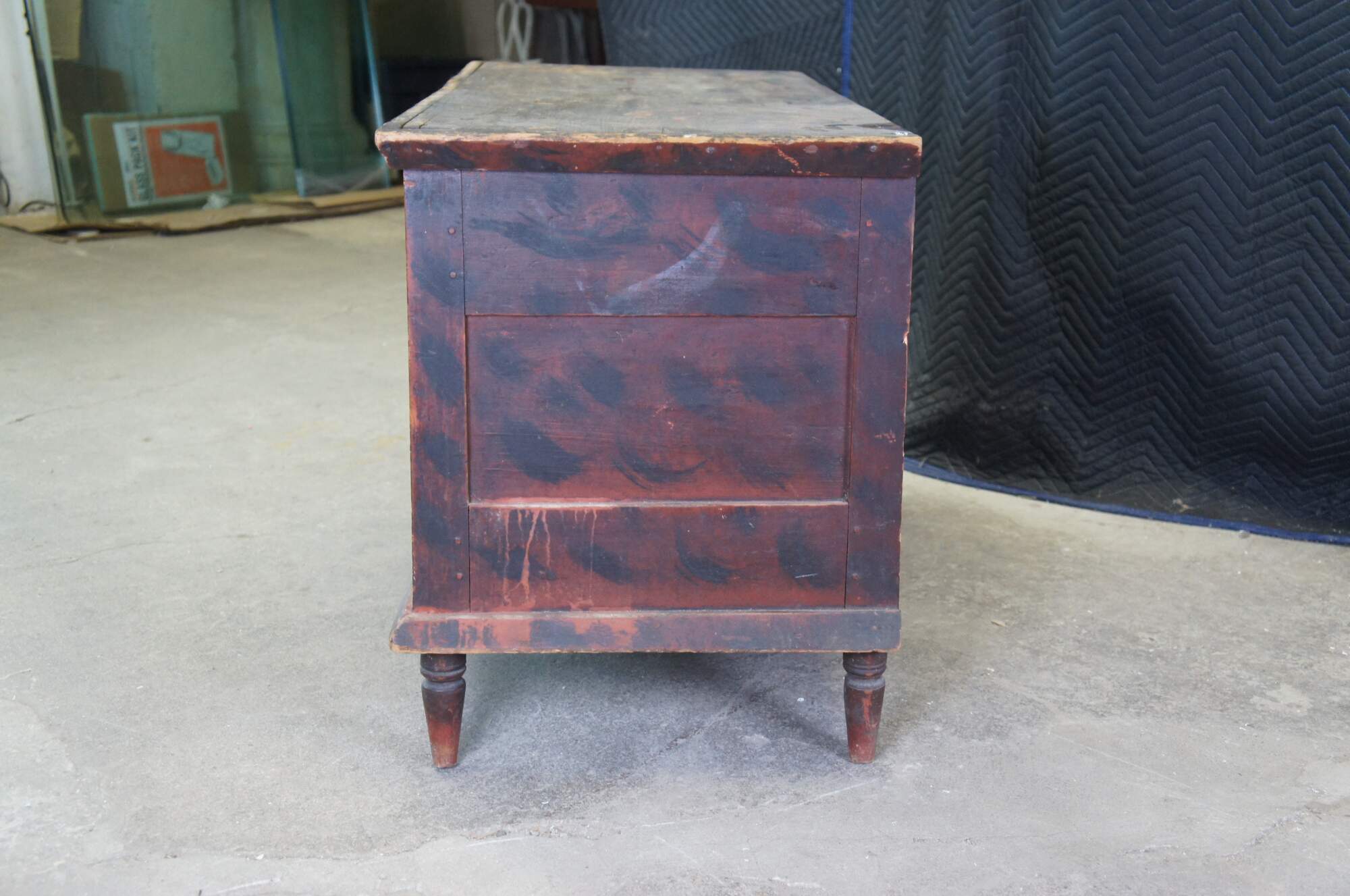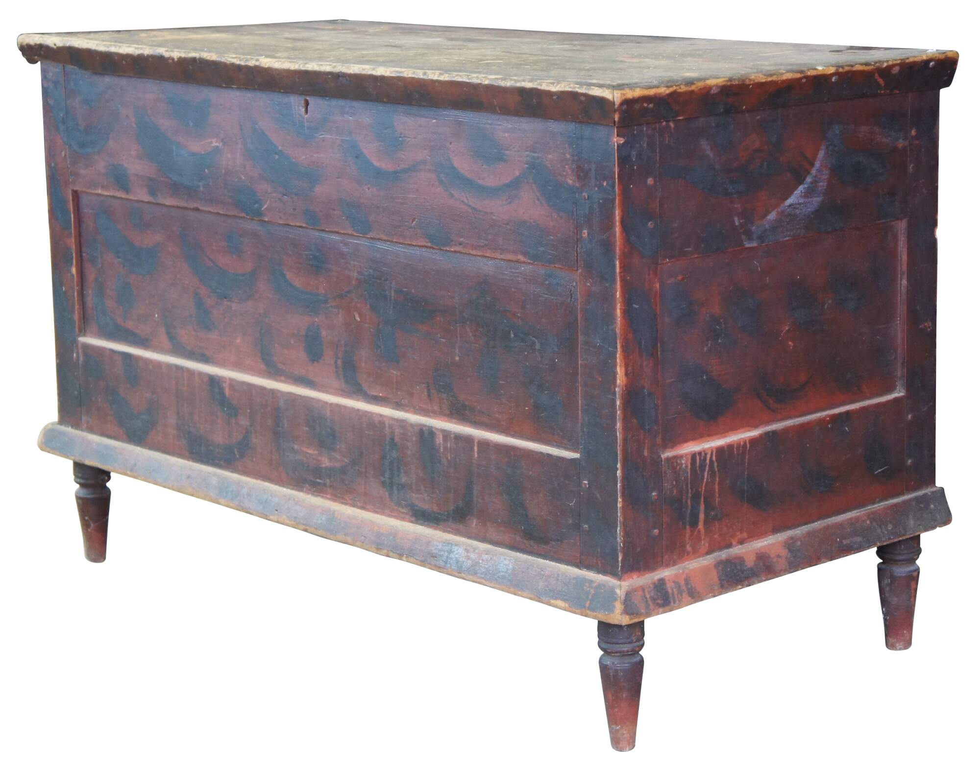 Antique early American folk art Pennsylvania German smoke painted pine blanket chest featuring turned feet and inner compartment. Circa 1st half of 19th century (1820s-1840s). Marked on backside with the initials MJP.