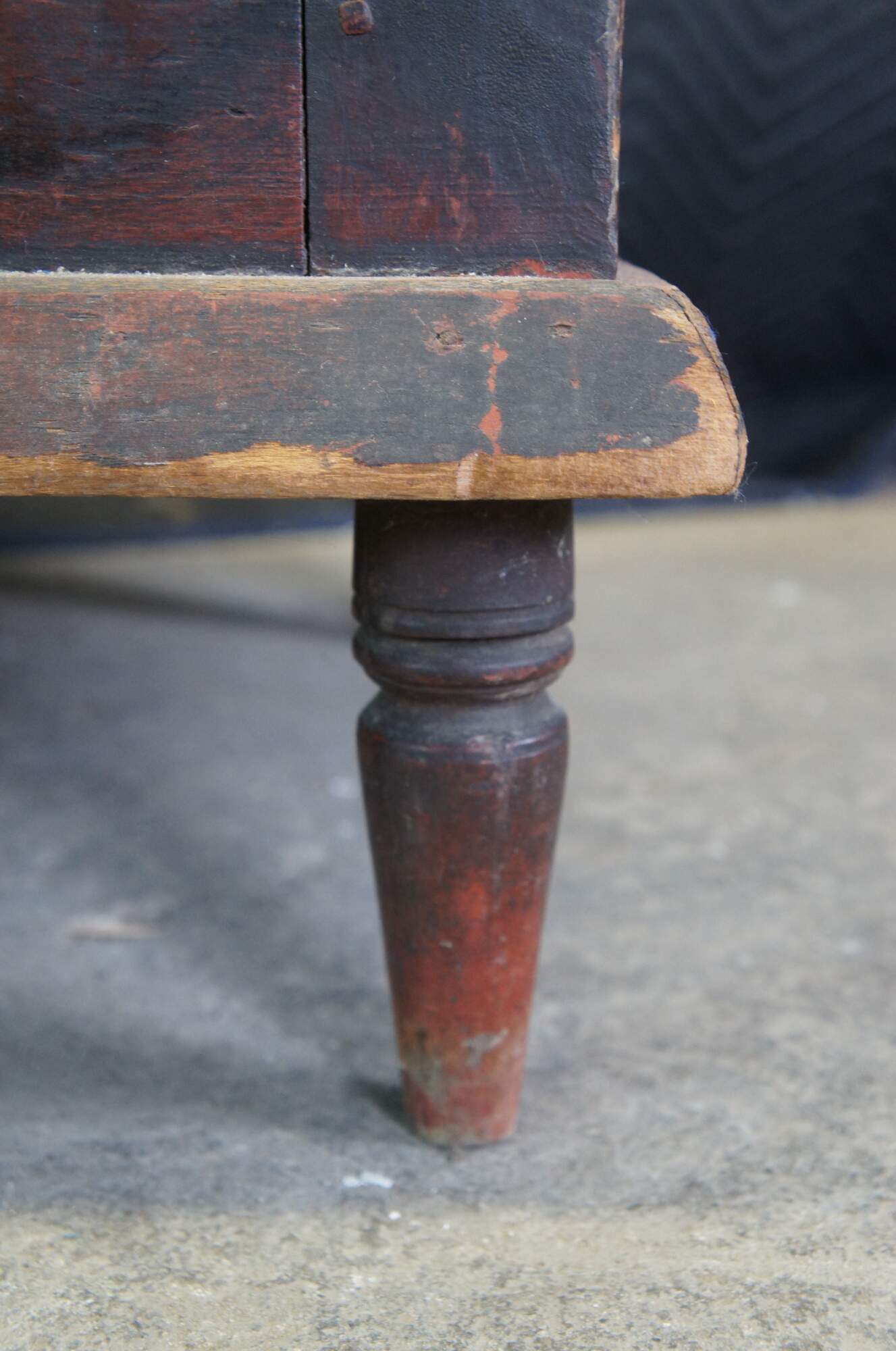 Good antique condition, wear and distressing commensurate with age and use, finish / paint loss, wear, wood loss, splitting, fading. Lid no longer has hinge