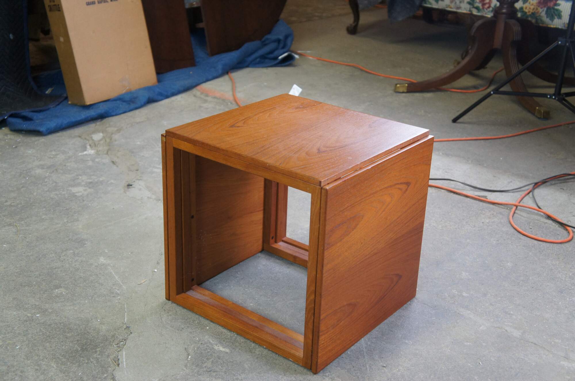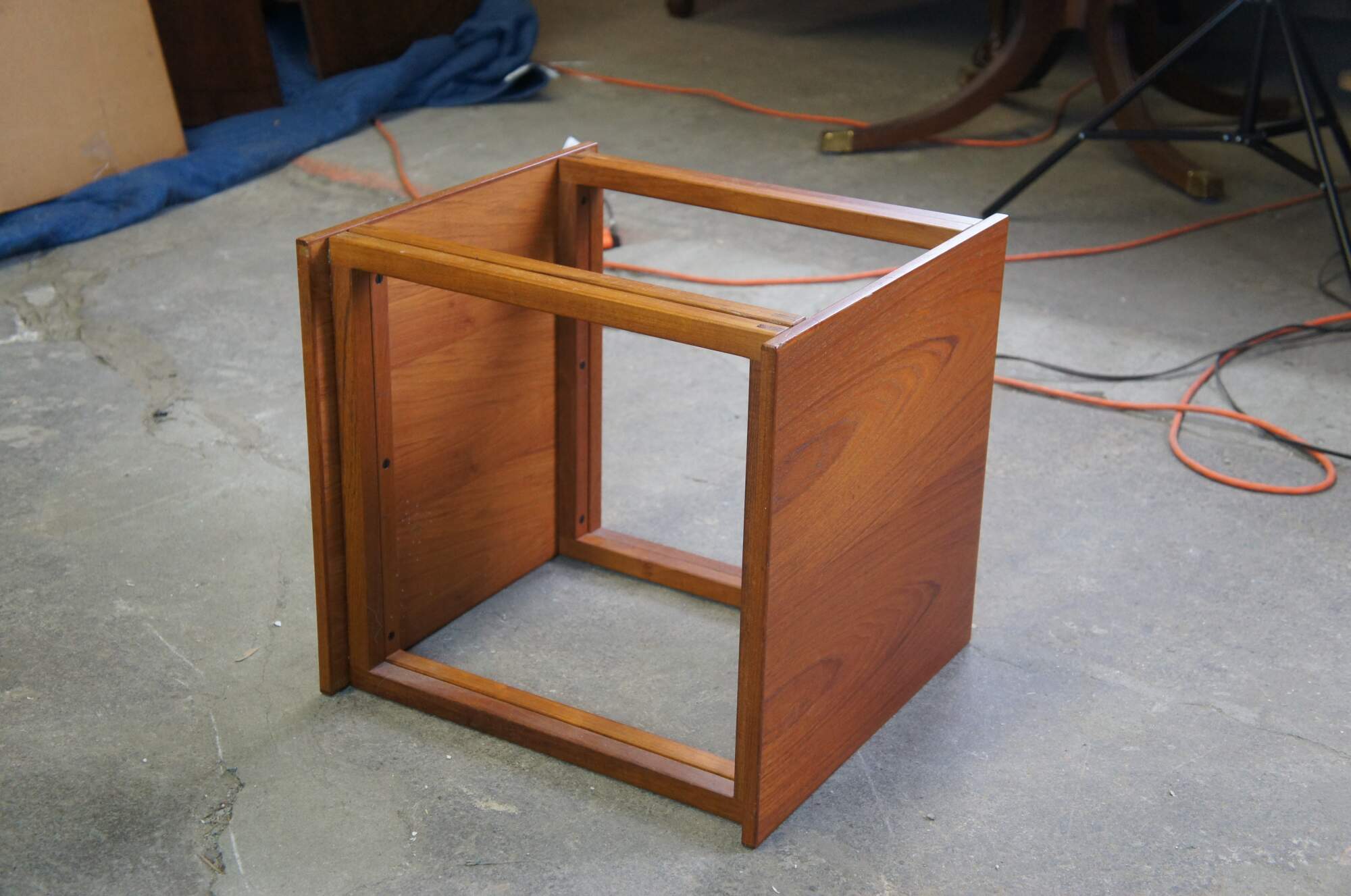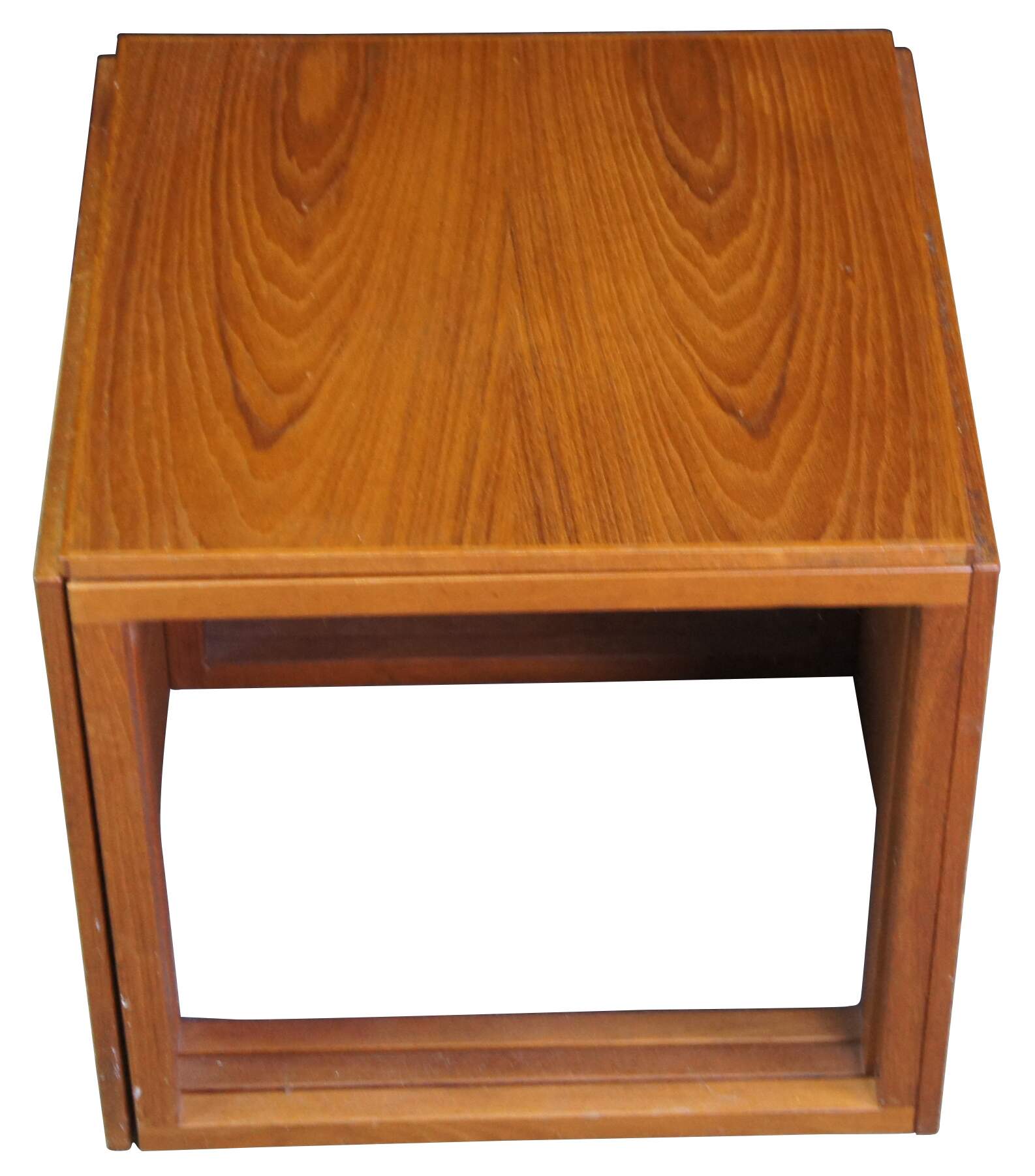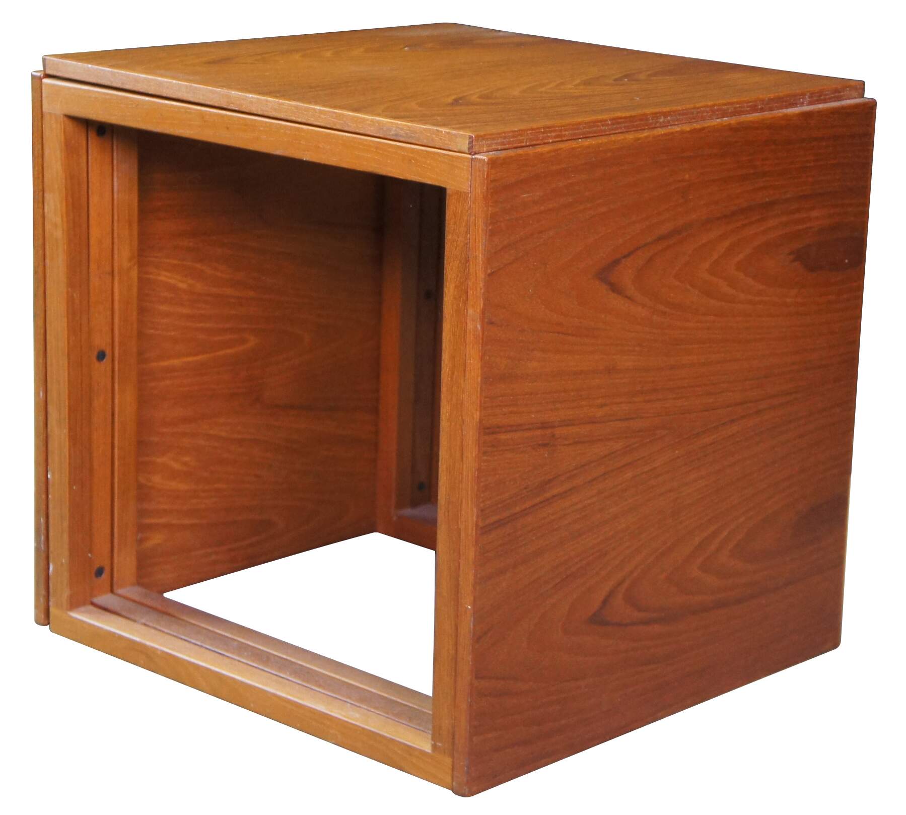Mid Century Modern Danish cube tables by Kai Kristiansen for Vildberg Mobelfabrik. Made of teak featuring square form with interlocking nesting design. Circa 1960s. Made in Denmark.