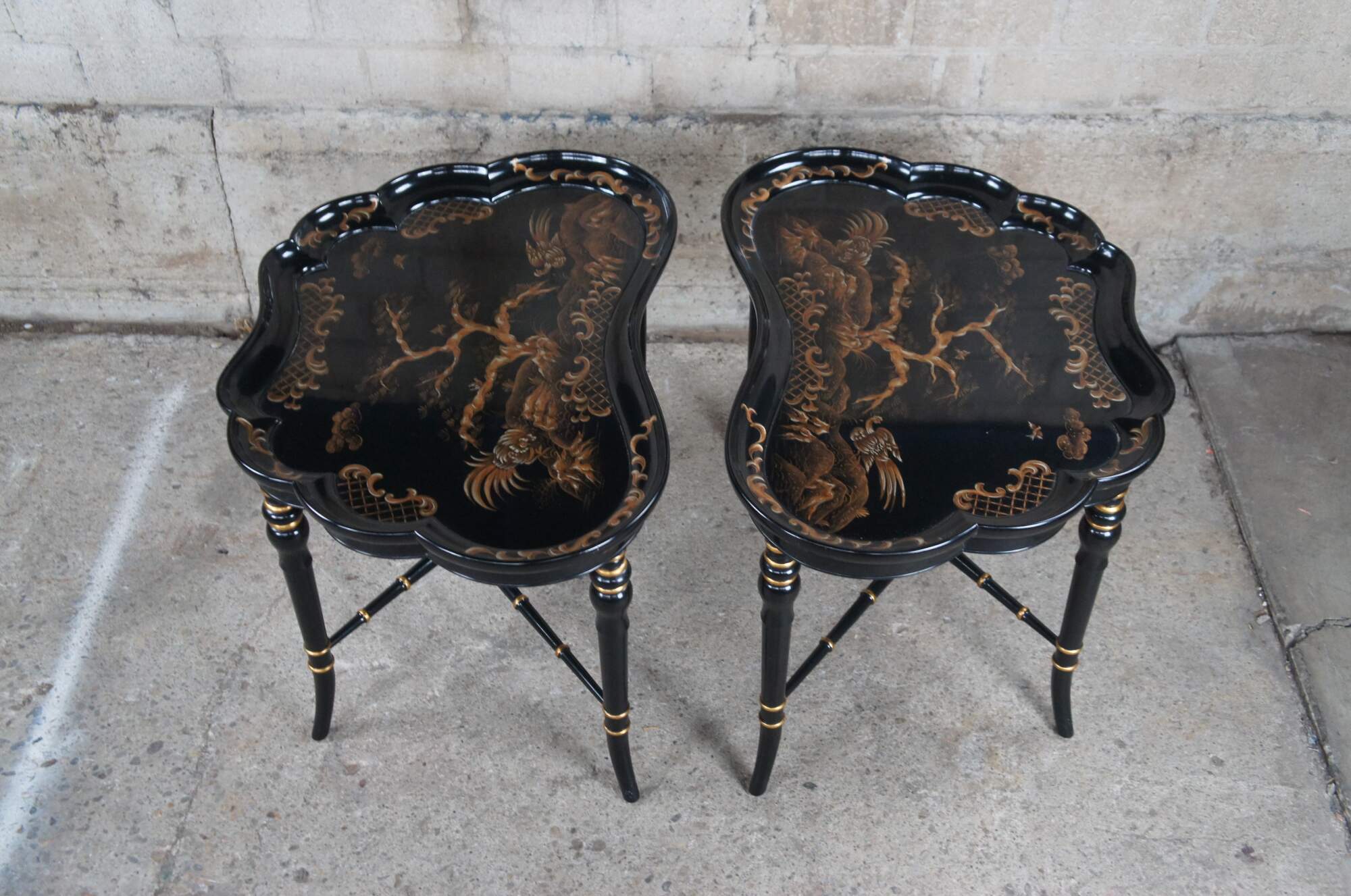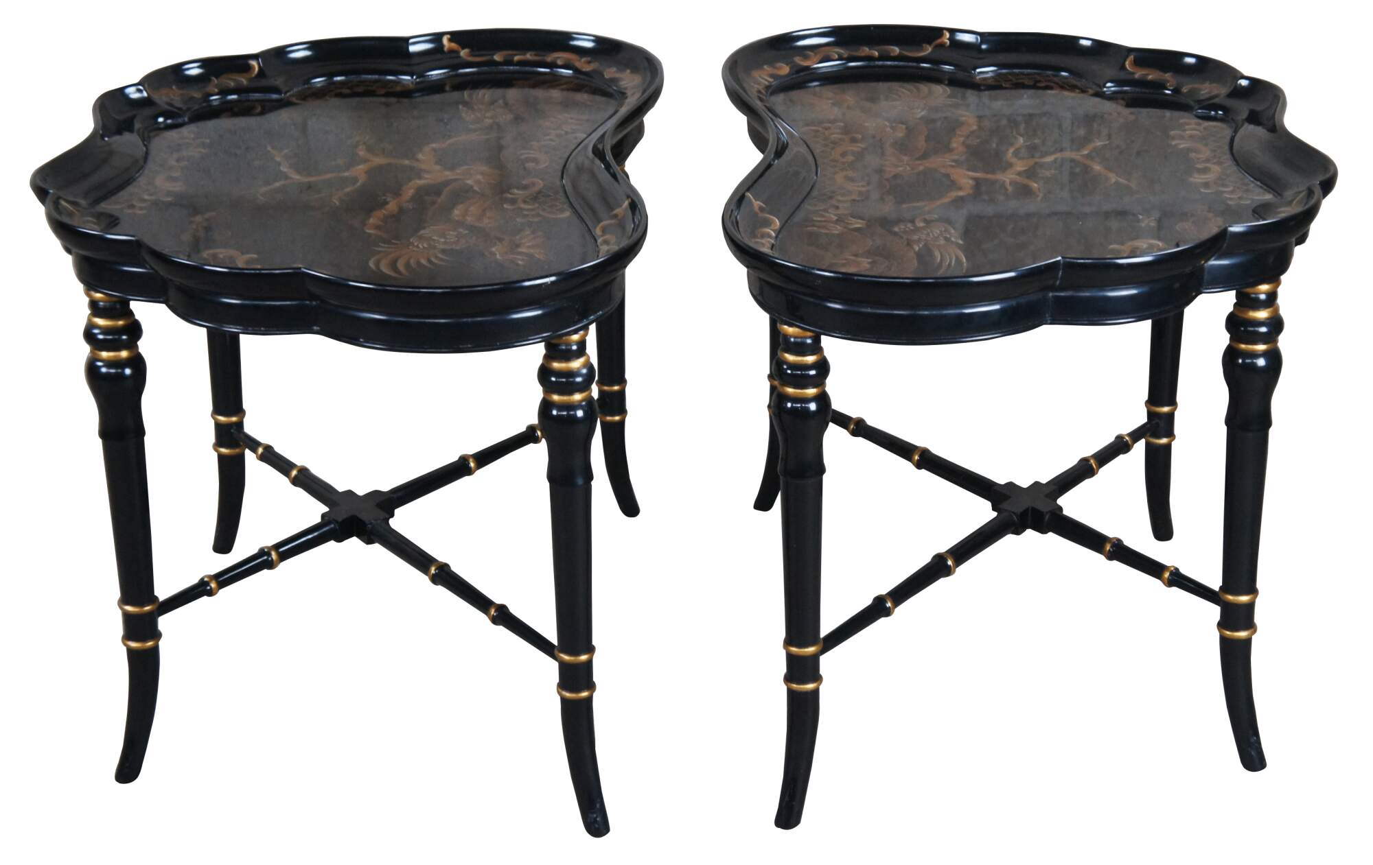 Two vintage English Regency style tray tables by Karges Furniture. Featuring black lacquered finish with a butterfly shaped top with gallery that surrounds a scene of two gamecocks and a old Bonsai tree. Supported by faux bamboo legs with gold accents connected by an X stretcher.