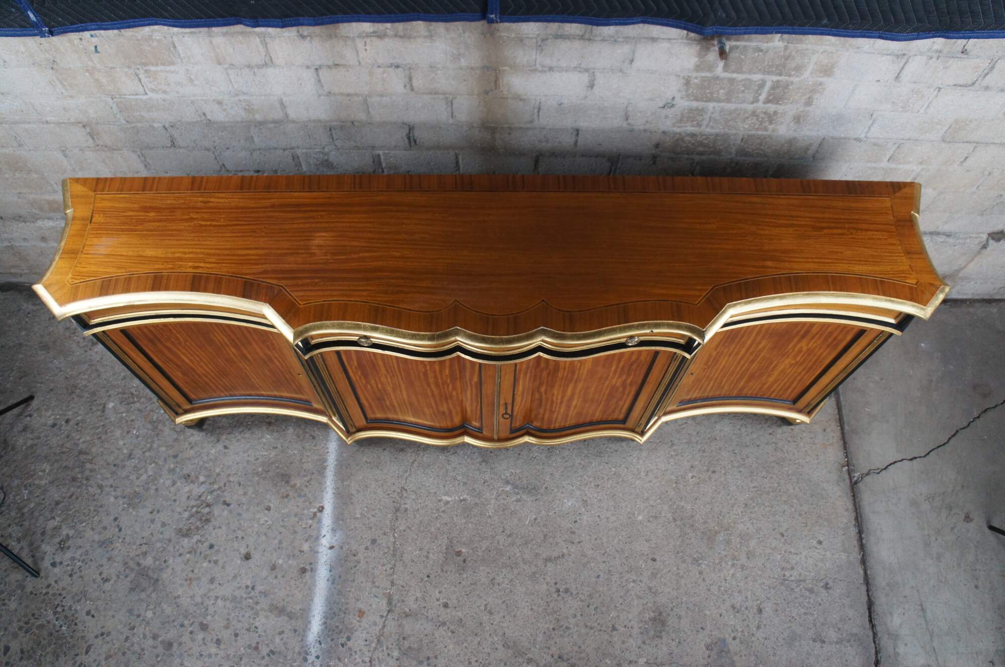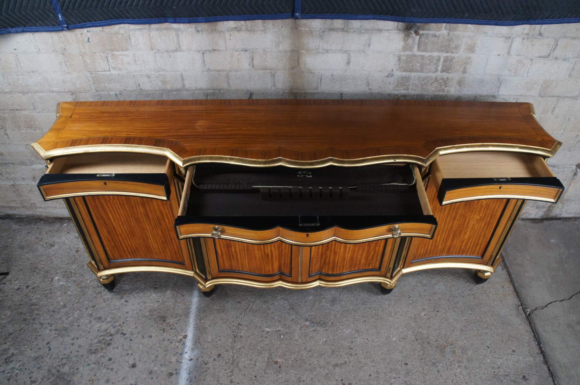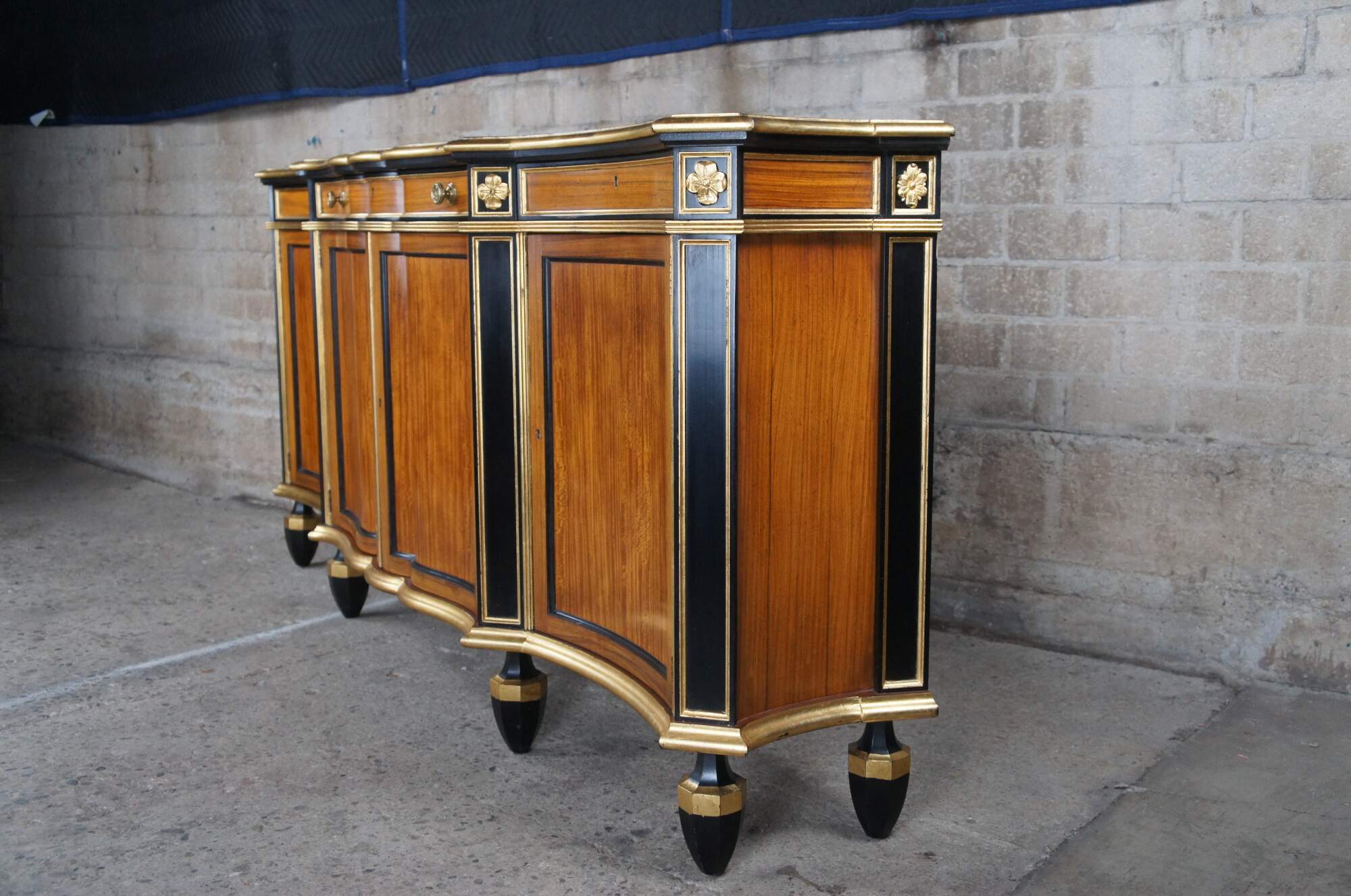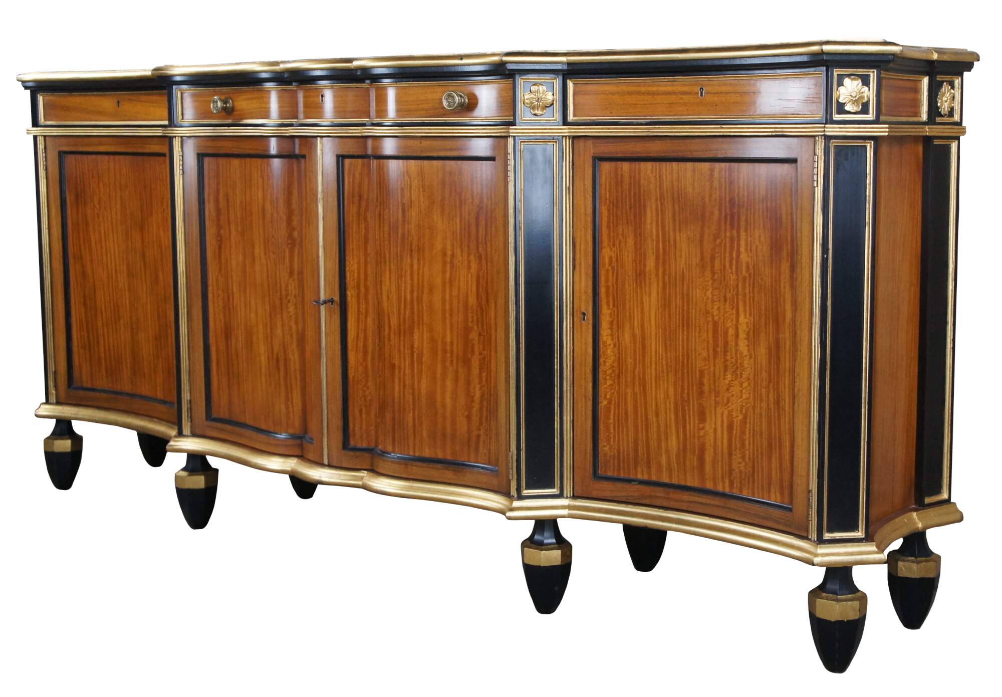 Exquisite dining room buffet, sideboard, server or hall console from The Stately Homes Collection #5230 by Baker Furniture. A serpentine form made from Satinwood with ebonized trim, carved rosettes at canted angles and giltwood borders. The frieze features a long oxbow drawer fitted with silverware insert and flanked by outer drawers for accessory storage. Lower section has three large cabinets with three adjustable shelves for china and dinnerware storage. The cabinet is raised on bold, octagonal, baluster shaped feet. Includes original key with functioning locks. Original sideboard c.1810 is housed in Alnwick Castle, Northumberland, England, owned by His Grace the Duke of Northumberland.'