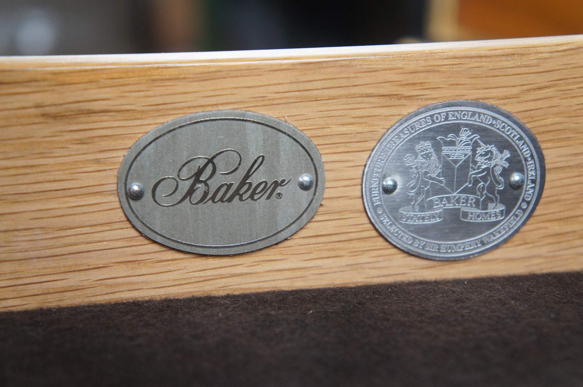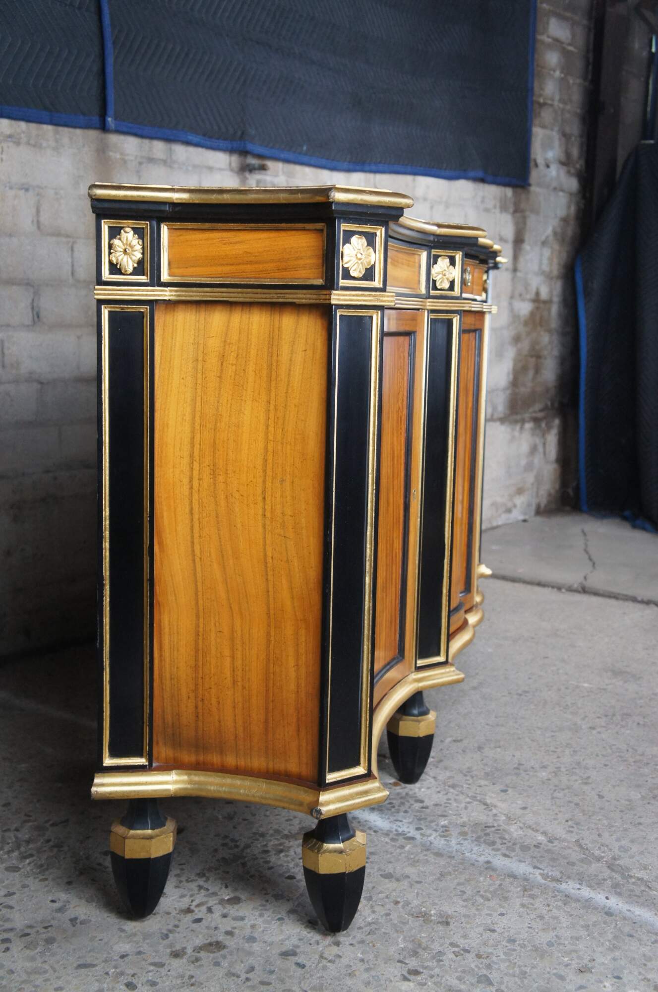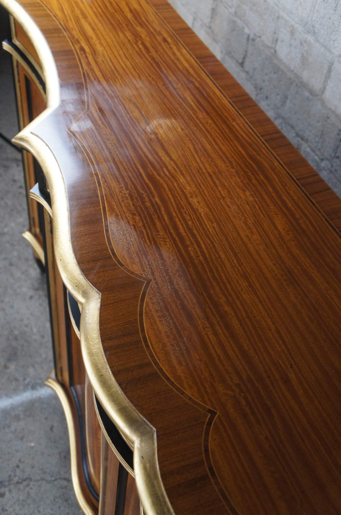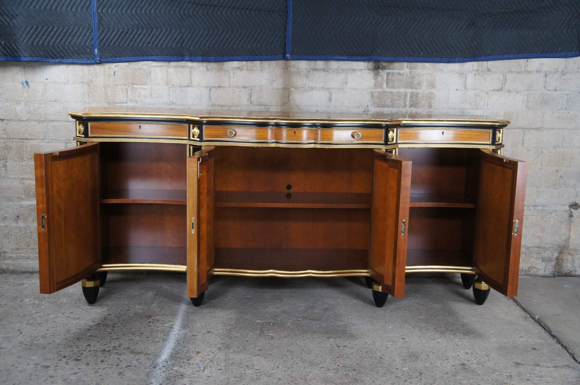 Exquisite dining room buffet, sideboard, server or hall console from The Stately Homes Collection #5230 by Baker Furniture. A serpentine form made from Satinwood with ebonized trim, carved rosettes at canted angles and giltwood borders. The frieze features a long oxbow drawer fitted with silverware insert and flanked by outer drawers for accessory storage. Lower section has three large cabinets with three adjustable shelves for china and dinnerware storage. The cabinet is raised on bold, octagonal, baluster shaped feet. Includes original key with functioning locks. Original sideboard c.1810 is housed in Alnwick Castle, Northumberland, England, owned by His Grace the Duke of Northumberland.'