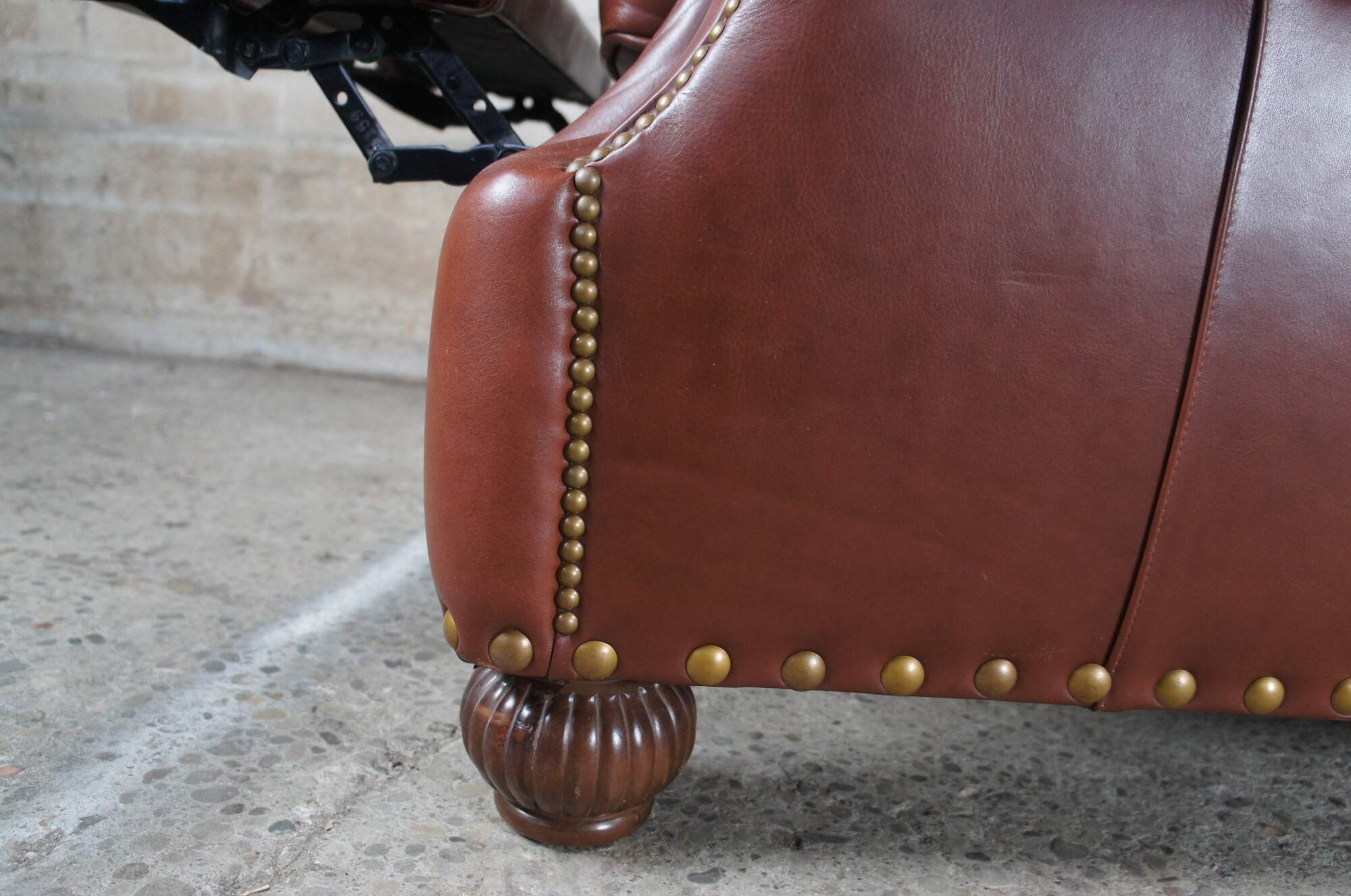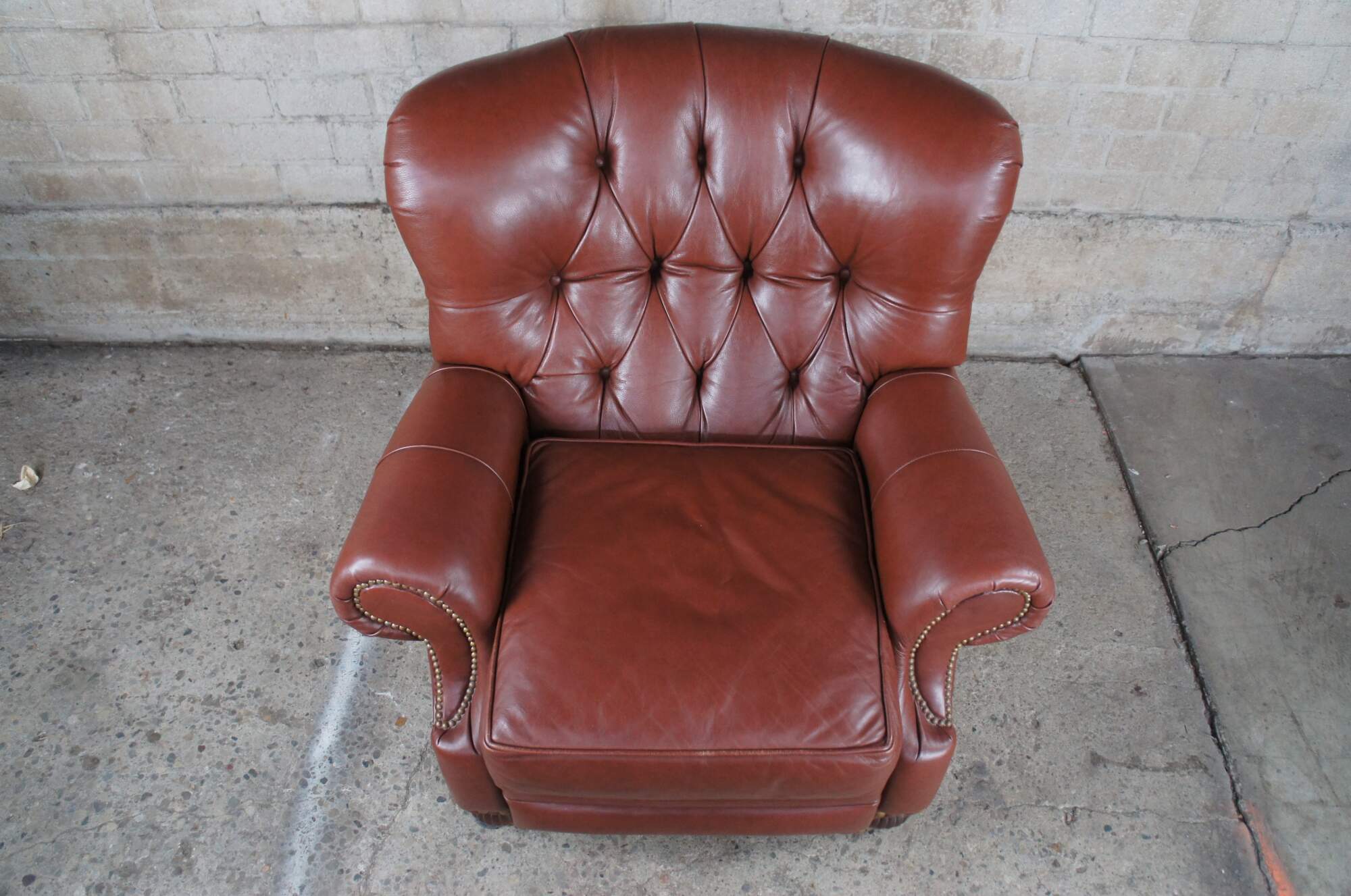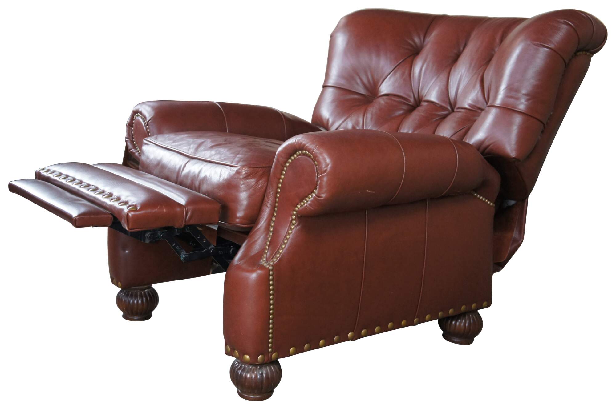 Vintage Leathercraft, Inc Traditional Chesterfield Wingback Recliner. Features a tufted back of chestnut leather and nailhead trim. The chair is supported by ribbed bun feet. #89379-050, upholstery Sarato Chestnut, 26-916.