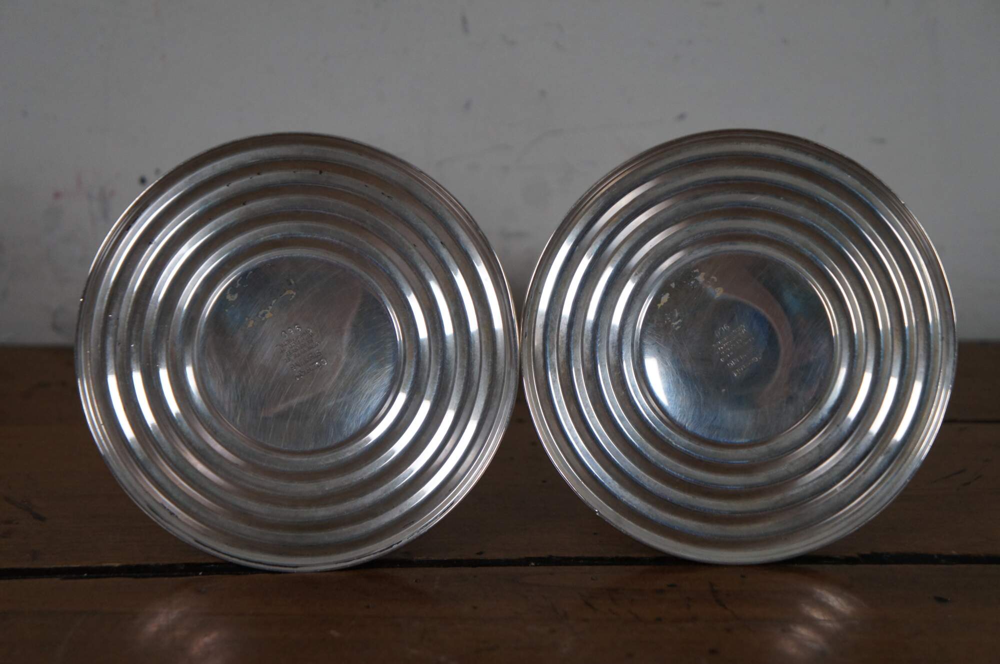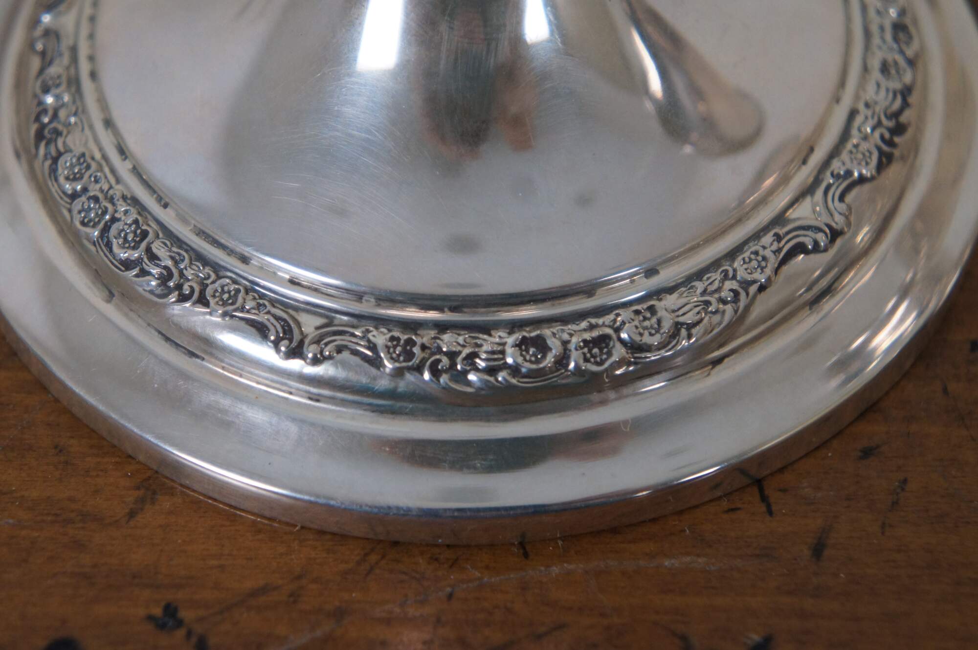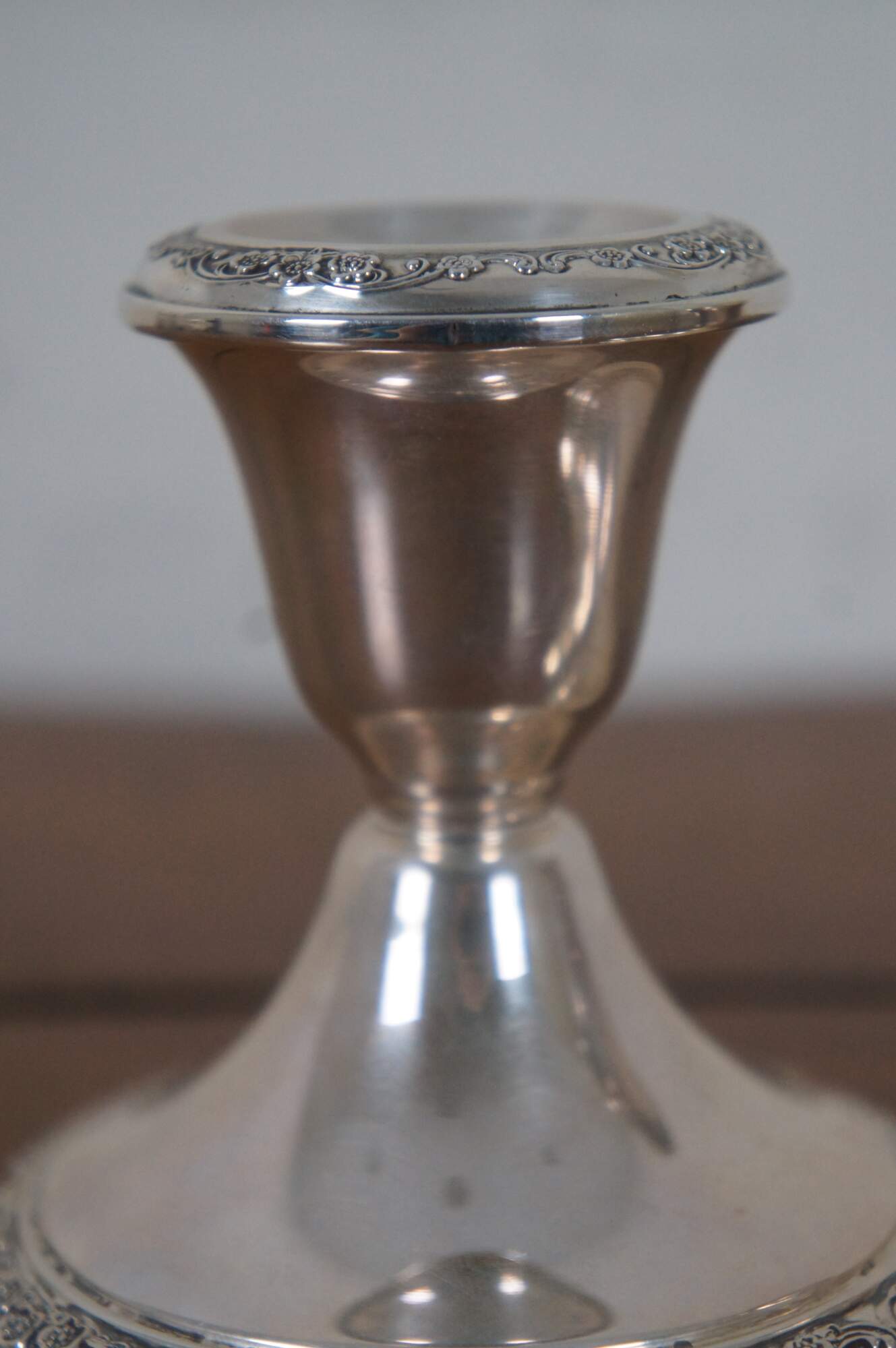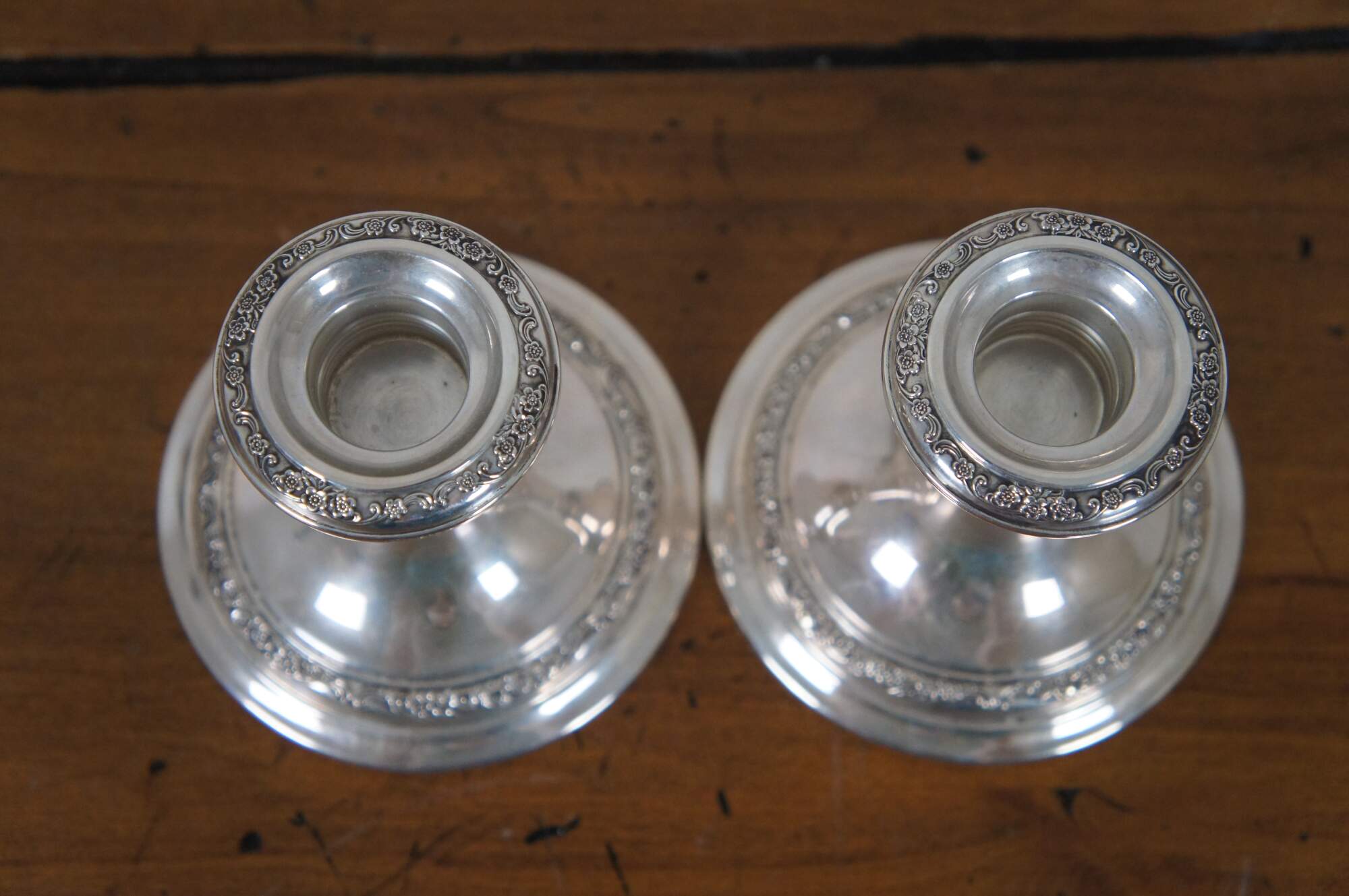 Pair of mid century Gorham reinforced sterling silver candlestick holders decorated with bands of flowers. 960.