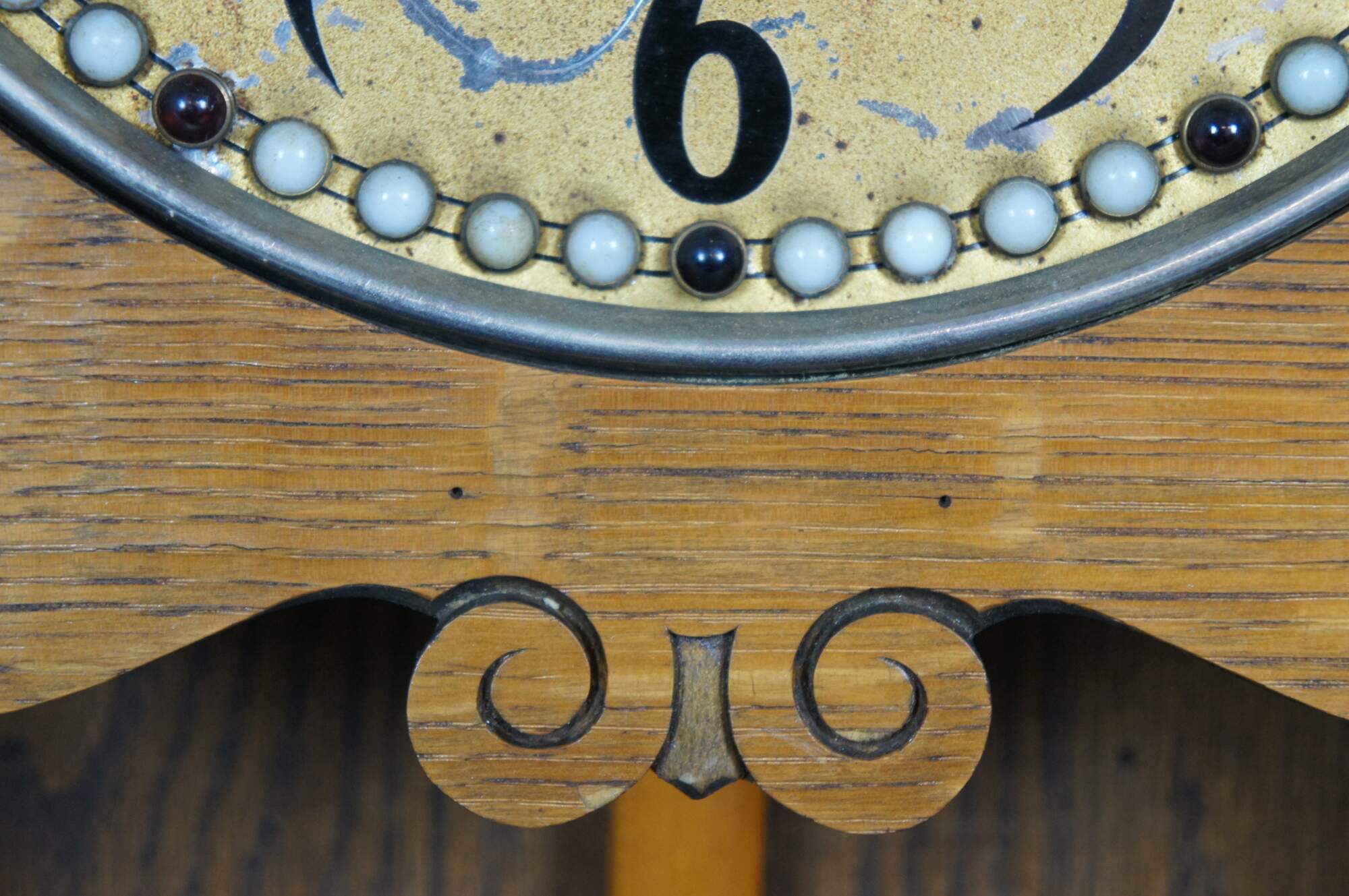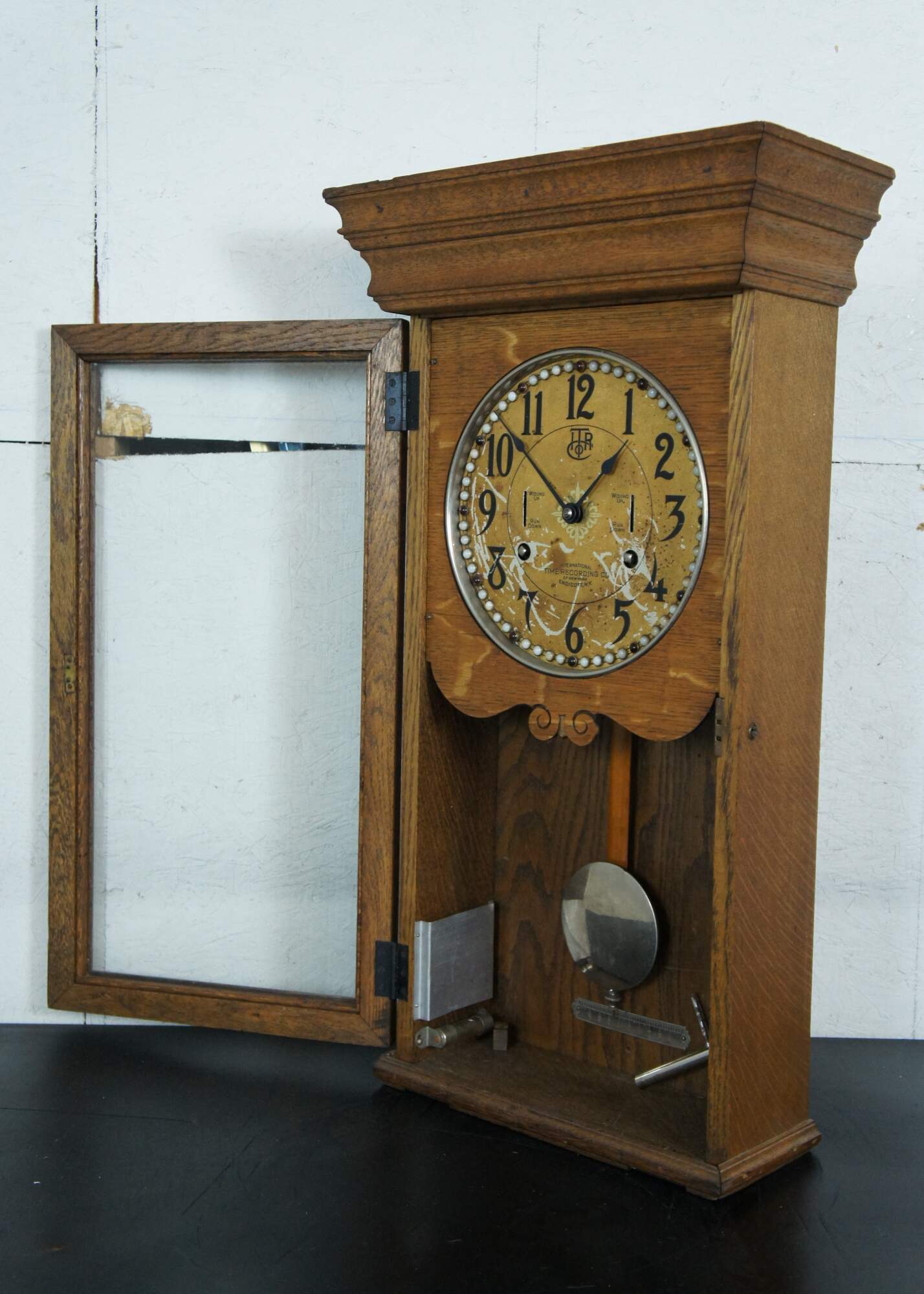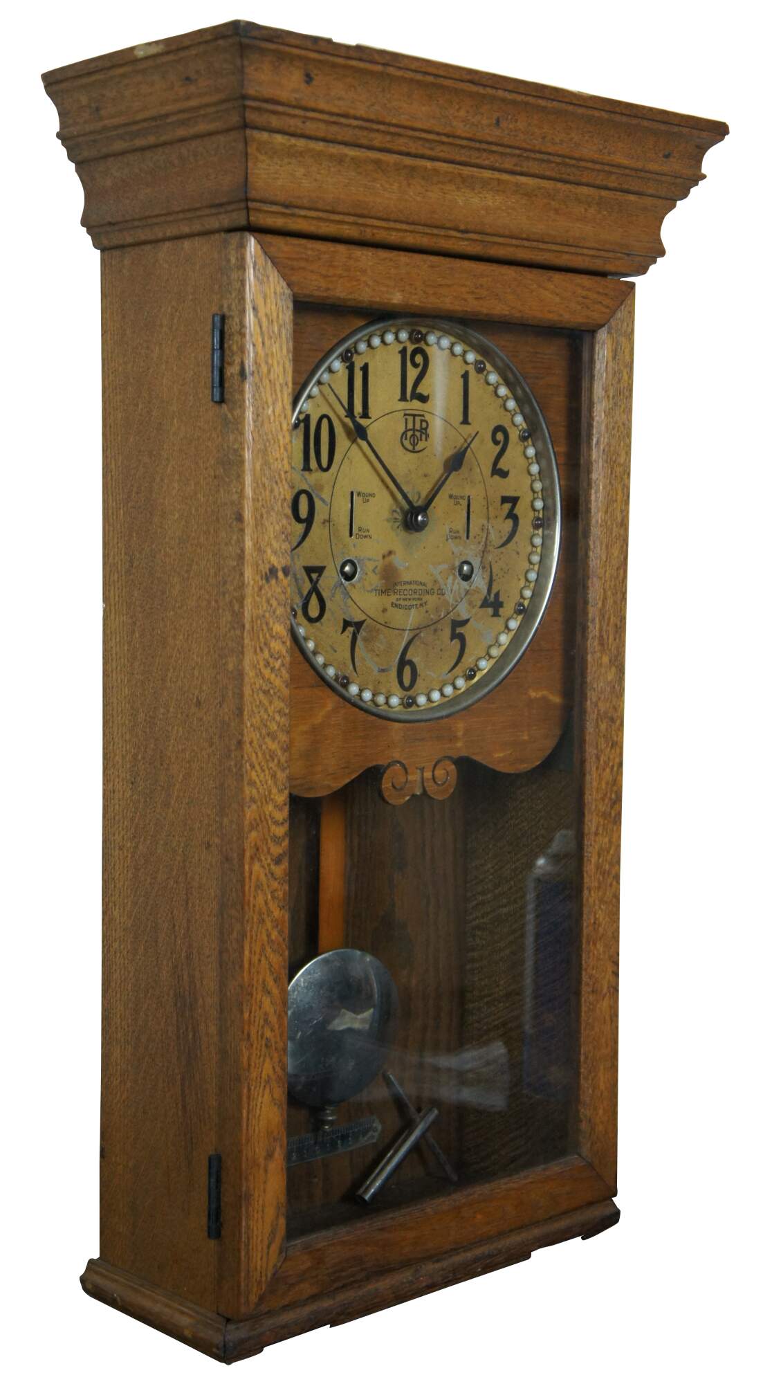 Antique early 20th century oak cased wall hanging clock by the International Time Recording Company of Endicott, New York. Gold painted face is bordered with red and white gemstones.