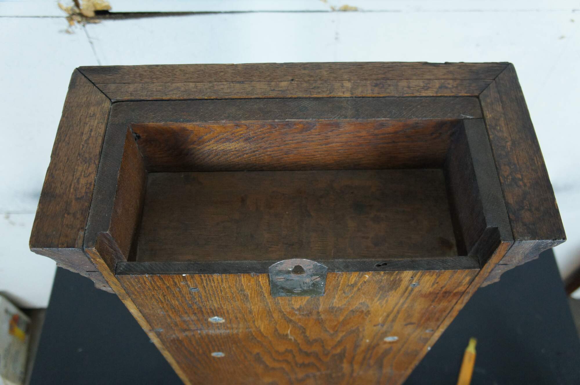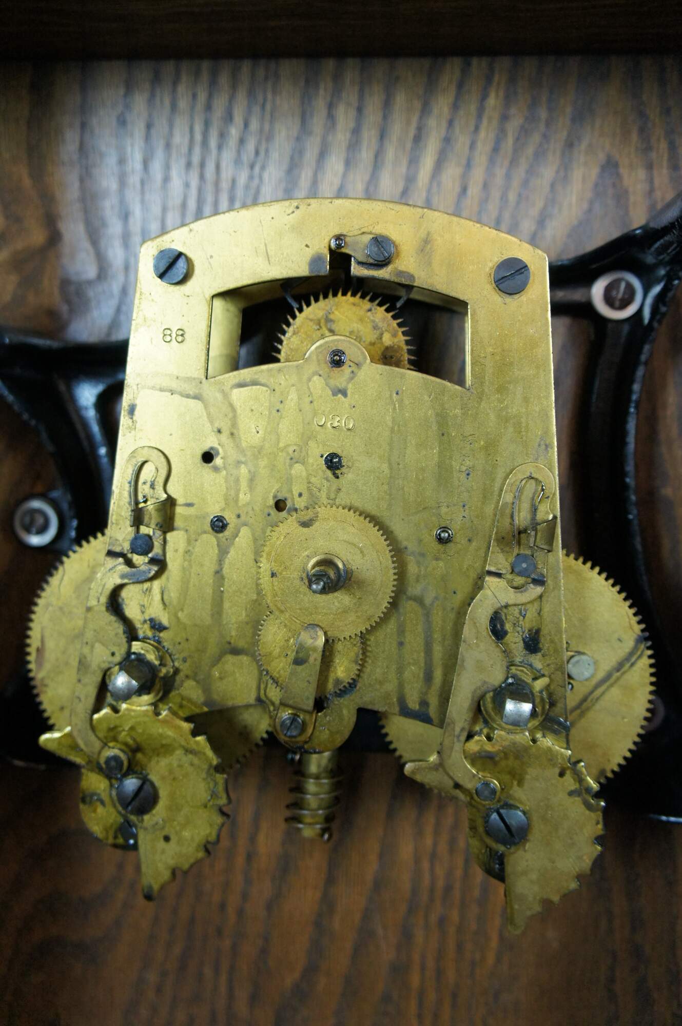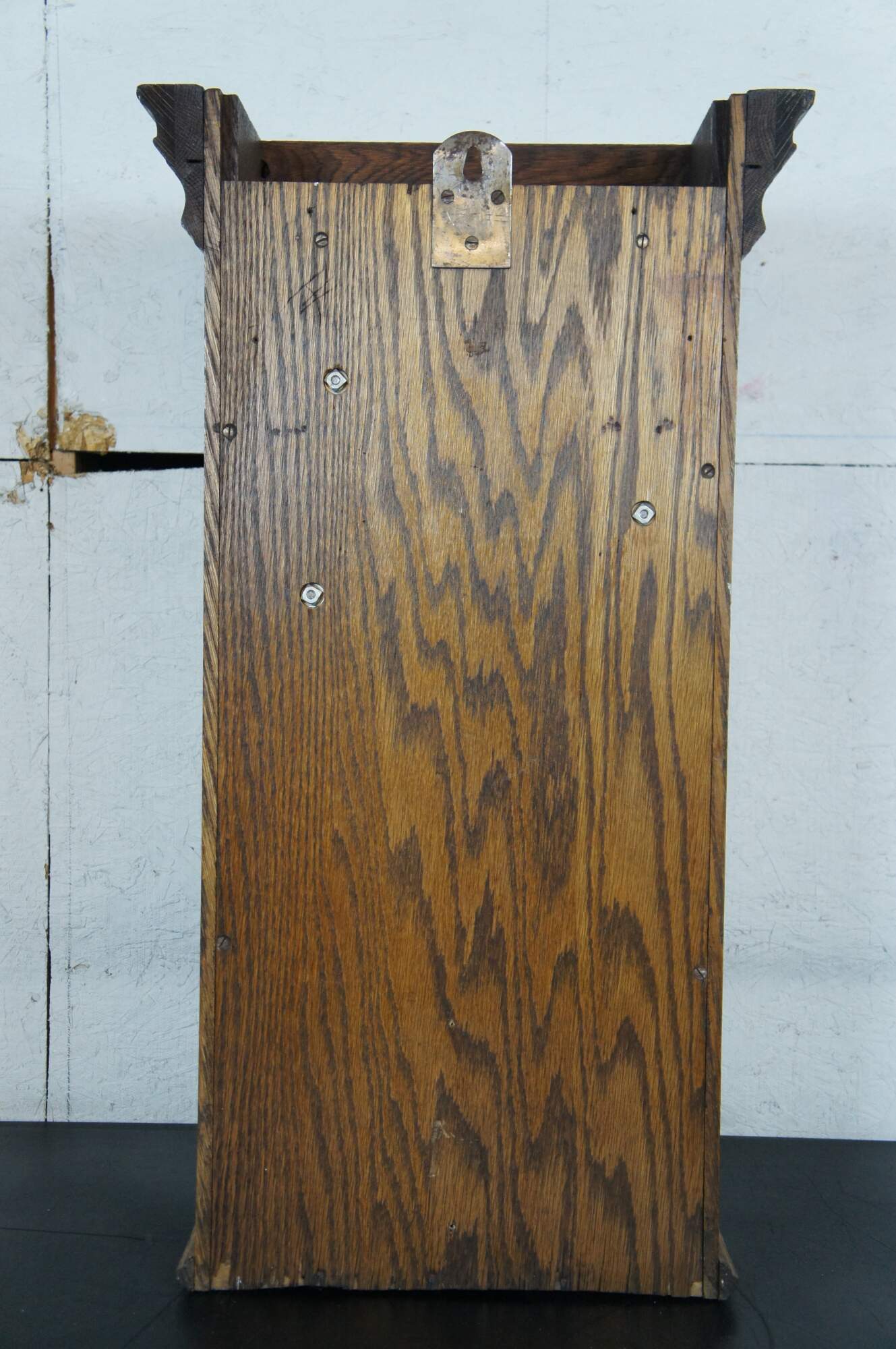 Antique early 20th century oak cased wall hanging clock by the International Time Recording Company of Endicott, New York. Gold painted face is bordered with red and white gemstones.