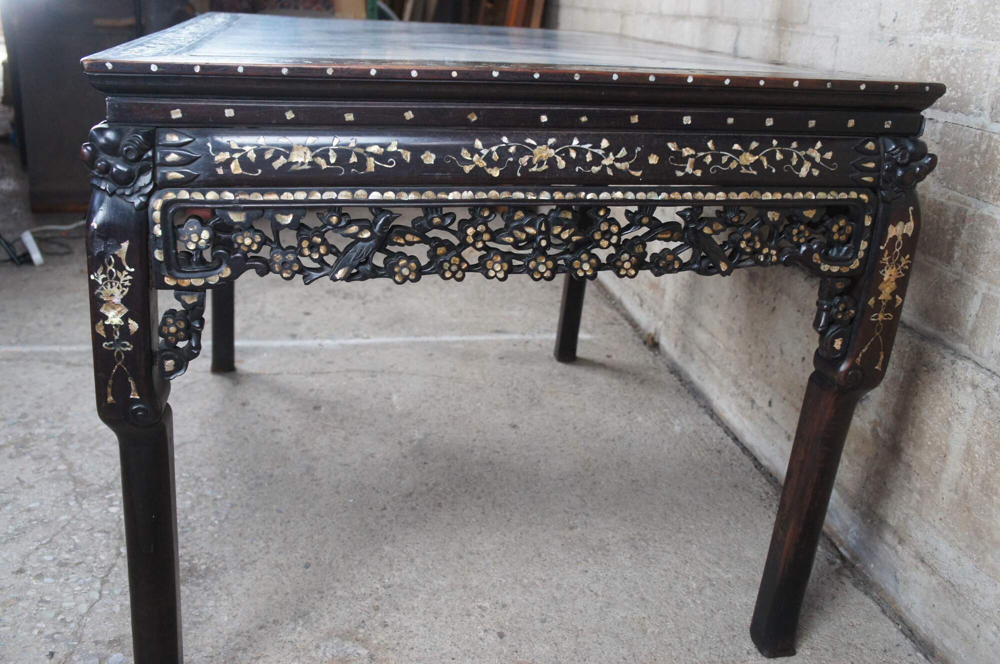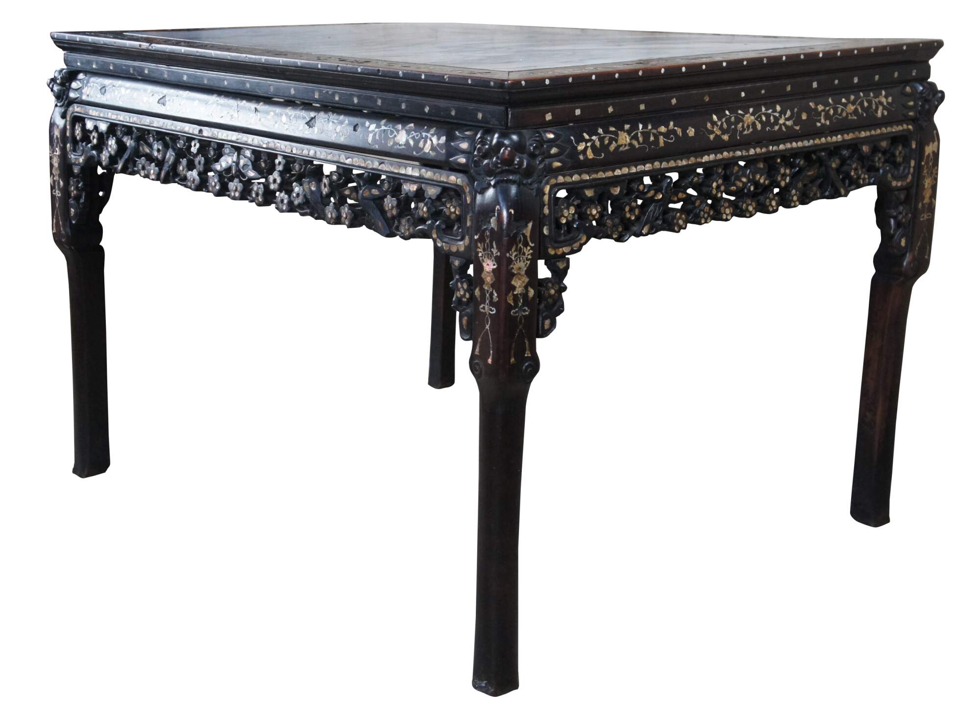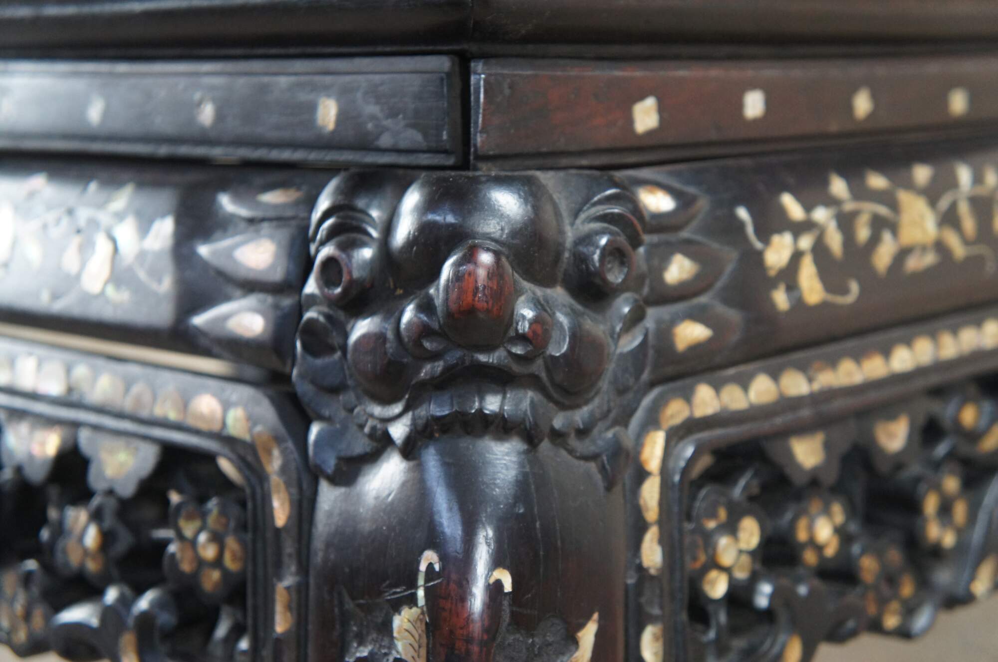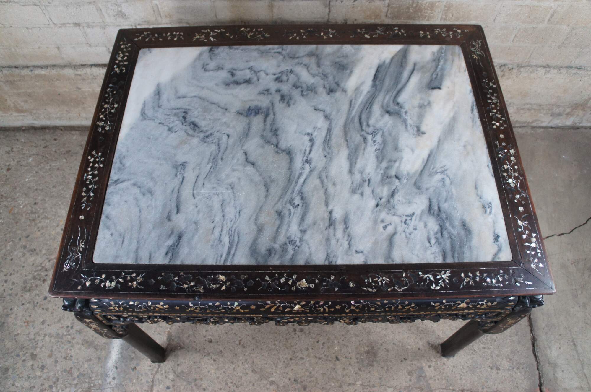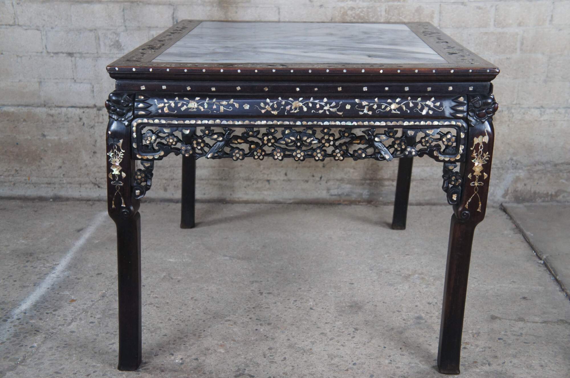 An impressive antique 19th Century Mother or Pearly Inlaid Console, Game, Dining or Center Table. A rectangular form made from rosewood with mortise and tenon construction featuring inset gray marble top over a mother-of-pearl inlaid and pierced foliate frieze with birds and butterfly. Each leg has a figural chimera and mask carving at the top over an inlay design showing a bouquet within a basket over a ribboned and tasseled accent. Mother of Pearl framework is contined throughout the on all four sides of the table. A truly exceptional table showcasing breathtaking work. Signed beneath the stone