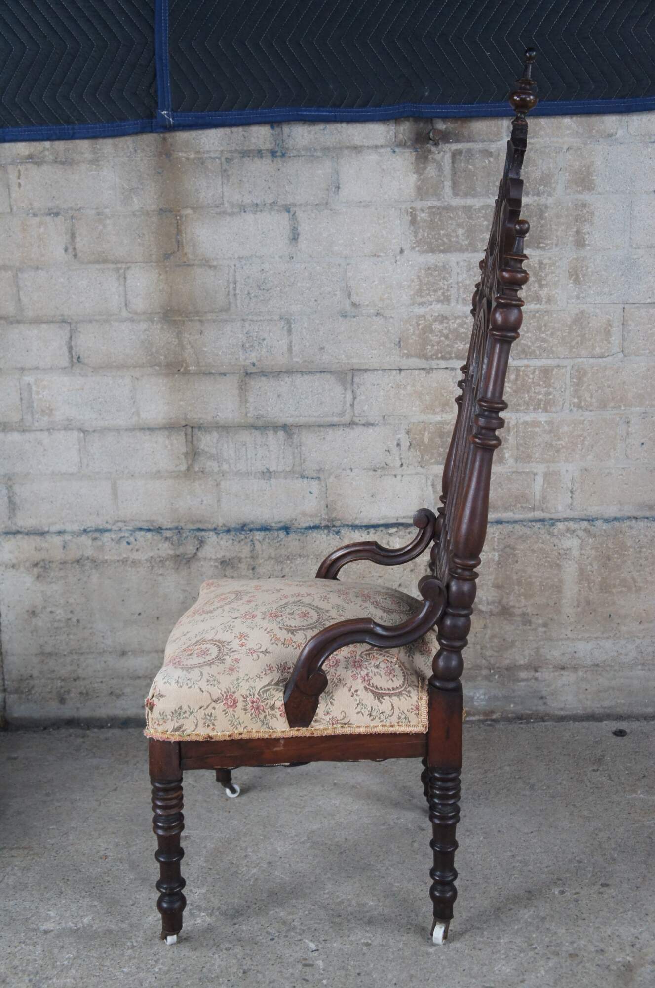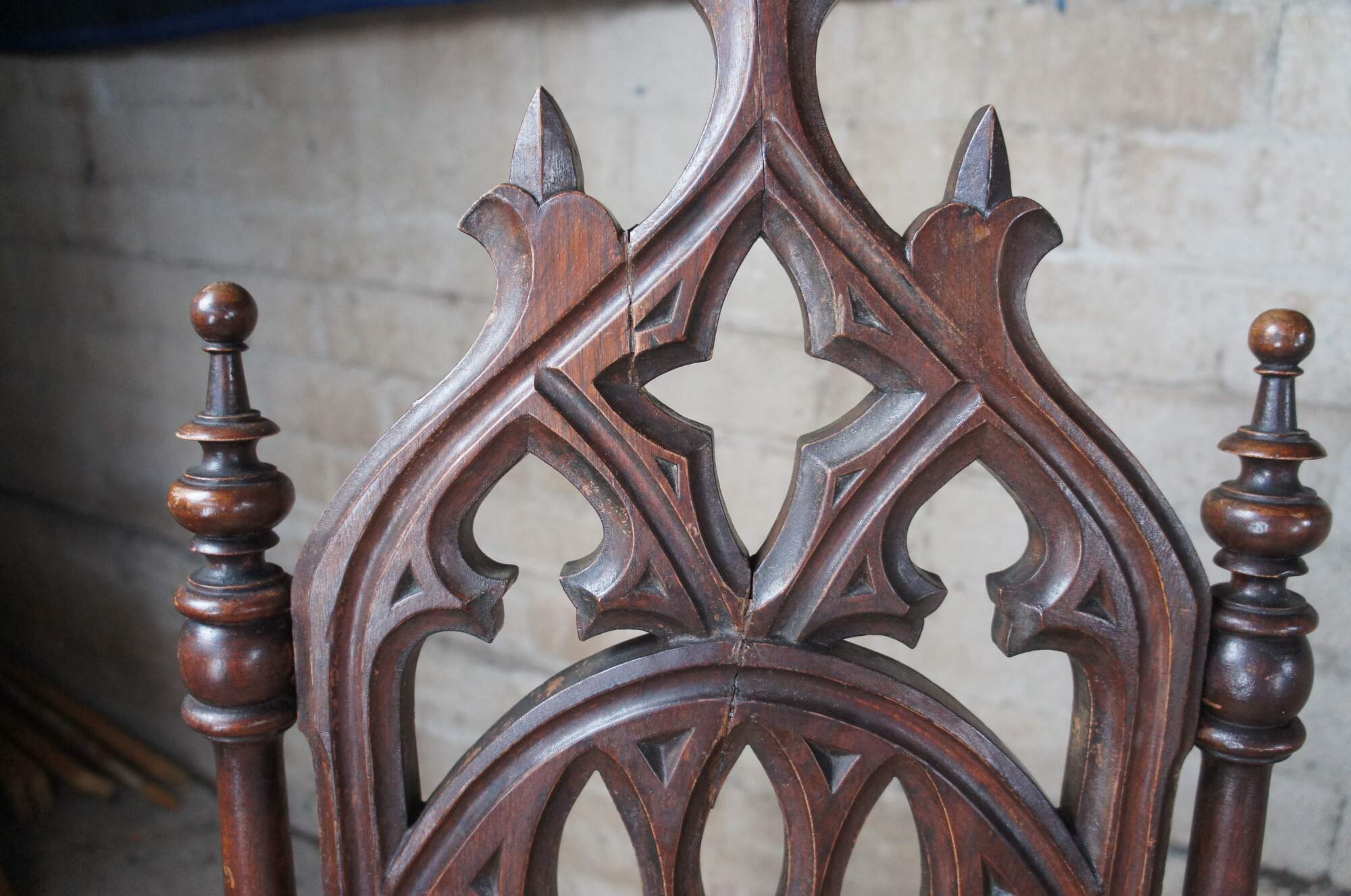 A pair of impressive Gothic / Renaissance revival occasional armchairs featuring ornate high relief pierced design with turned legs and posts over casters.