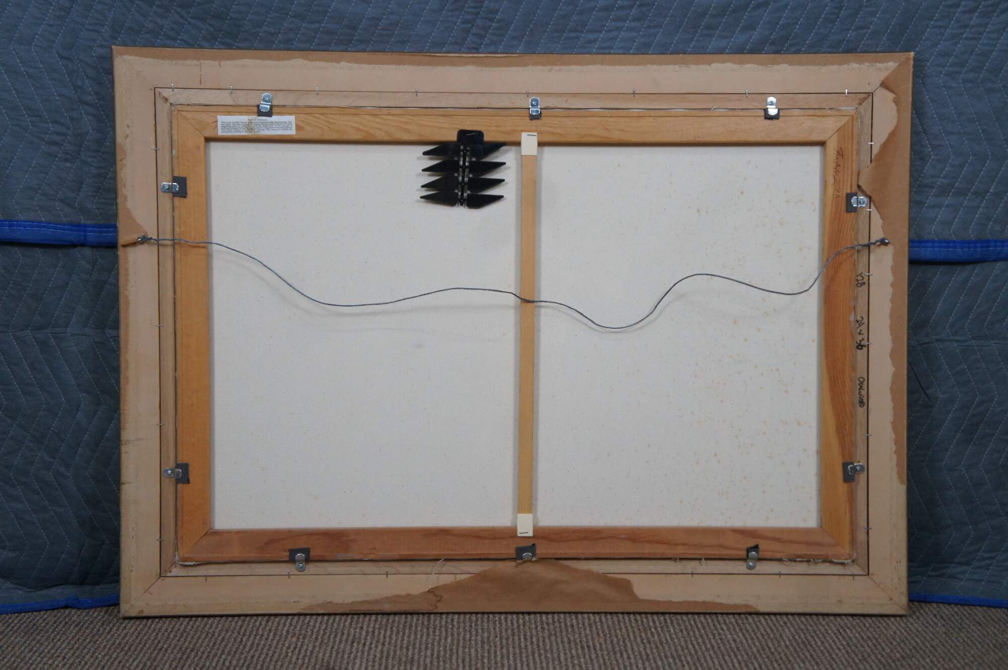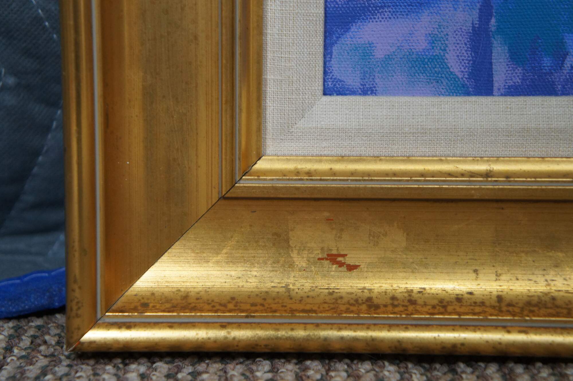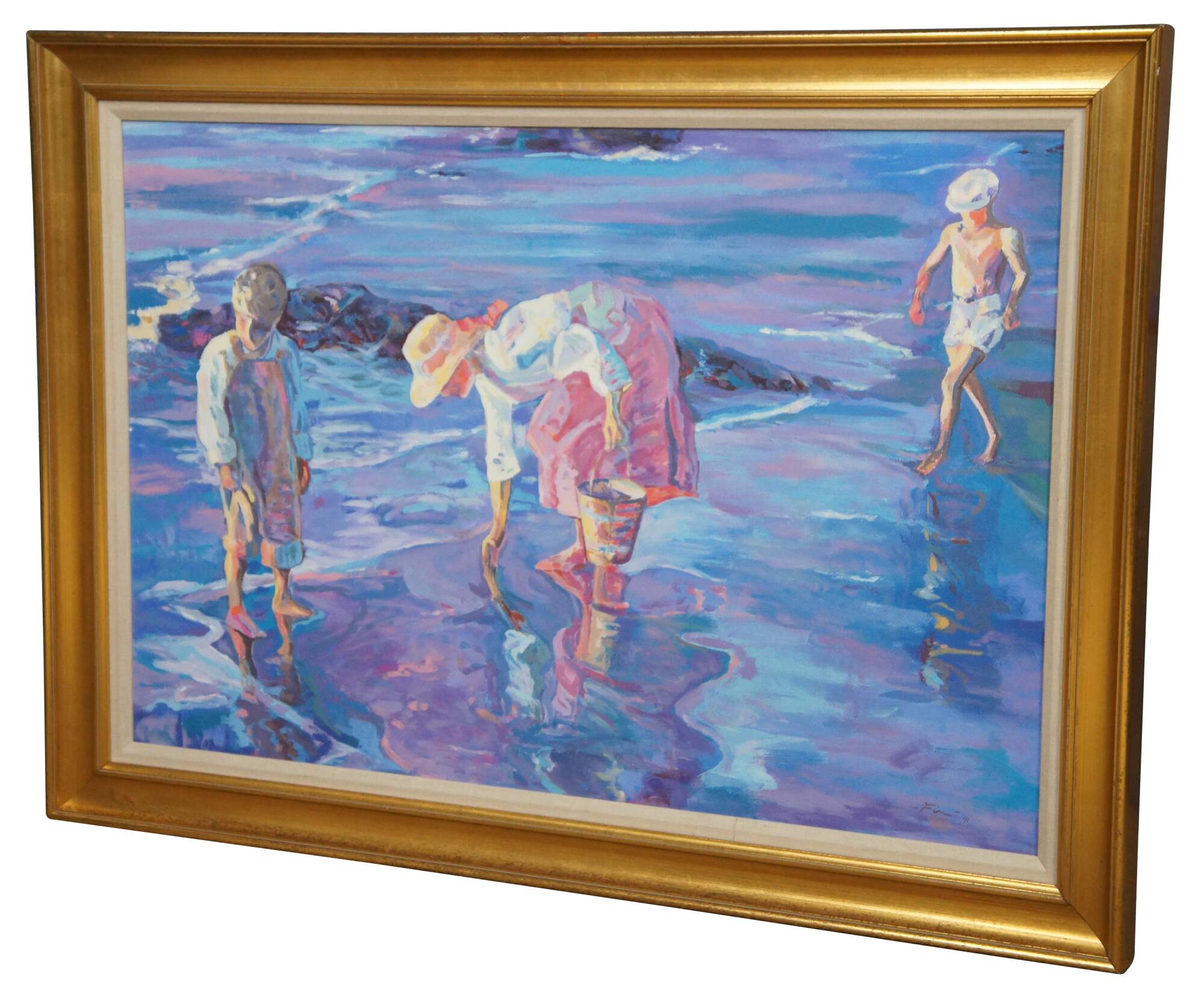 Vintage reproduction oil painting on canvas featuring a beach landscape scene showing three figures collecting shells. Signed lower left, circa 1991. After Donald Eric Hatfields "Shimmering Sand".