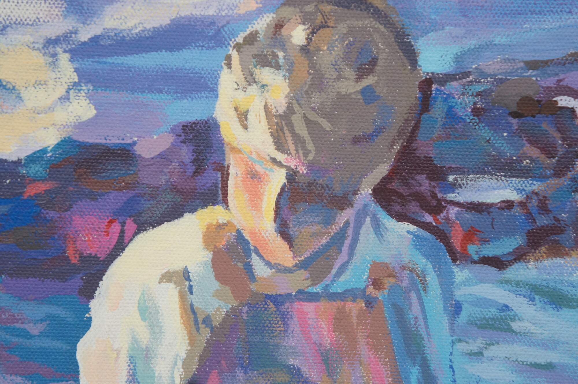 In his development as an artist, Hatfield had the added influence of modern cinematic interpretation. Affected by the new mastery of color on film, in advertising and television, he felt a need for a more intoxicating light, another dimension to the beach attraction. Seeking a truth in the paint itself, he documented that fleeting essence of the tender, the humorous, the enchantment of a special moment in time.