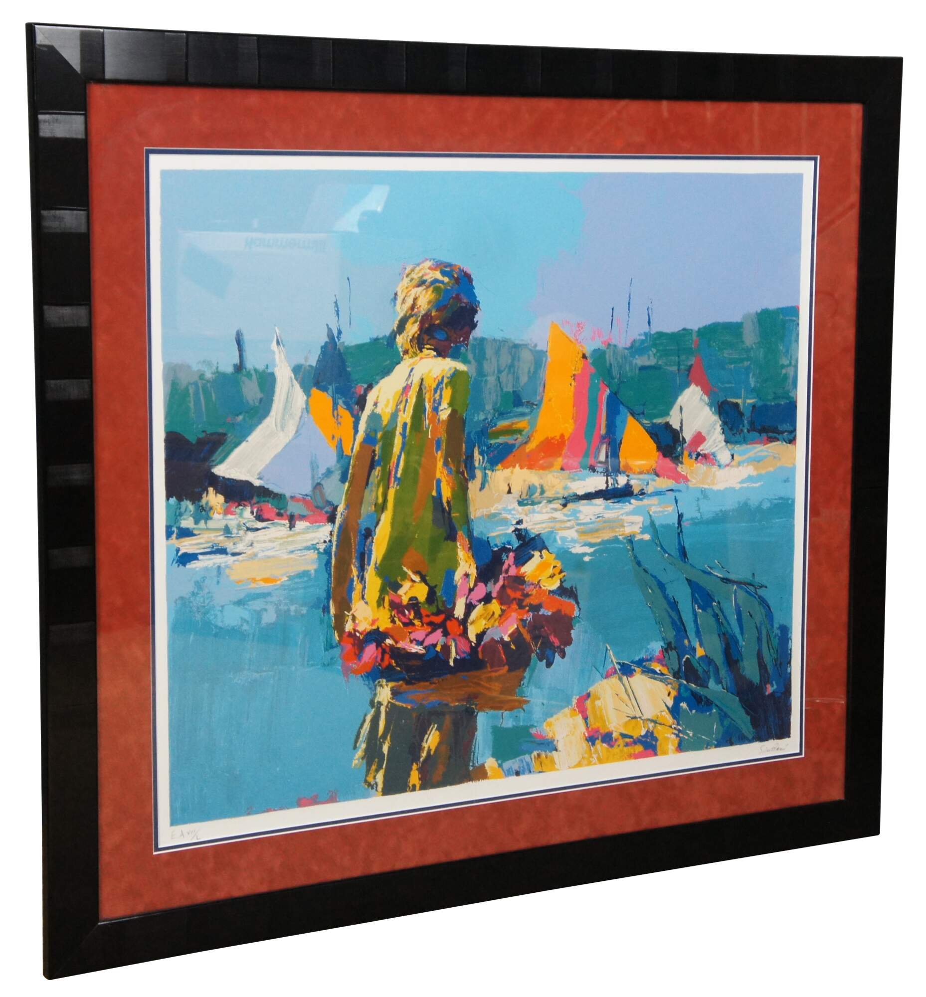 Vintage framed serigraph on paper showing a figure carrying a basket of flowers in front of a nautical / maritime water scene with brightly colored sail boats by Nicola Simbari. Titled “Summertime,” pencil signed and numbered EA VIII/L. Circa 1980.