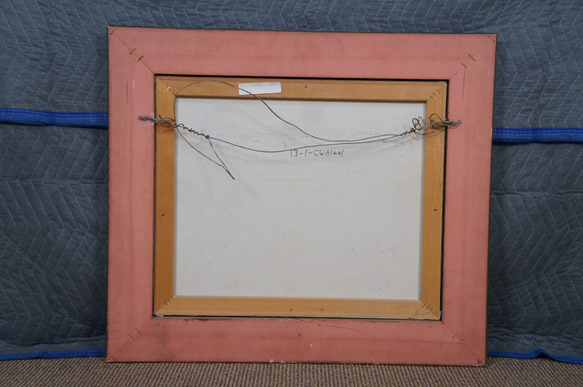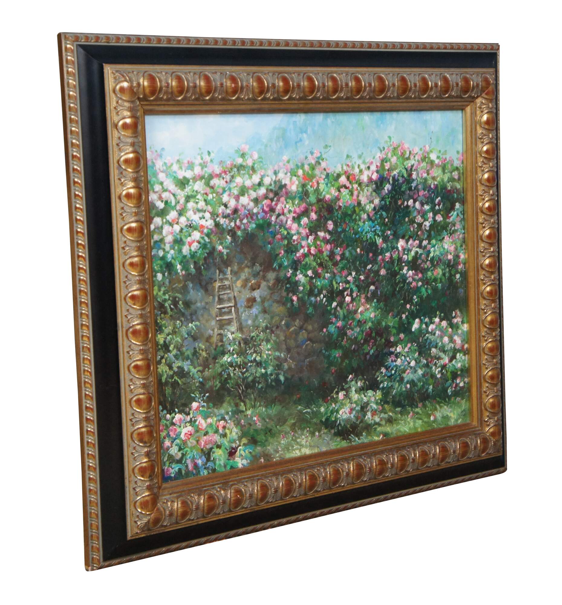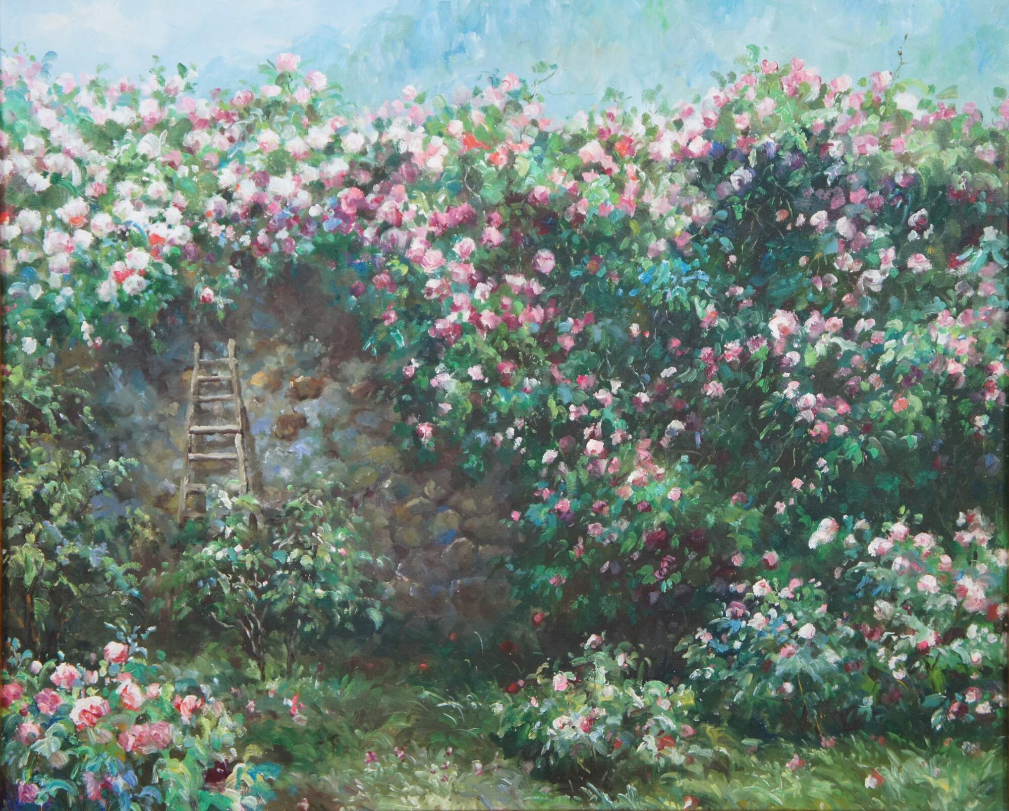Vintage oil on canvas impressionist / expressionist style landscape painting, showing a stone garden wall with a ladder propped against it, thoroughly covered in pink roses.