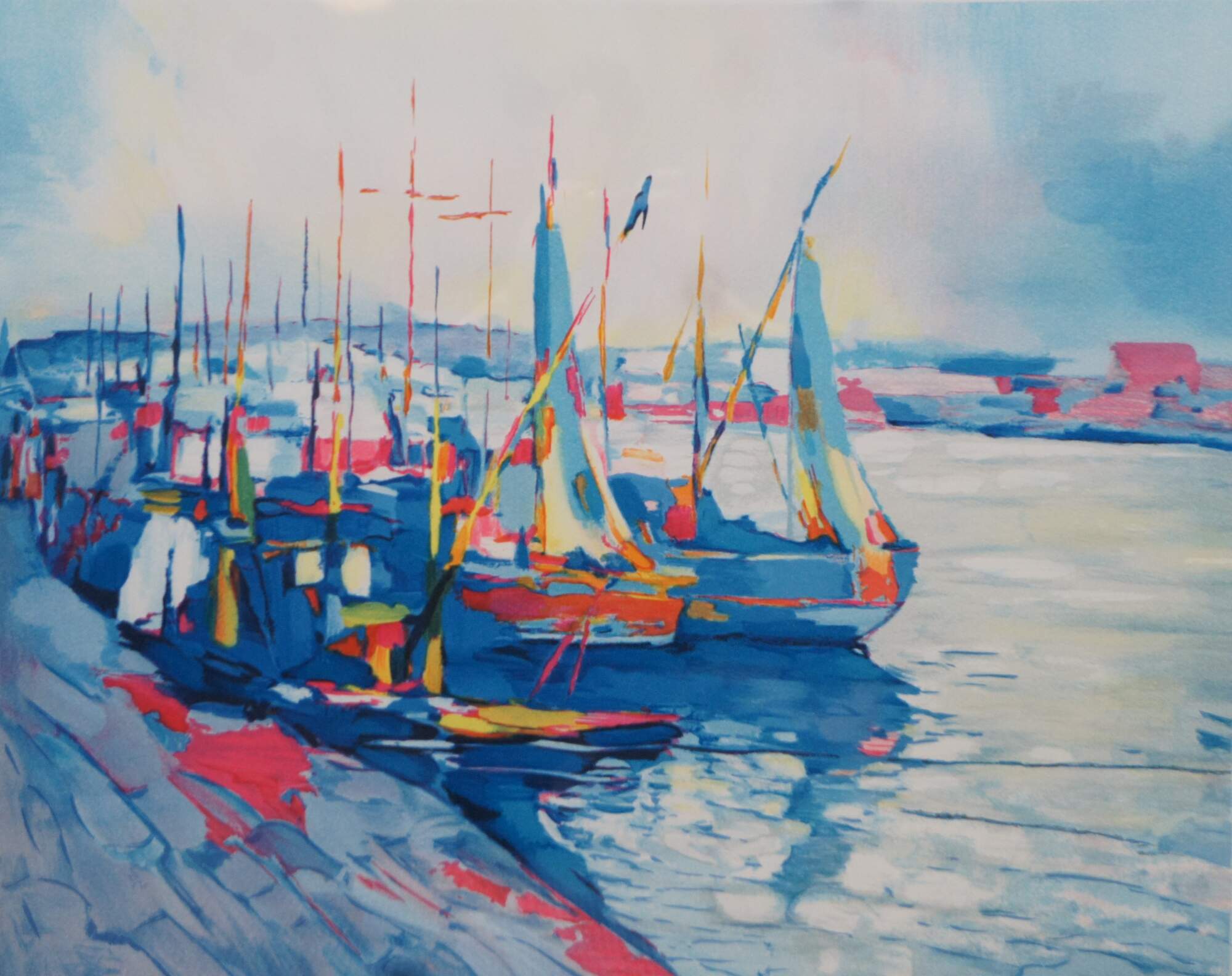 Vintage limited edition lithograph print titled Port Jolly by Nicola Simbari, showing a nautical / maritime seascape of sail boats at dock in Jolly Harbour, Antigua. Pencil signed and numbered 47 of 175.