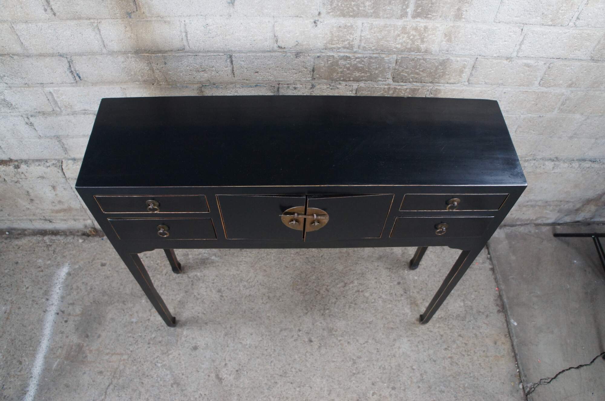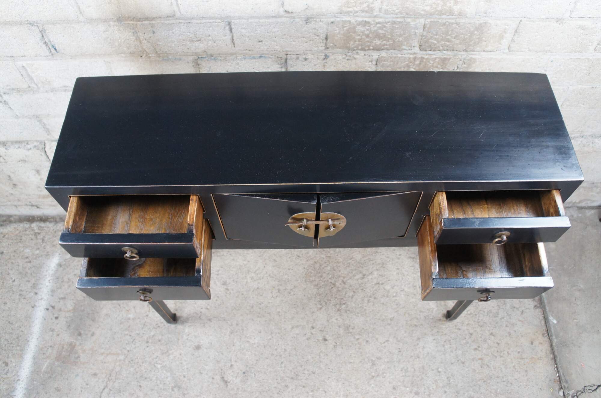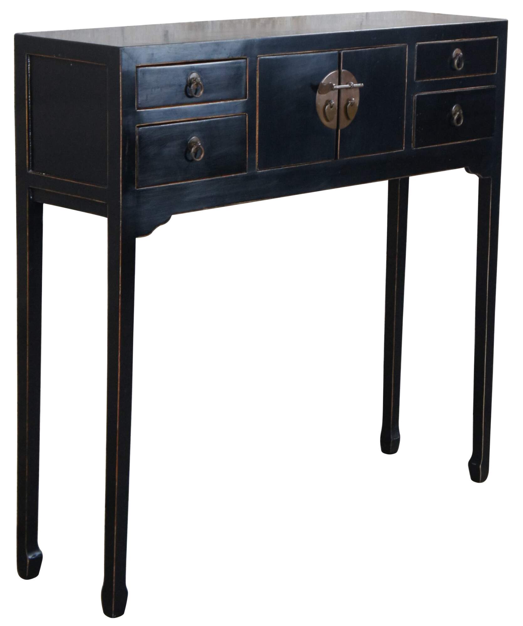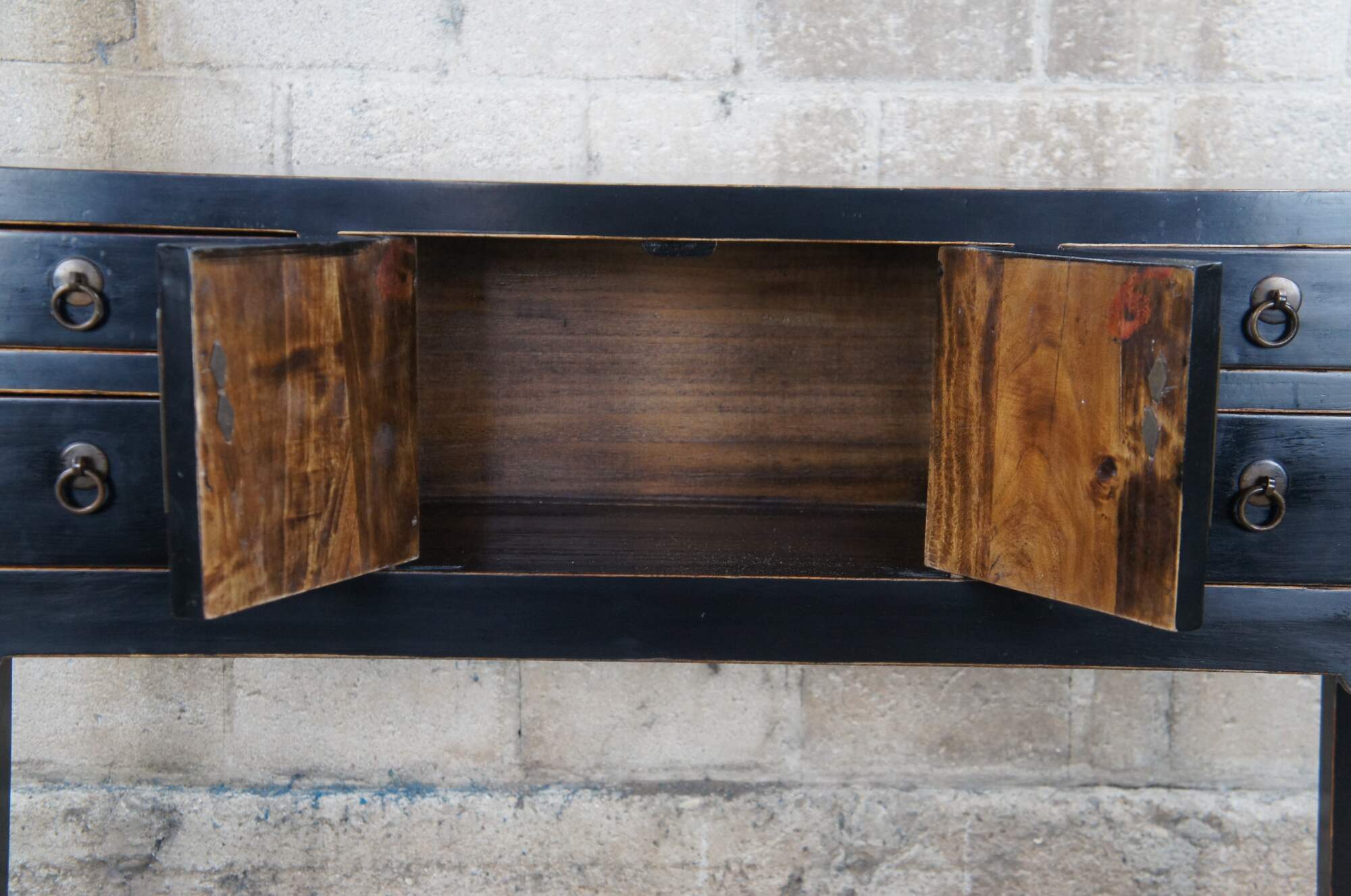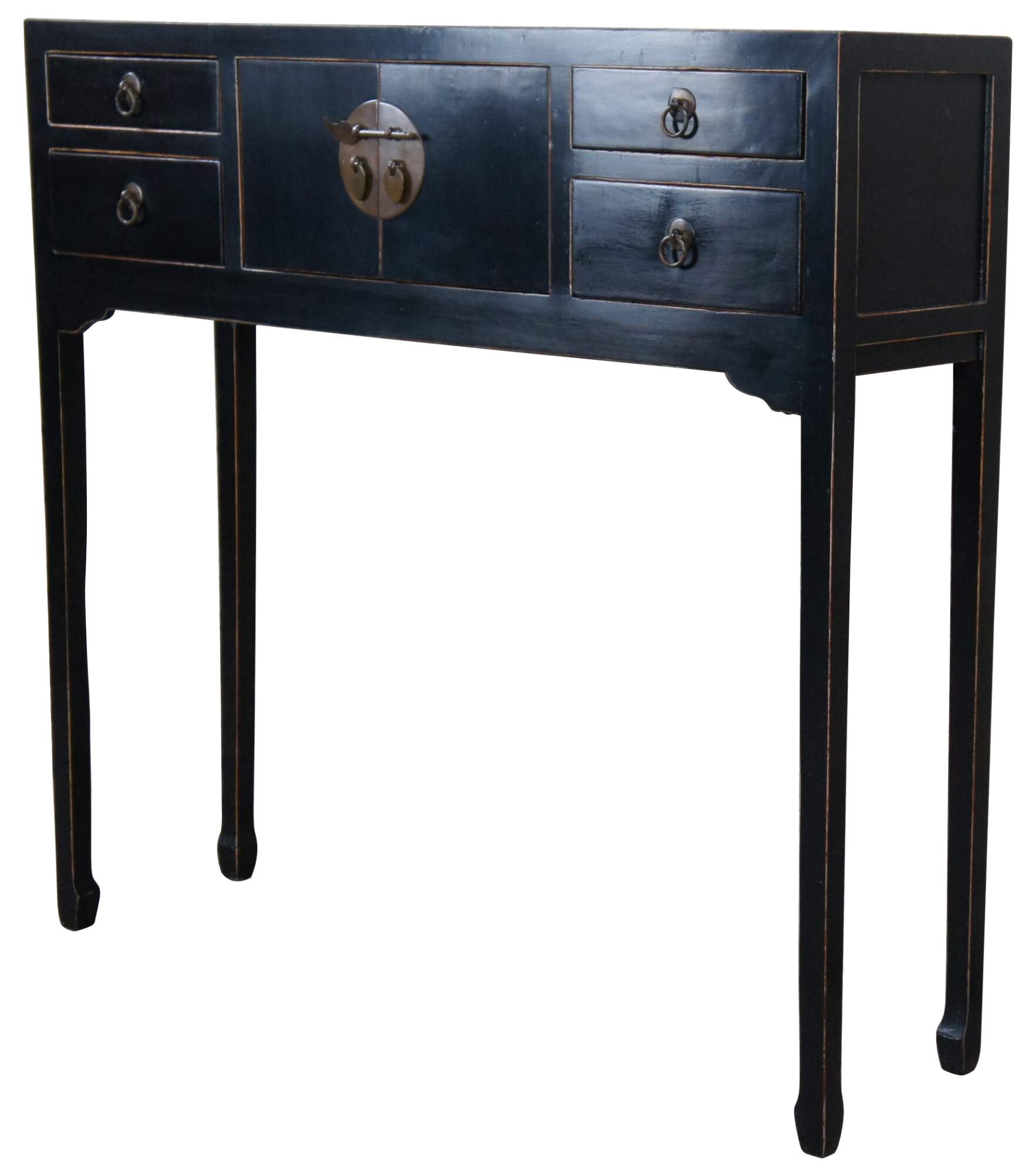 A lovely Chinese Ming style console. A nice complement to a hallway or behind a sofa. Black lacquered elmwood with a central cabinet flanked by four dovetailed drawers with brass hardware.