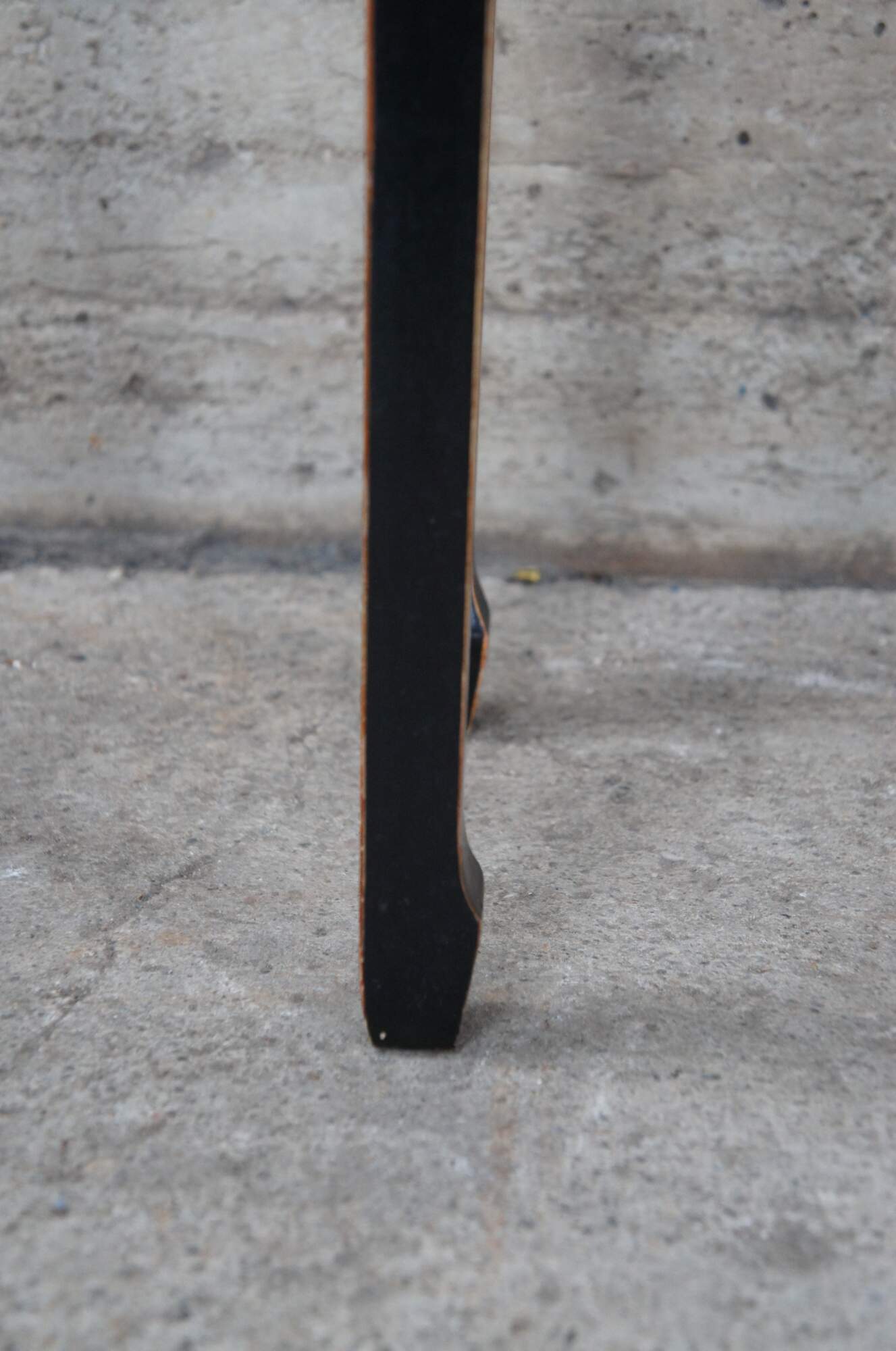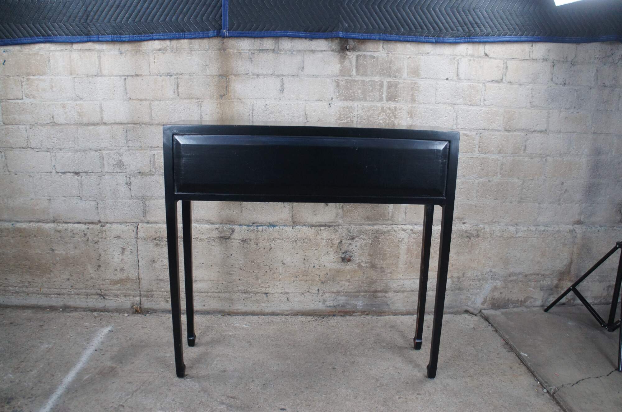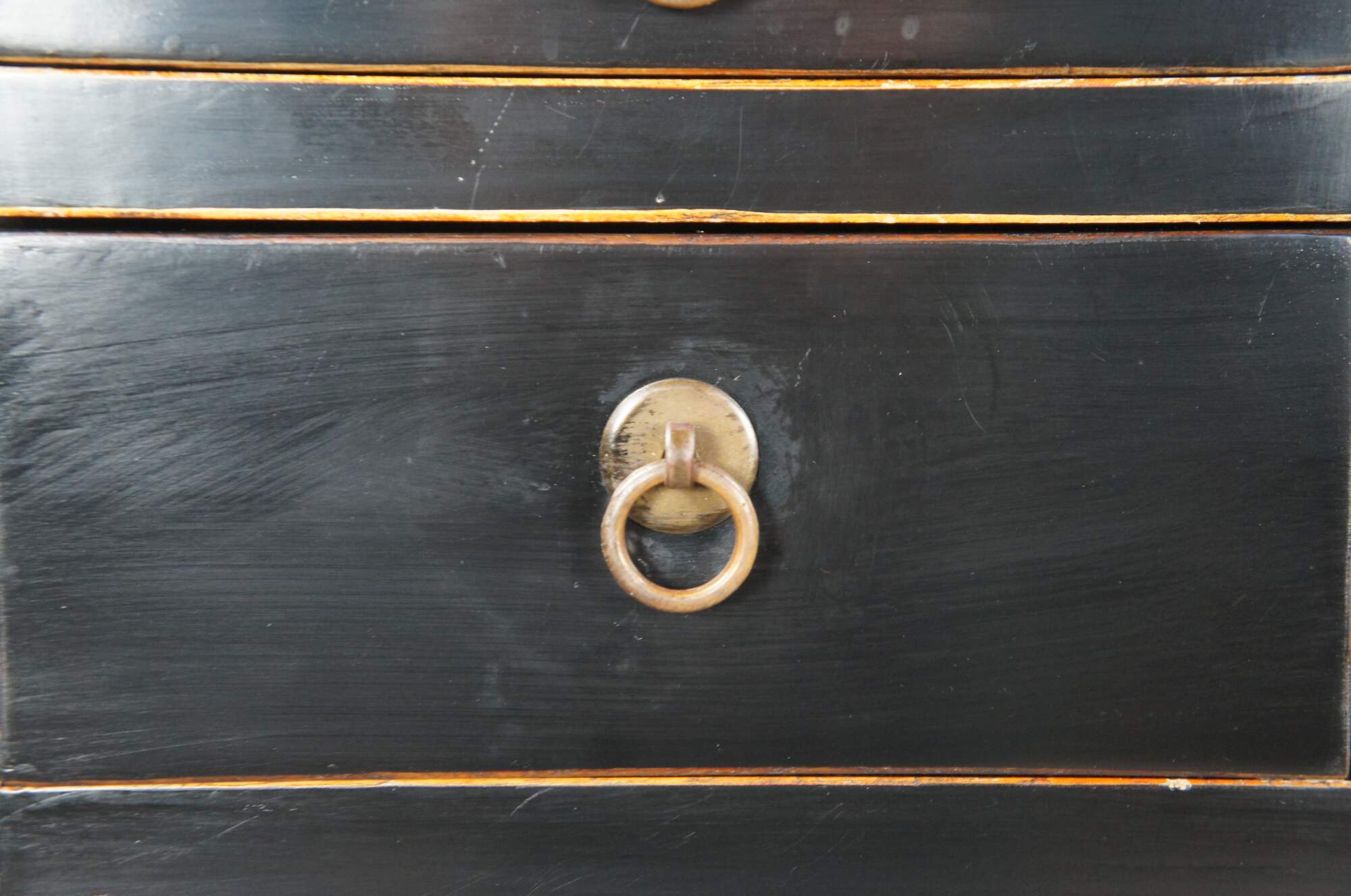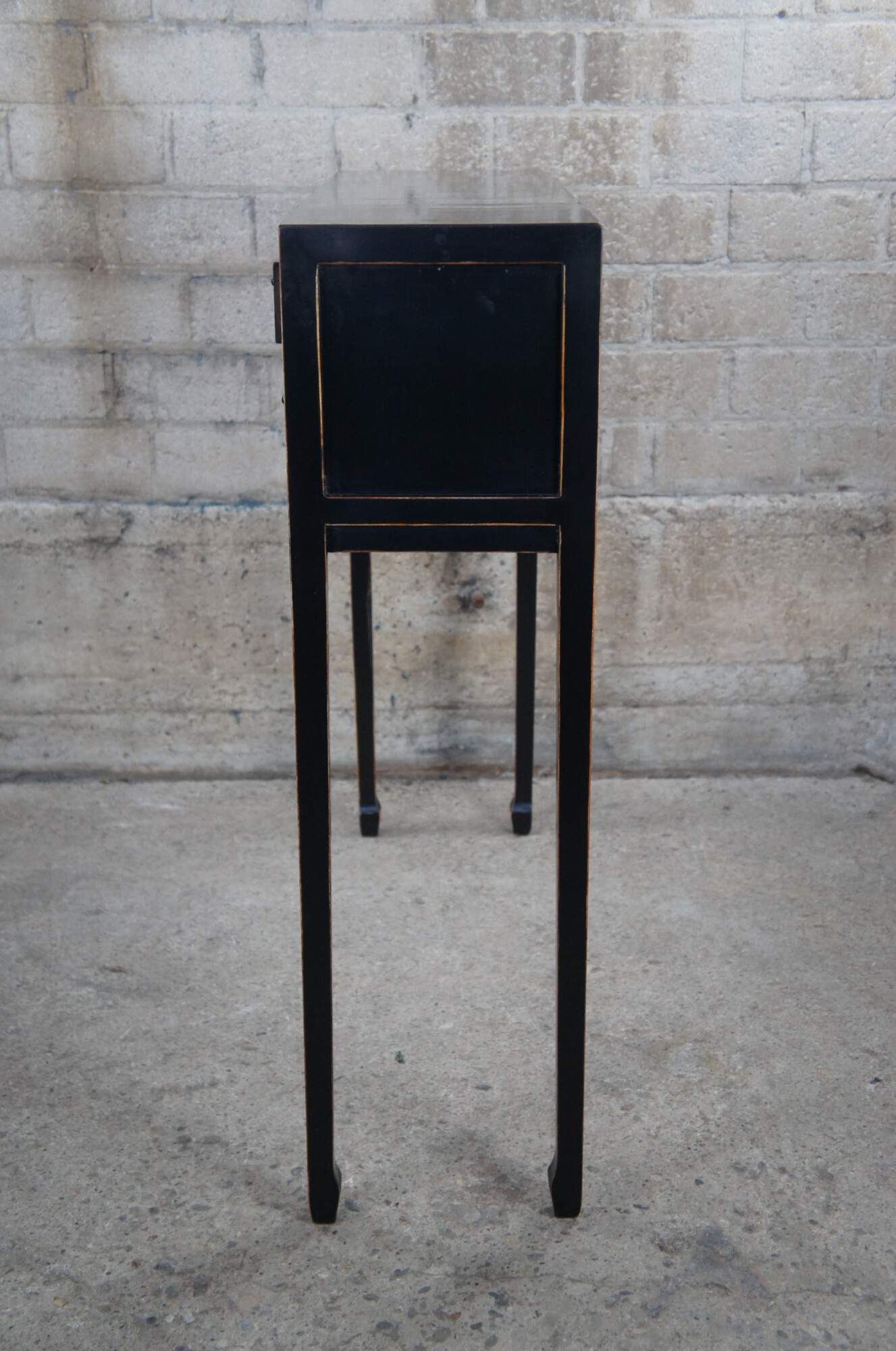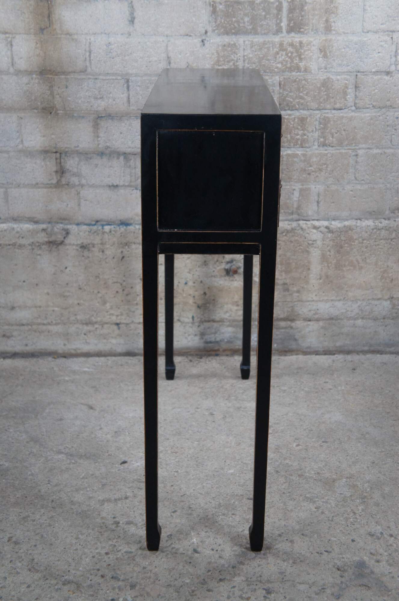 A lovely Chinese Ming style console. A nice complement to a hallway or behind a sofa. Black lacquered elmwood with a central cabinet flanked by four dovetailed drawers with brass hardware.