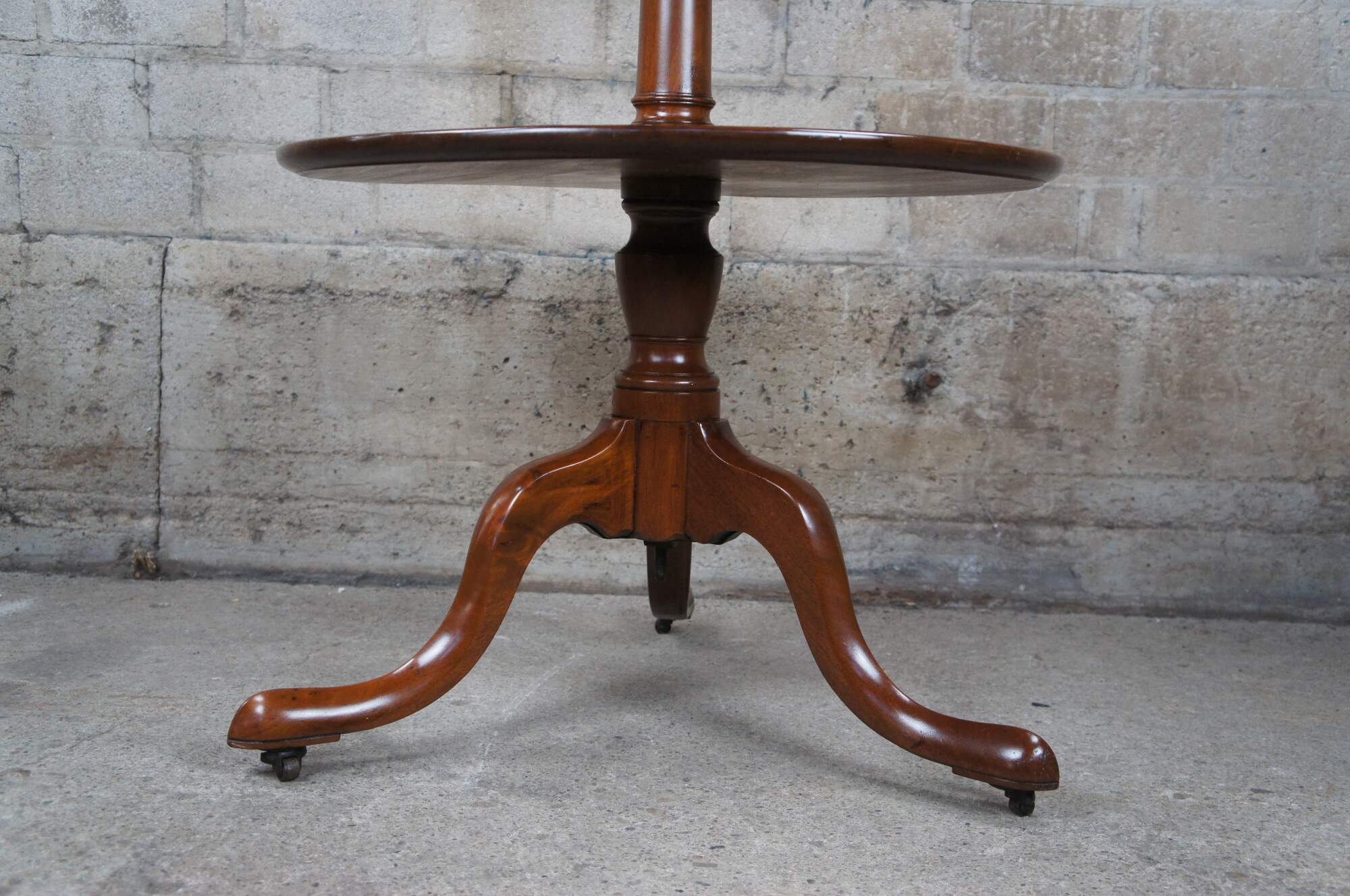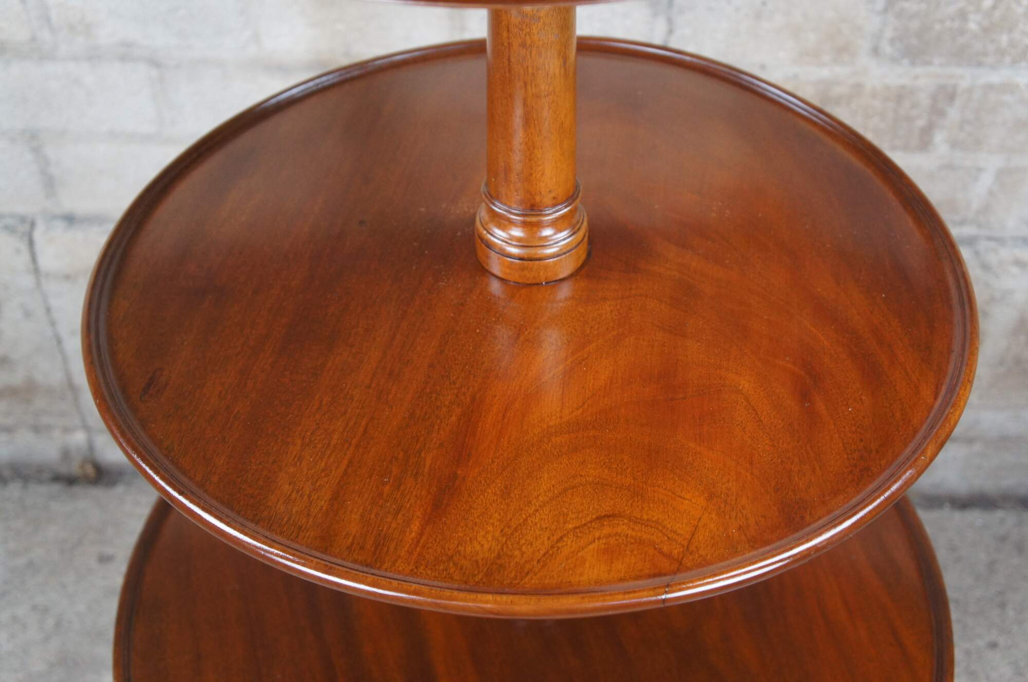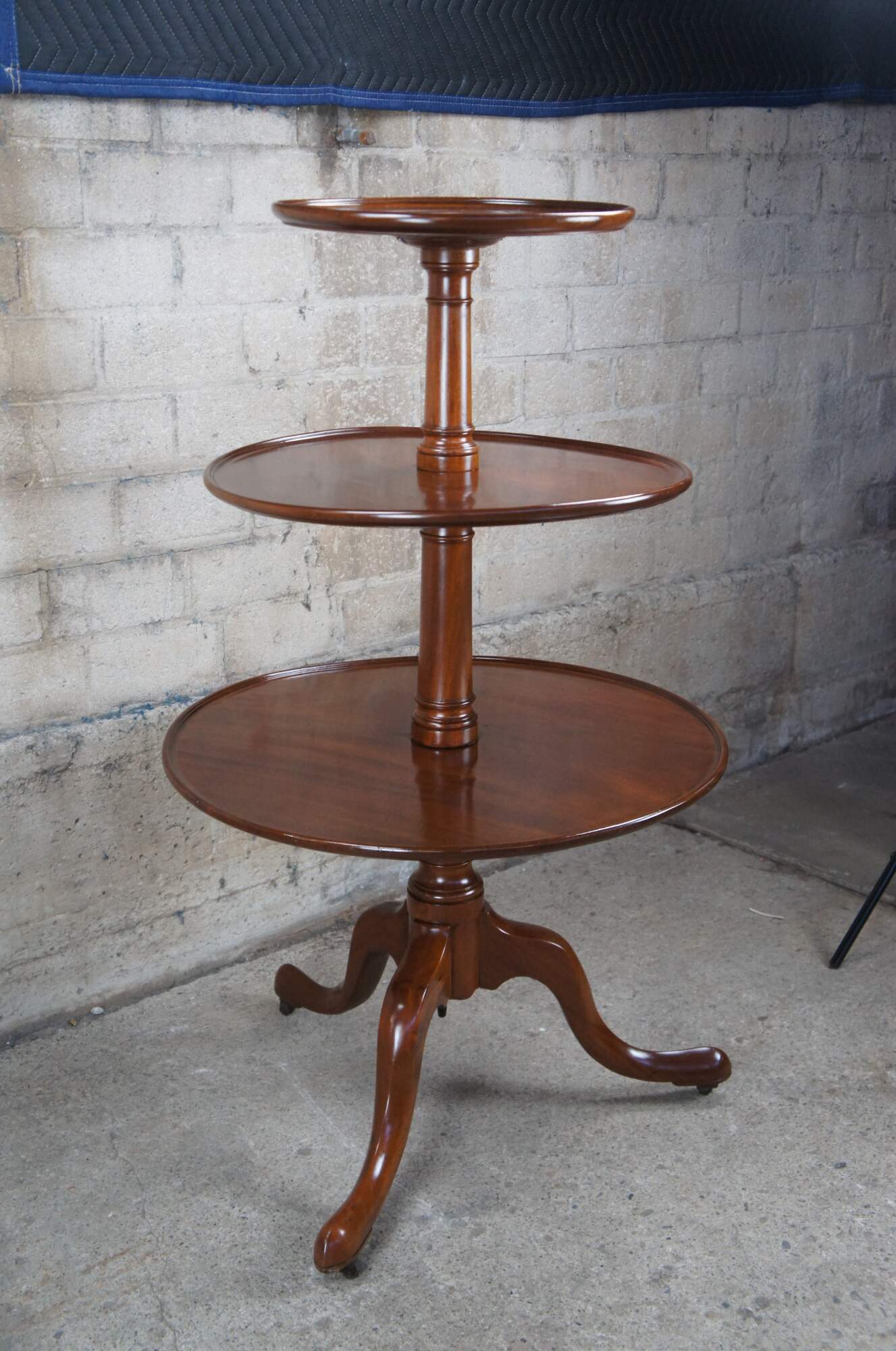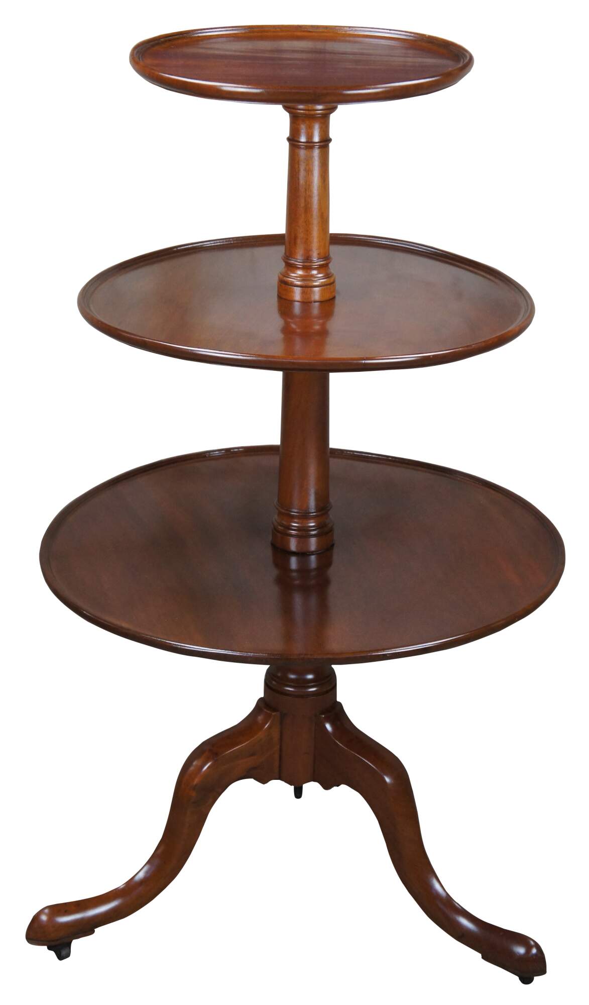 Antique 19th century three tiered dumbwaiter or butlers table. Made of mahogany featuring Queen Anne styling with a round tapered column and serpentine legs w slipper feet and castors.