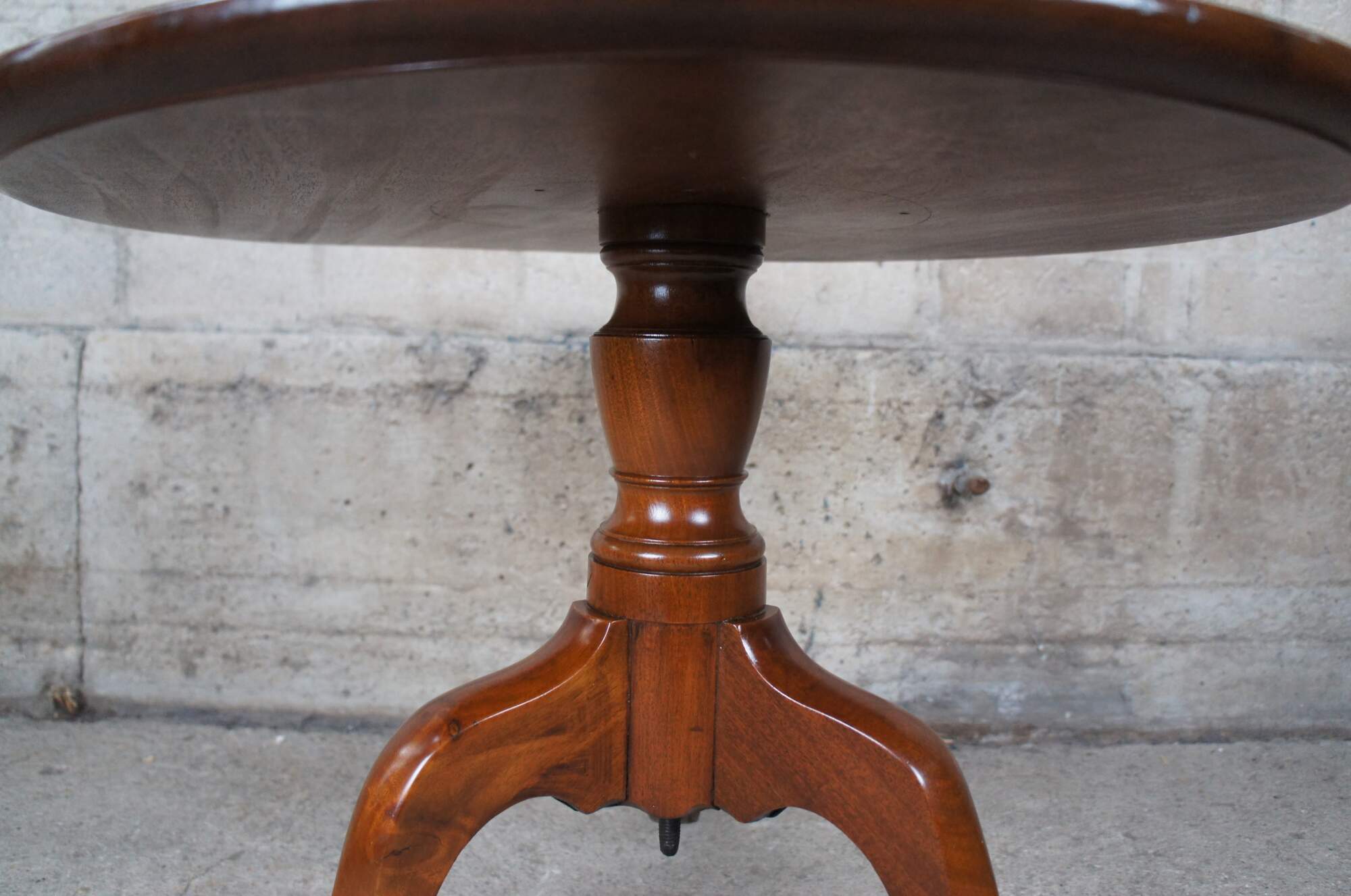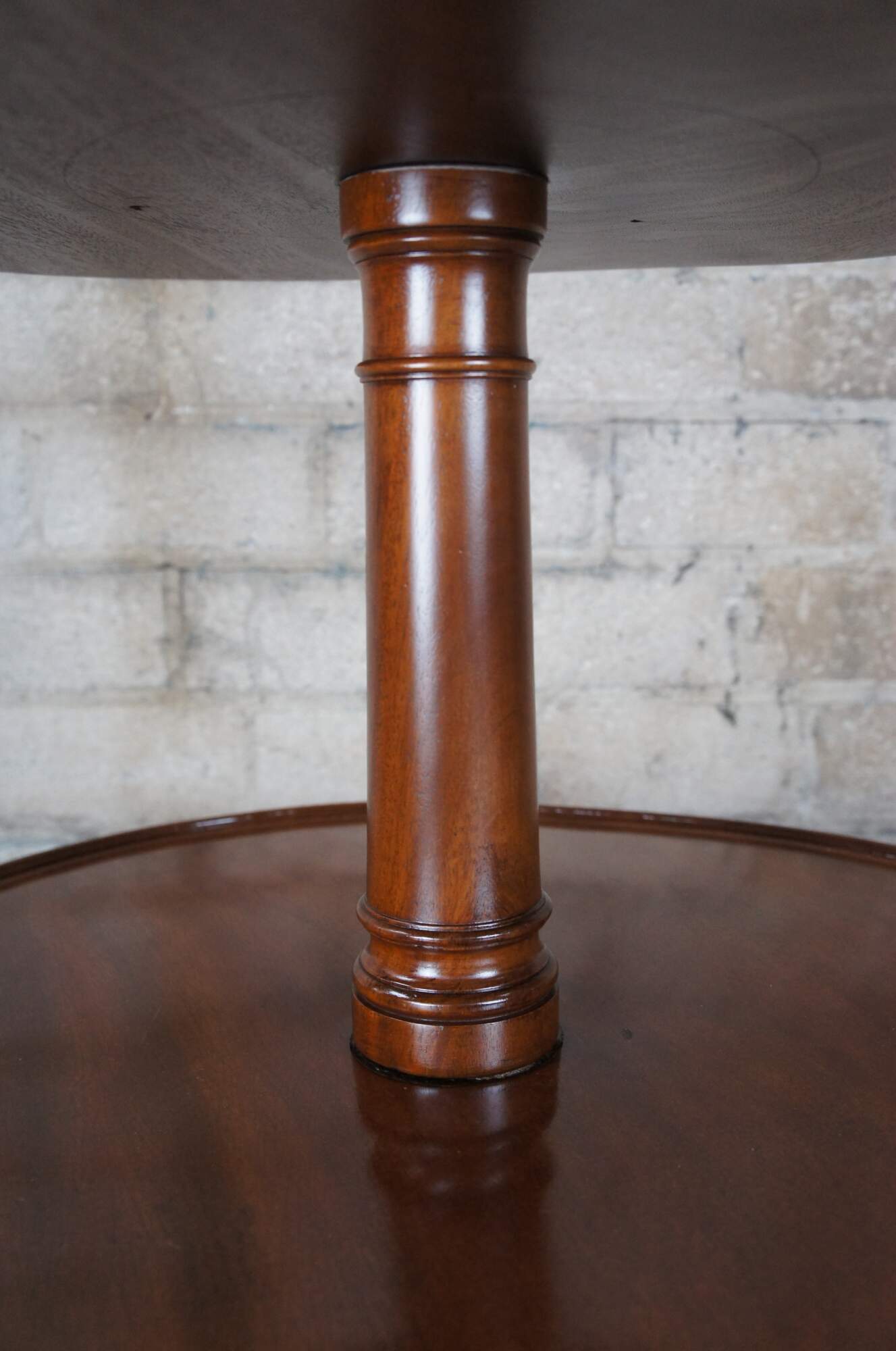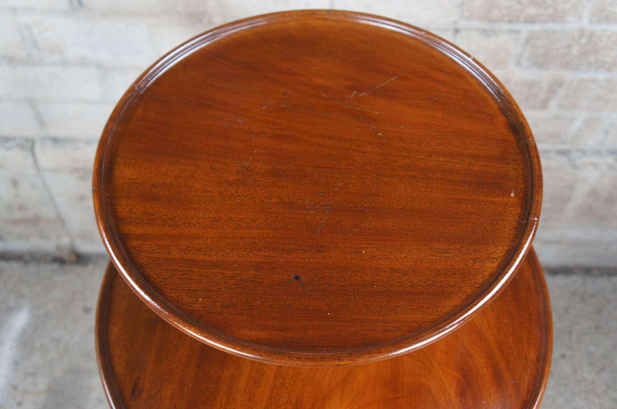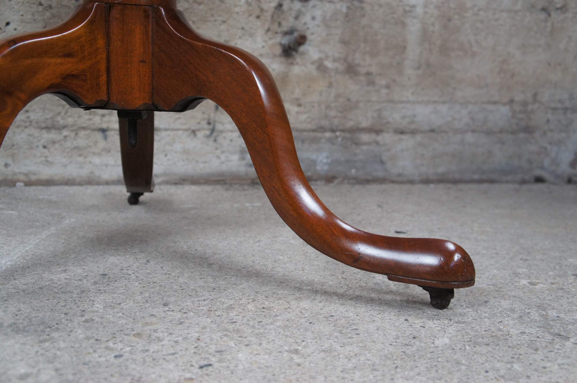 Antique 19th century three tiered dumbwaiter or butlers table. Made of mahogany featuring Queen Anne styling with a round tapered column and serpentine legs w slipper feet and castors.