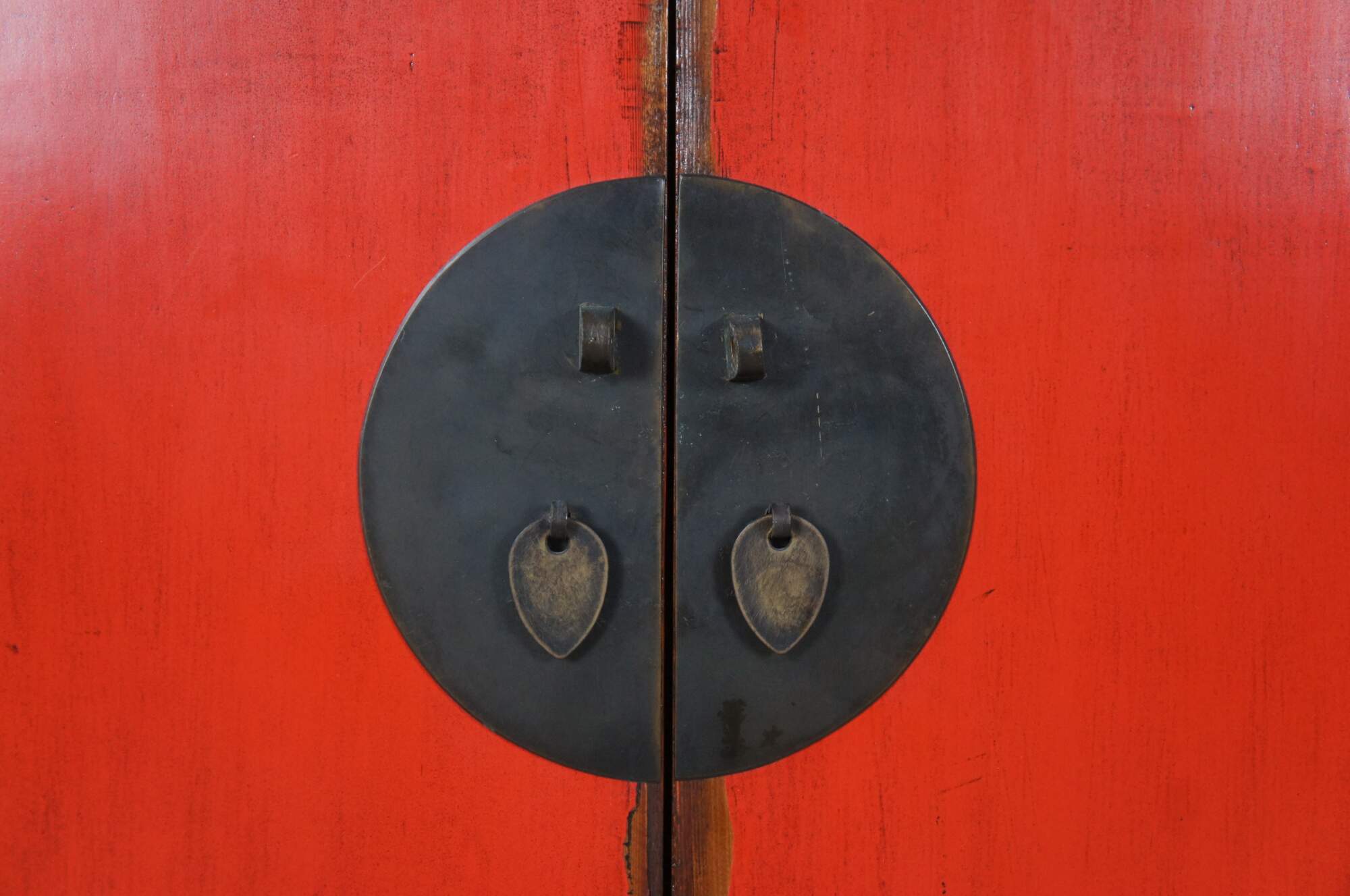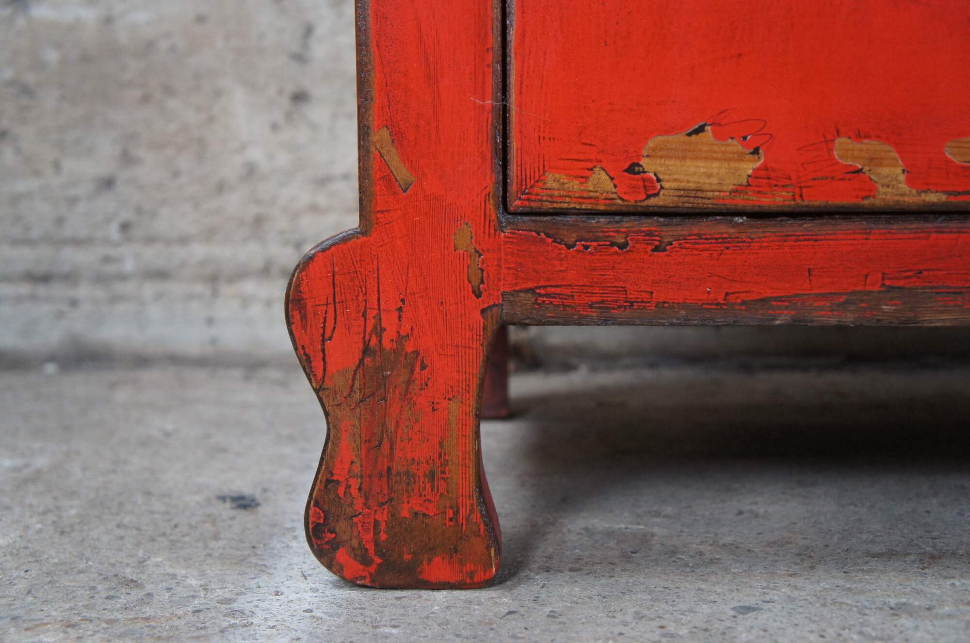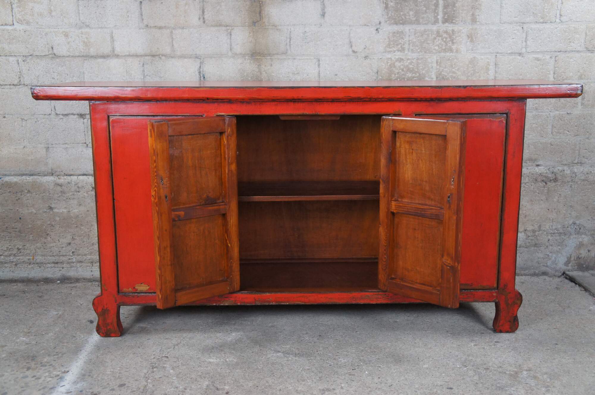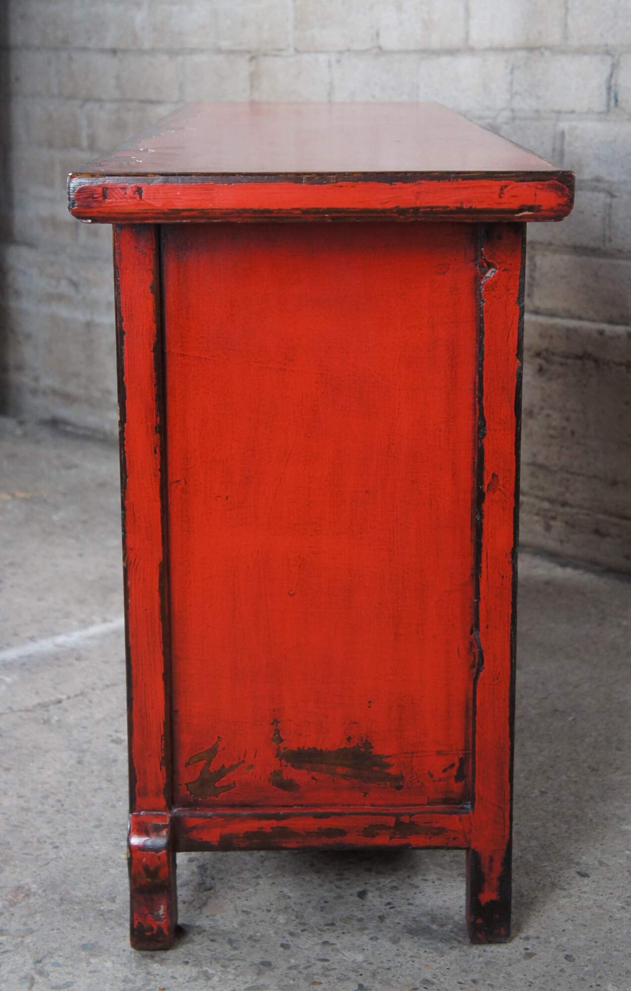 Chinese red lacquer console table, circa last quarter 20th century. A rectangular form made from elm with three cabinets for storage over traditional feet. Features brass moon hardware along the central drawer and tear drop pulls. The cabinet is finished in a vibrant naturally distressed red allowing the warming undertones of the wood to show through. Its versatile size makes it great for use in an living space.