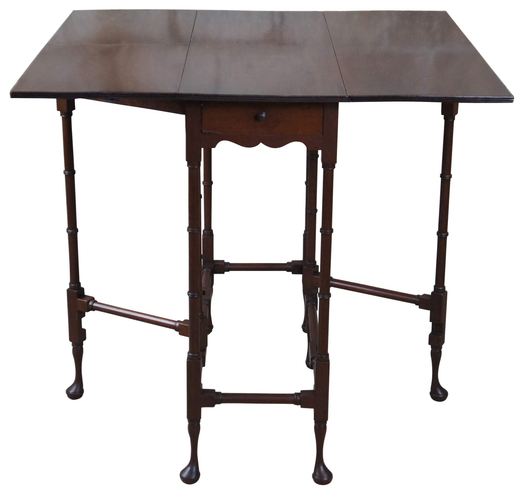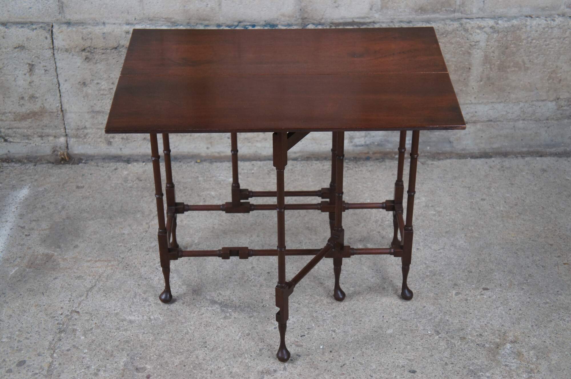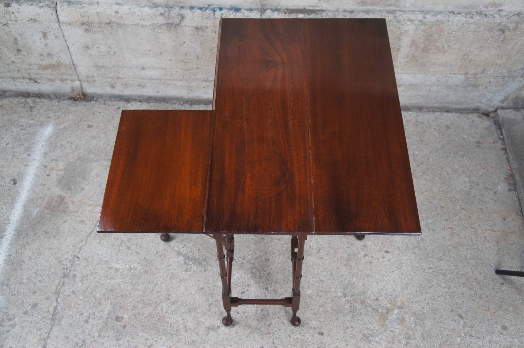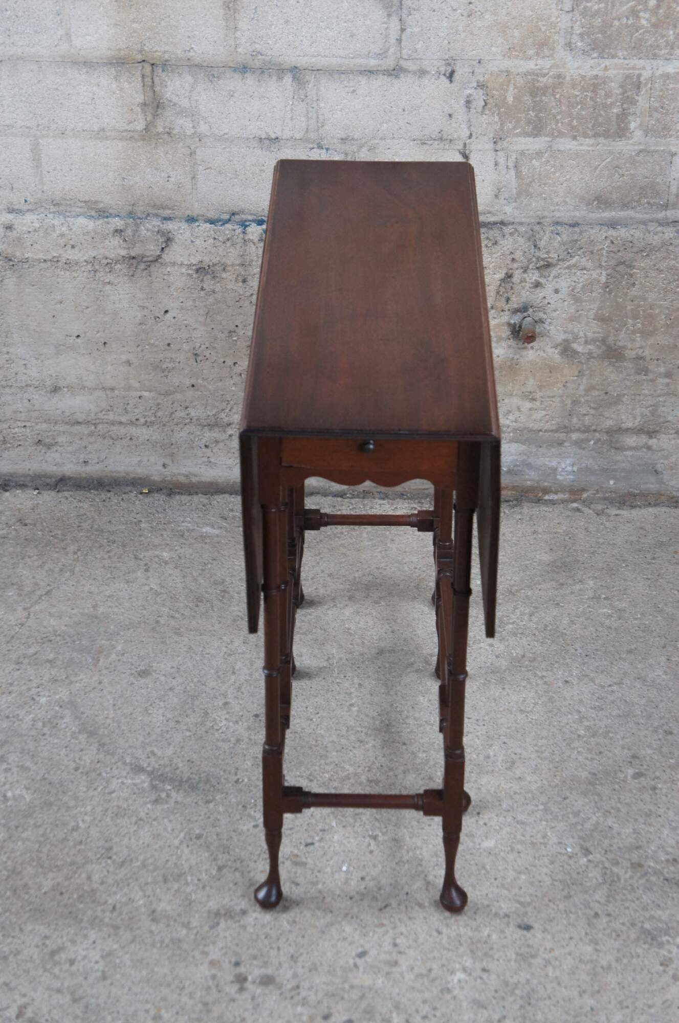 A classic and petite George III mahogany drop leaf side table from the legendary Chicago furniture maker, Quigley, circa 1940s. Features a long and slender form with central drawer, split drop leaf along one side and spider campaign style legs. Split leafs are a very rare find on dropleaf tables and allow for added versatility. Quigley Furniture Co. a maker of only custom furniture was the source of choice for designer Samuel Marx and architect David Adler, brother of Frances Elkins.