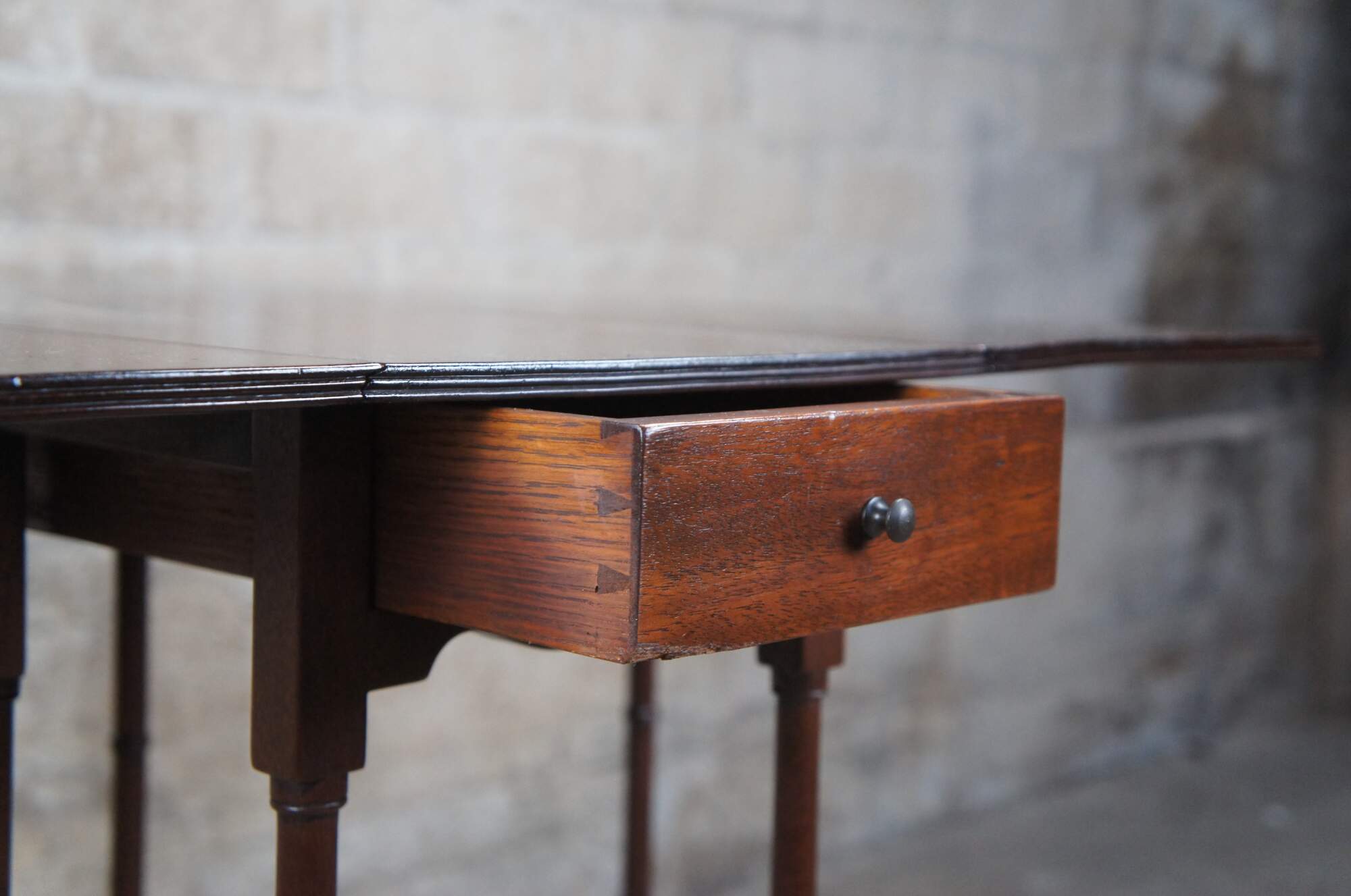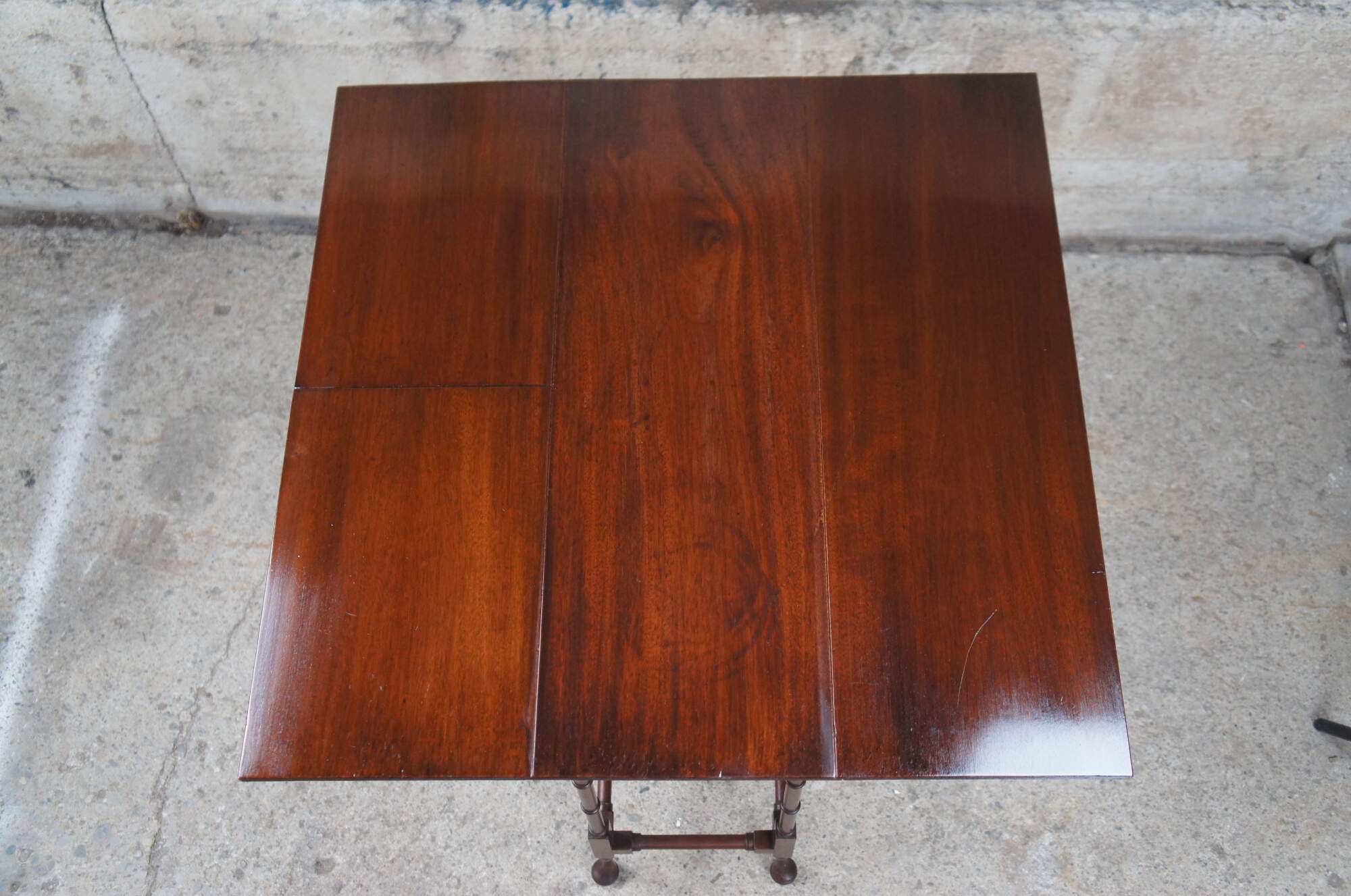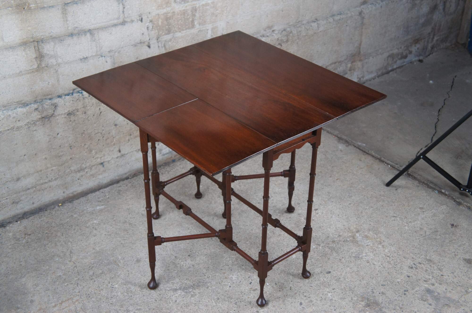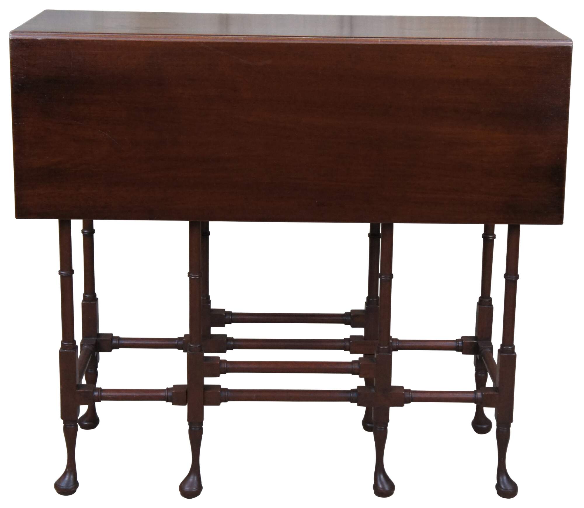 A classic and petite George III mahogany drop leaf side table from the legendary Chicago furniture maker, Quigley, circa 1940s. Features a long and slender form with central drawer, split drop leaf along one side and spider campaign style legs. Split leafs are a very rare find on dropleaf tables and allow for added versatility. Quigley Furniture Co. a maker of only custom furniture was the source of choice for designer Samuel Marx and architect David Adler, brother of Frances Elkins.