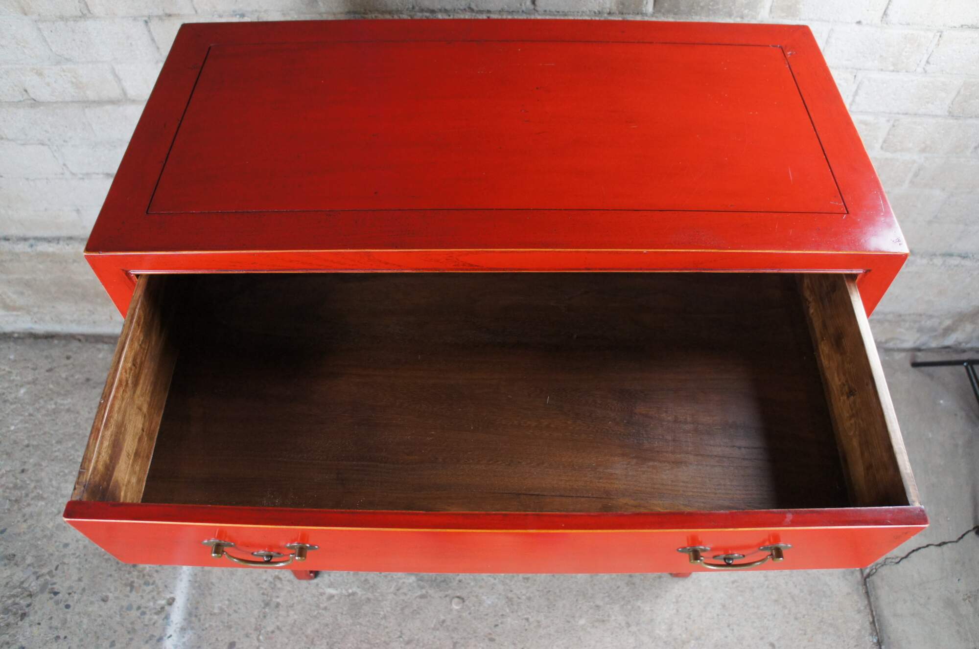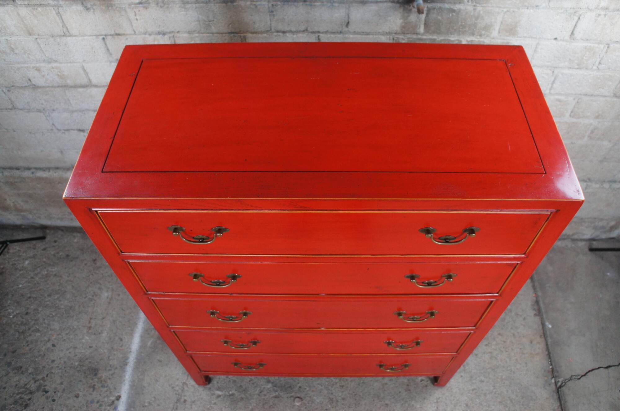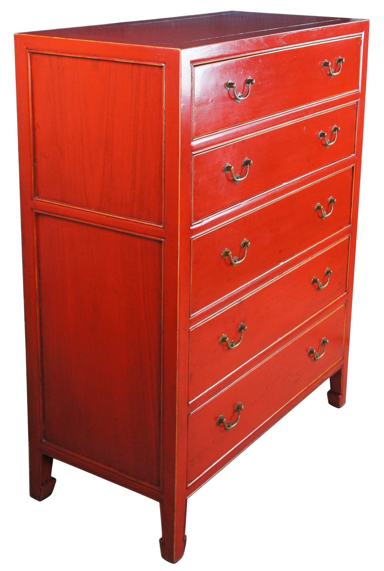 An impressive modern chinese red lacquer dresser, circa last half 20th century. Made from elm with classic Ming styling. Features 5 dovetailed drawers with brass bail hardware over tapered legs. With its vivid red color and natural wood undertones it would be a great addition to any traditional. mid century modern or contemporary home.