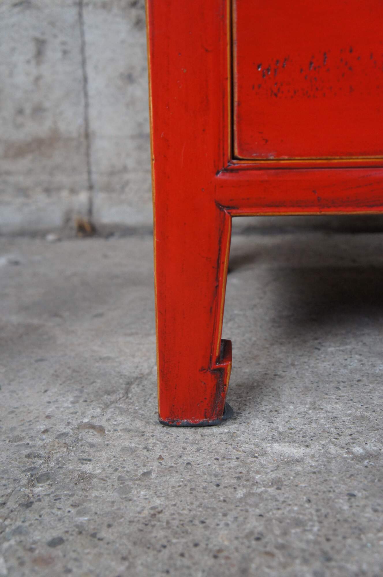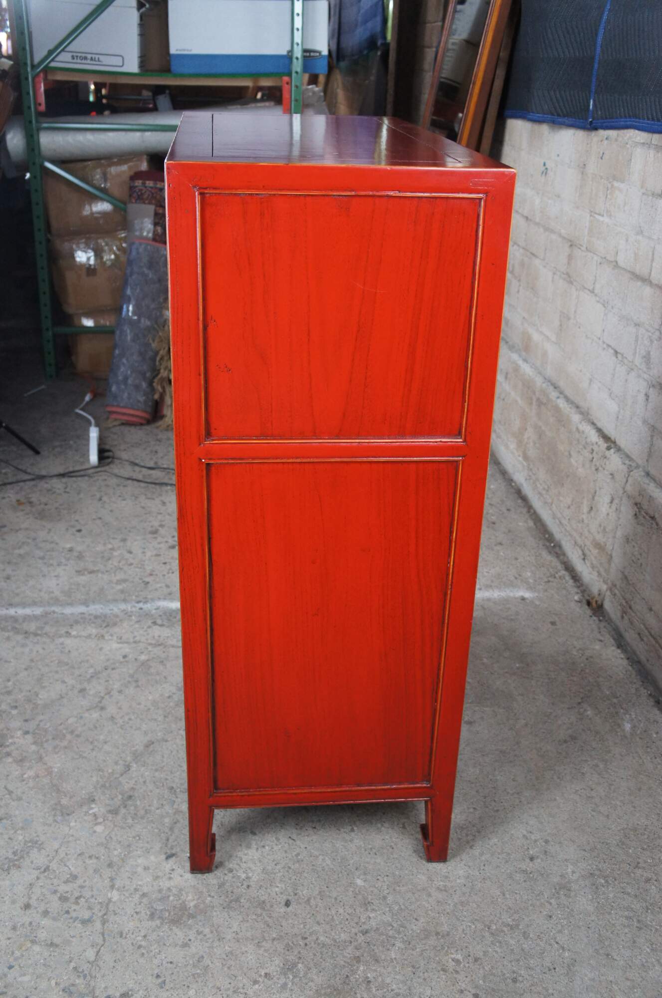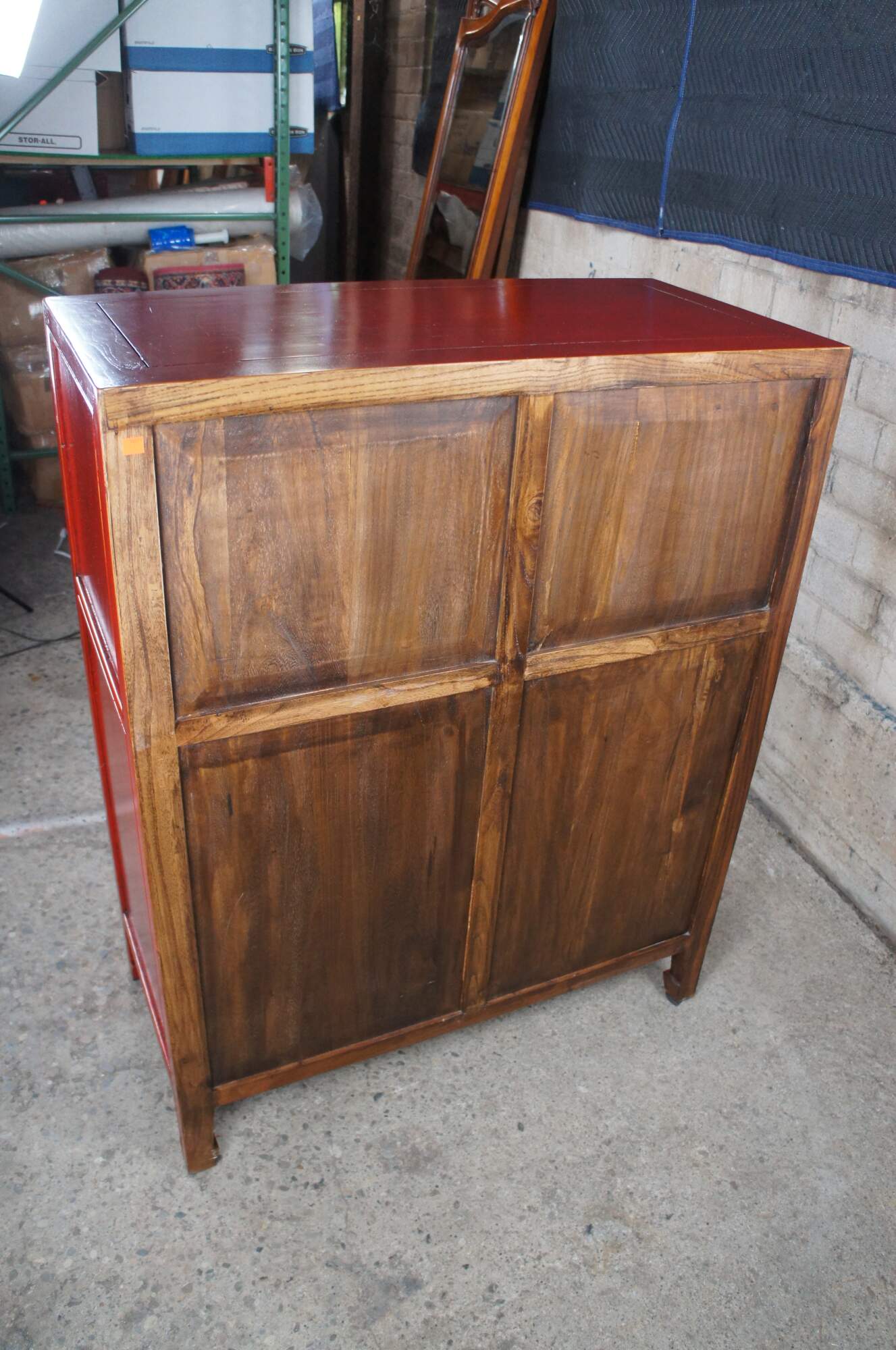 An impressive modern chinese red lacquer dresser, circa last half 20th century. Made from elm with classic Ming styling. Features 5 dovetailed drawers with brass bail hardware over tapered legs. With its vivid red color and natural wood undertones it would be a great addition to any traditional. mid century modern or contemporary home.