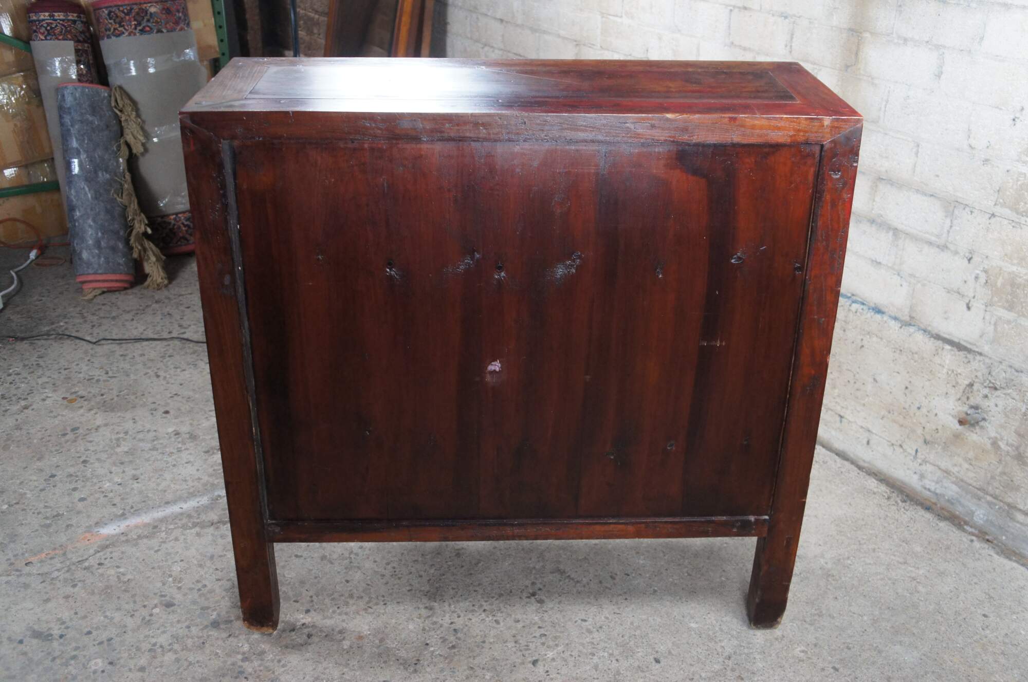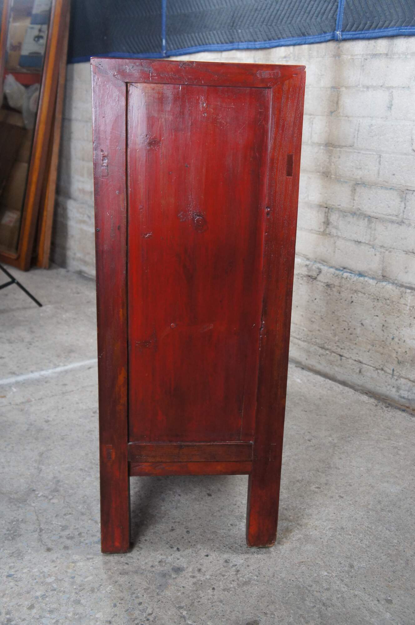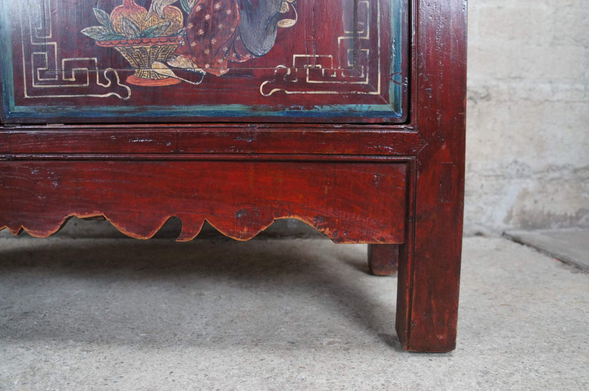 Impressive antique red lacquer Qing Dynasty cabinet. A rectangular form made from elm with mortise and tenon construction and lower serpentine carved apron. Features two dovetailed drawers over lower cabinet with shelf. Each cabinet drawer and door is trimmed in a blue surround. The drawers feature a beautiful hand painted floral motif that nicely compliments the lower greek key design and figural motif along the cabinet doors. The scene features four children dressed in robes facing inwards offering up pomegrantes. The pomegranate is considered a symbol of fertility and therefore it is often represented with children. Buddha is also often depicted holding a pomegranate, a peach and a citron, the three fruits suggesting abundance of sons, years and happiness, respectively.