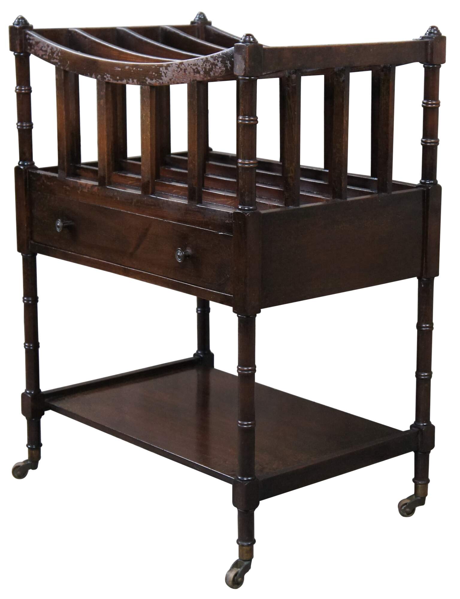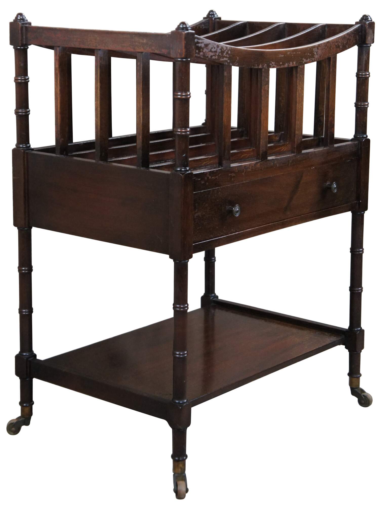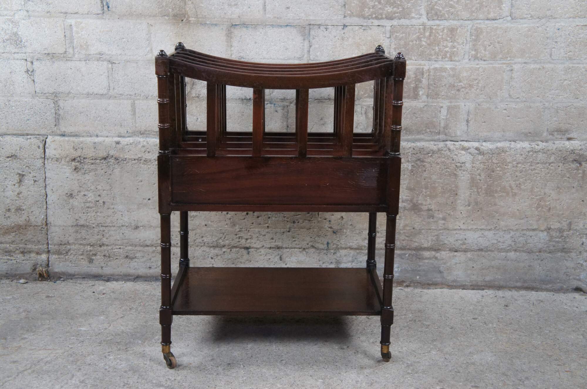 Circa 1940s English Regency/ Campaign style magazine rack. An unsual form with extended legs allowing for a more comfortable height with a lower shelf. Made from mahogany with bentwood divisions allowing for four nice sized sections. The stand is supported by bamboo shaped supports with a central dovetailed drawer and brass capped feet and casters.