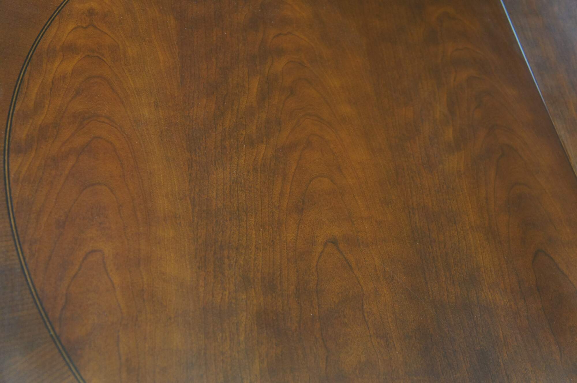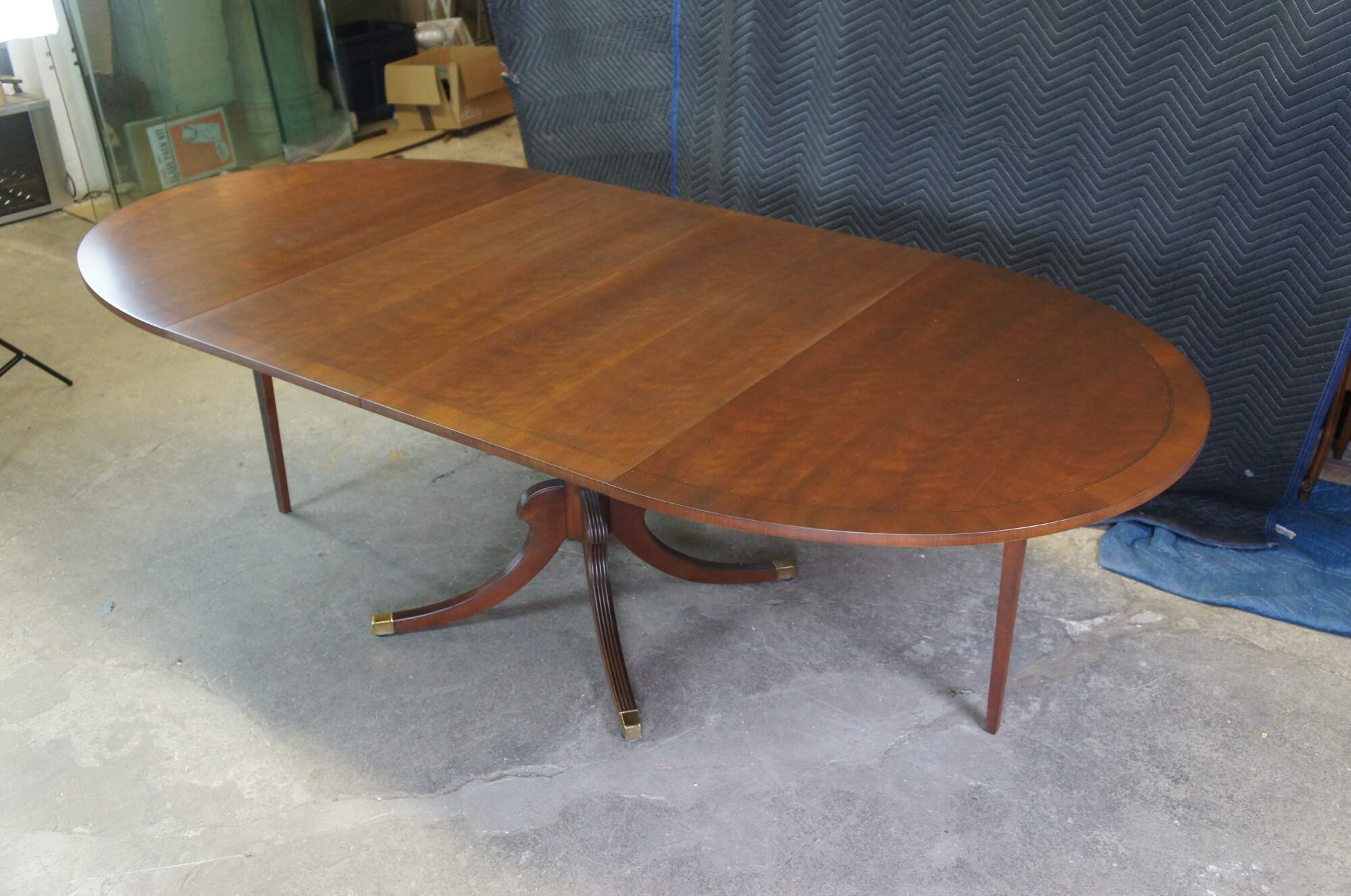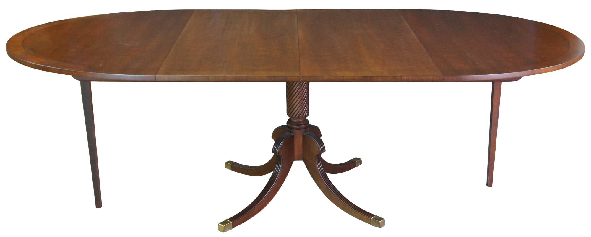 A beautiful extendable Regency dining table by Baker Furniture, circa last quarter 20th century. An oval form made from mahogany with banding along the edge, supported by a barley twist column leading to a four legged tripod base with brass capped feet. When opened the table is supported by extendable square tapered legs that hinge down from the top. Includes table pads.