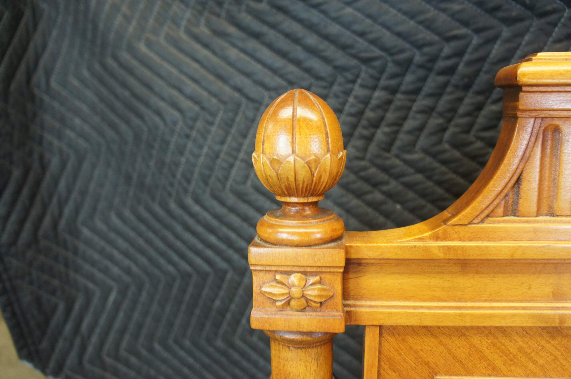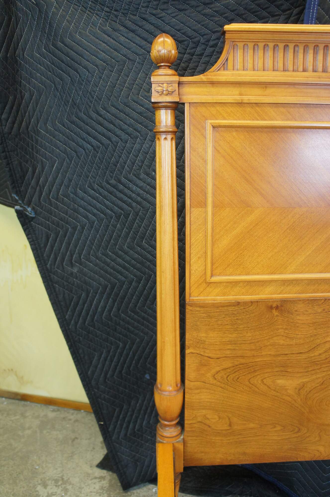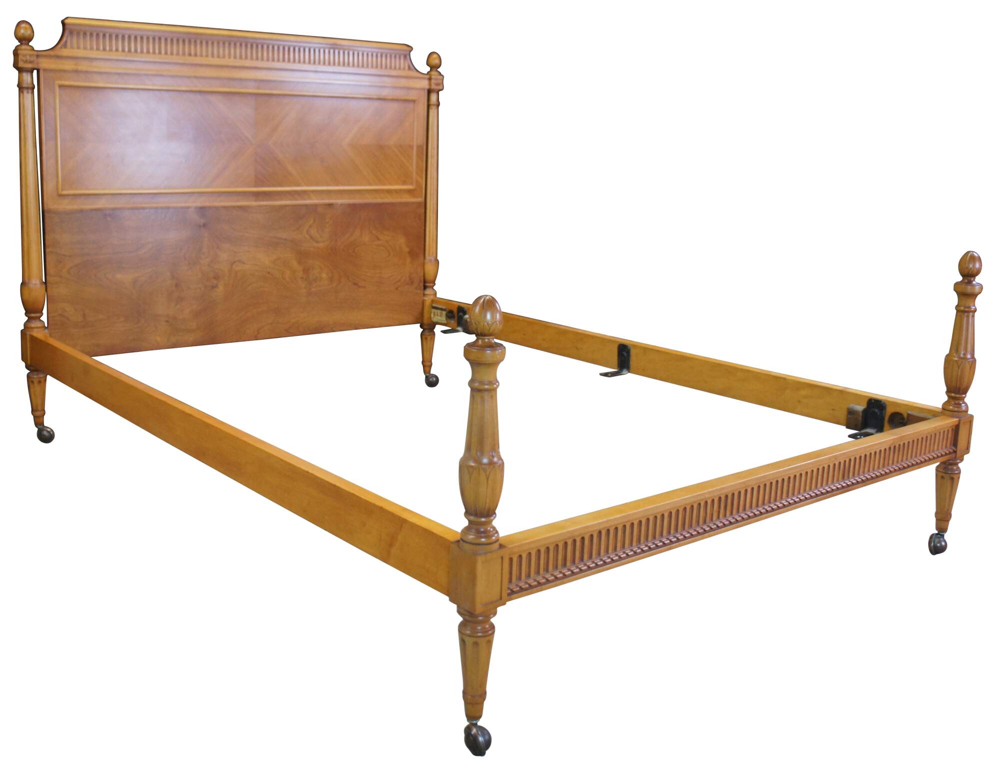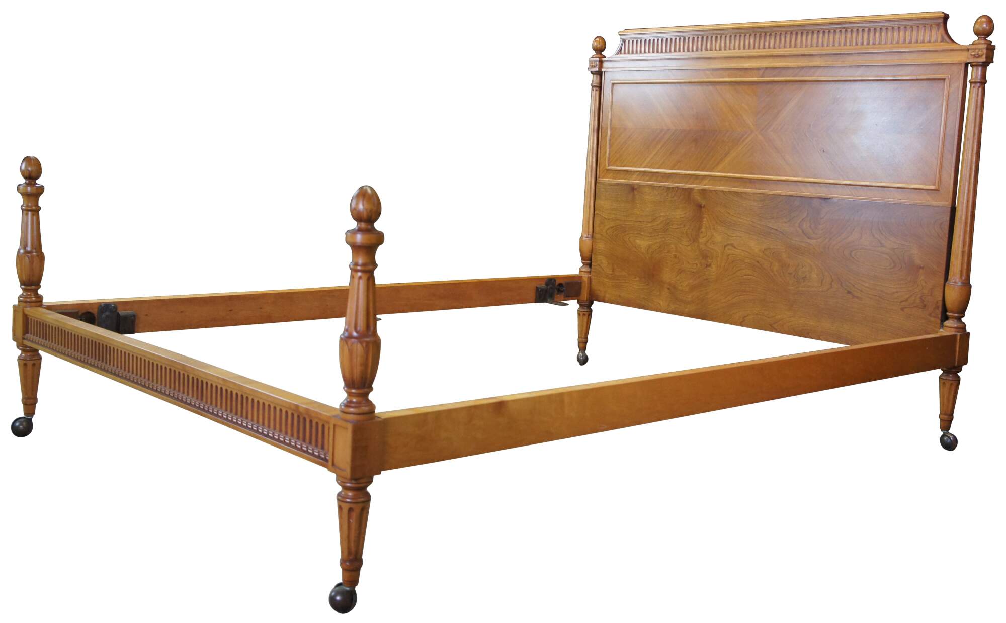 An exquisite antique French Louis XVI Neoclassical bed frame by Robert W. Irwin Furniture Company. Circa 1928-1940. Crafted from satinwood featuring turned and fluted columns, artichoke finials, fluted head and footboard and turned tapered feet leading to (removable) casters. The headboard has an eye catching matchbook veneer design fitted with rectangular molding.