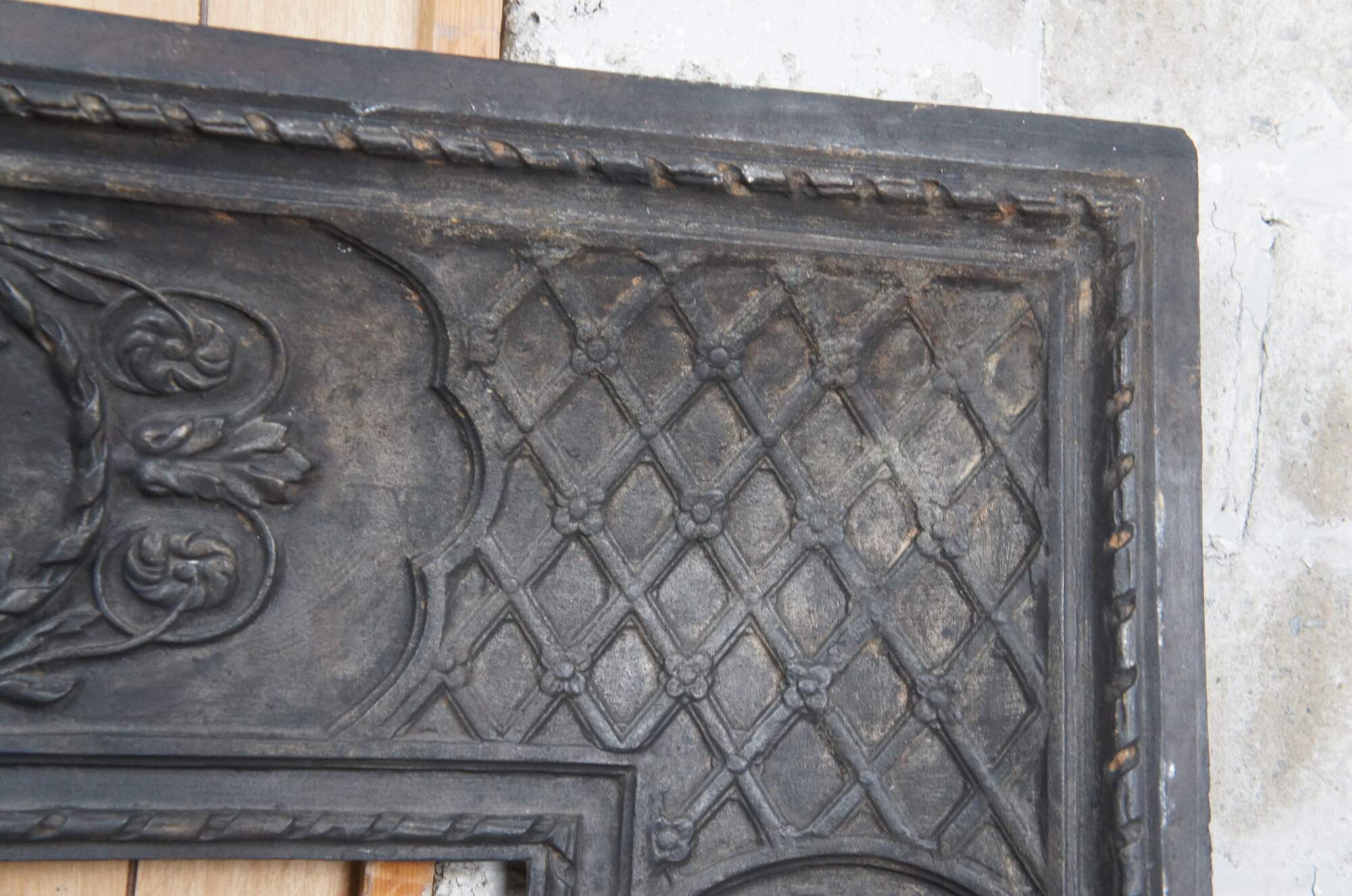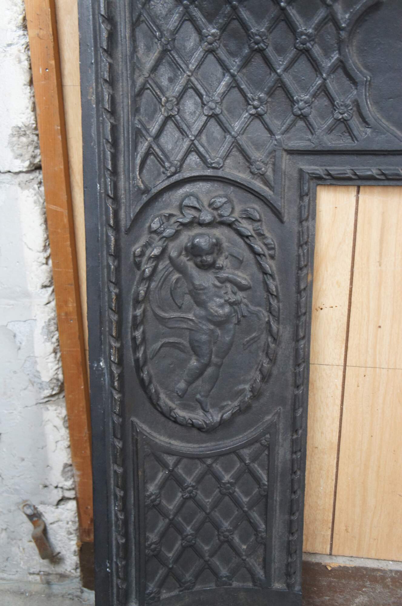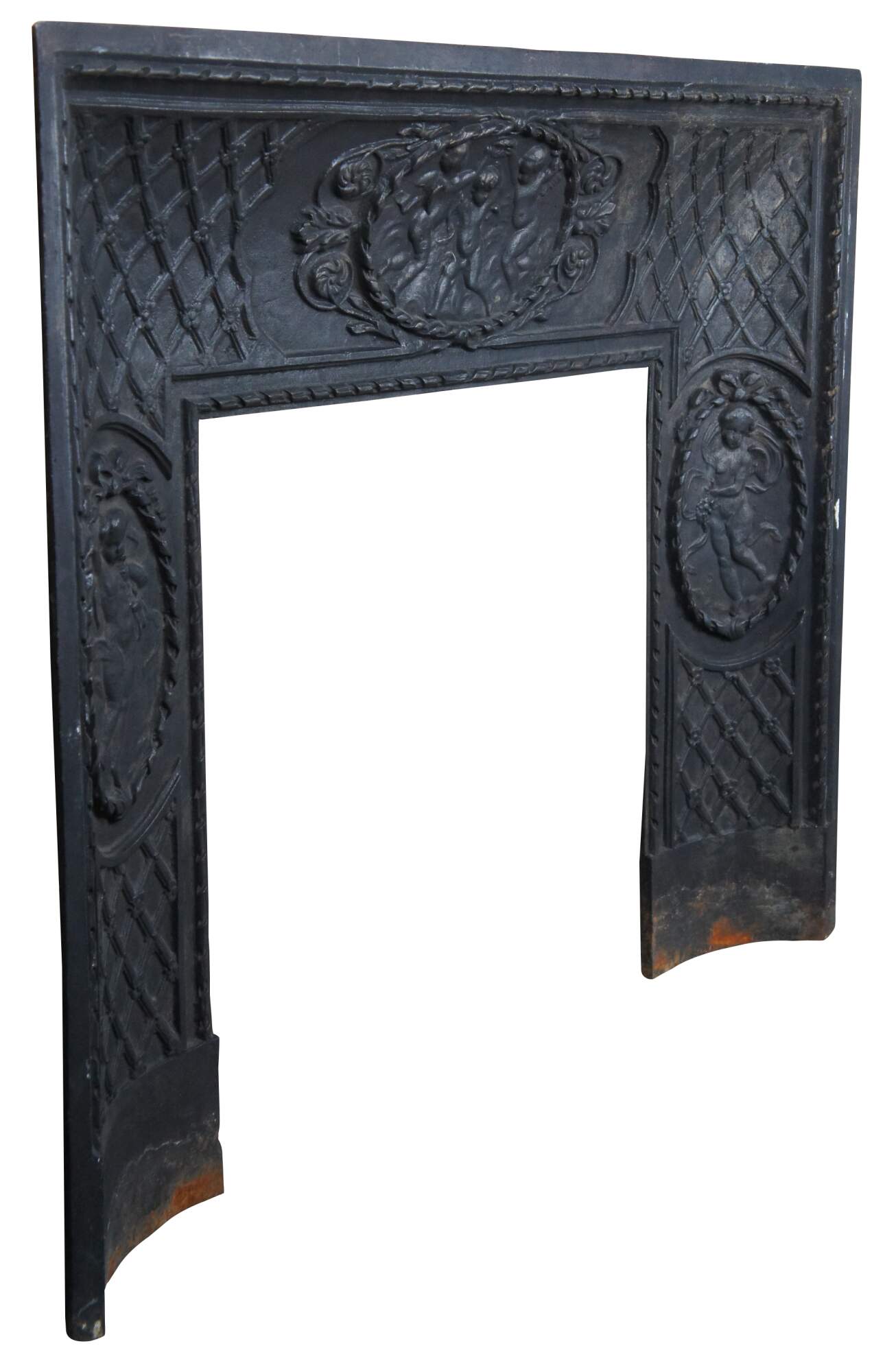 A rare and impressive mid 19th century French cast iron fireplace insert or surround. A concave form with meticulous detail. Features three cherubs scenes, each set within a neoclassical oval ribboned frame. The beautiful scenes are offset by a field of lattice work with flowers at each link. The insert is framed along the inner and outer edge by a ribboned or rope trim. A gorgeous insert that will become a conversation piece in any setting. Marked along the backside Courtll